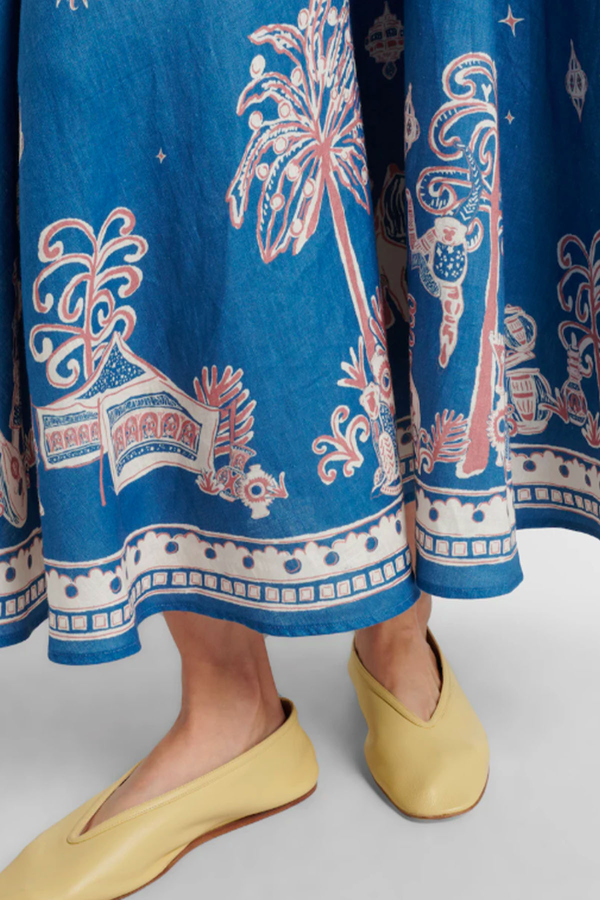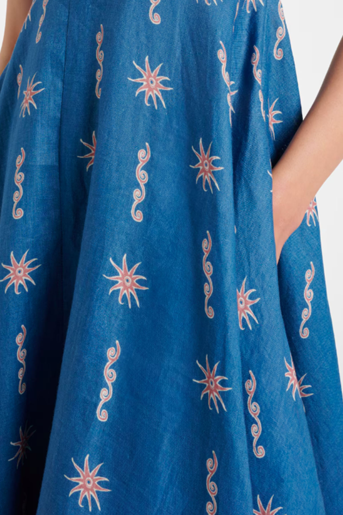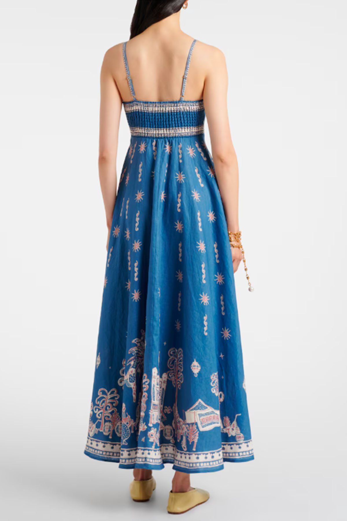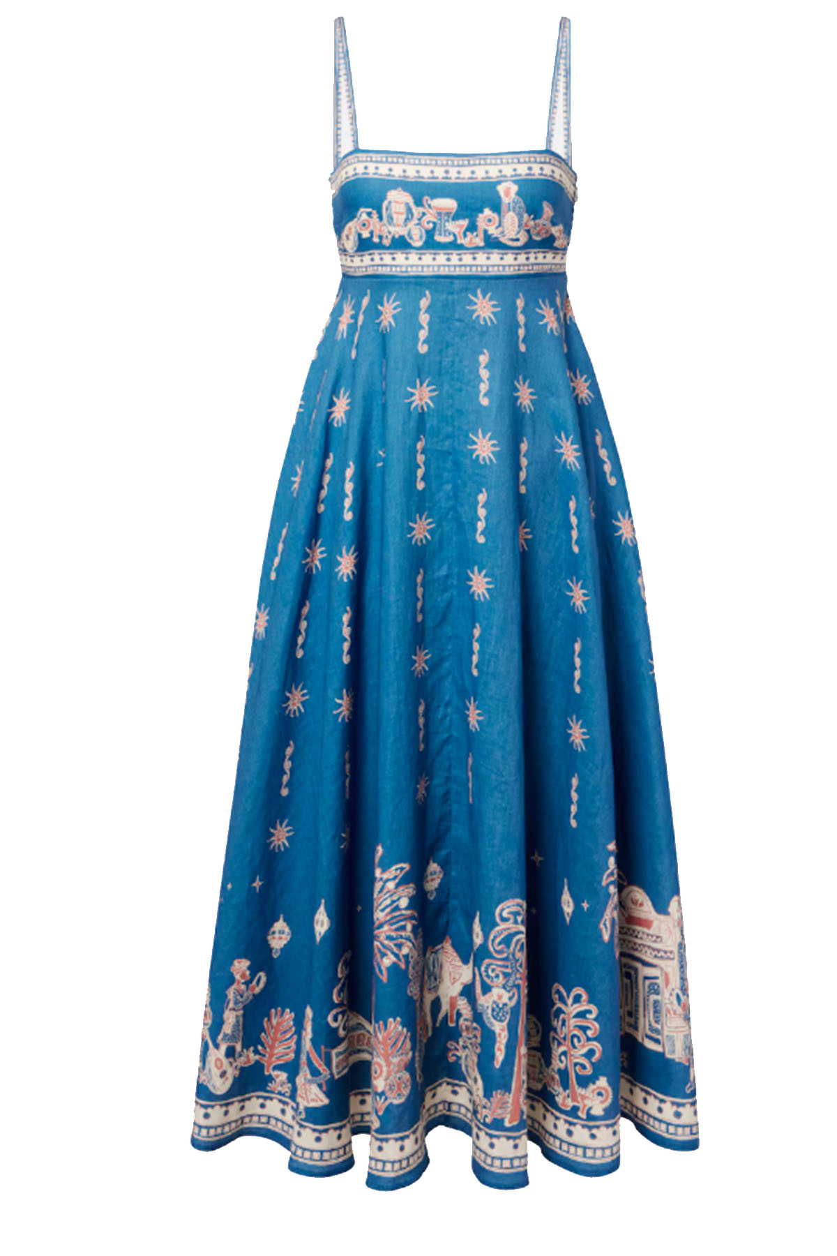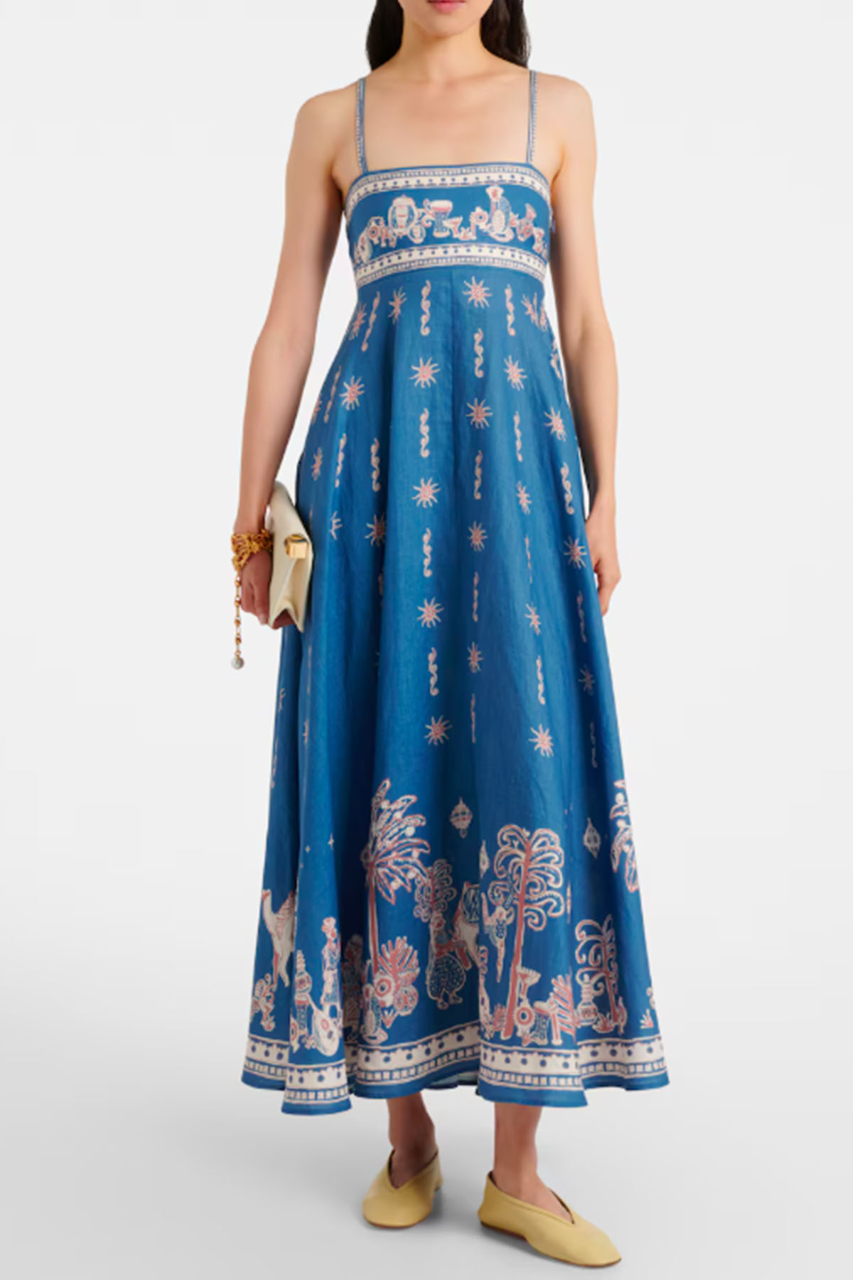 Featuring adjustable spaghetti straps, a hidden side zip closure, a gathered back panel, hidden side pockets, and an ankle-length design.