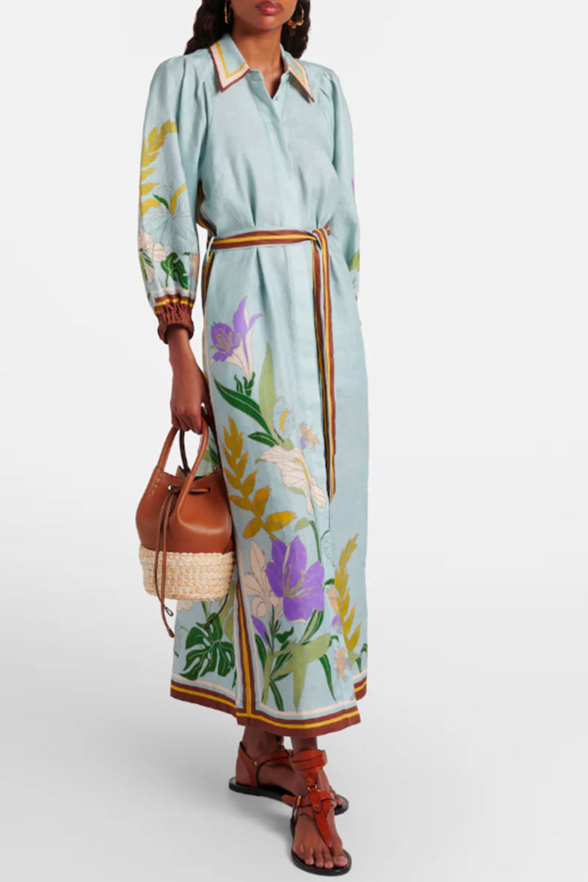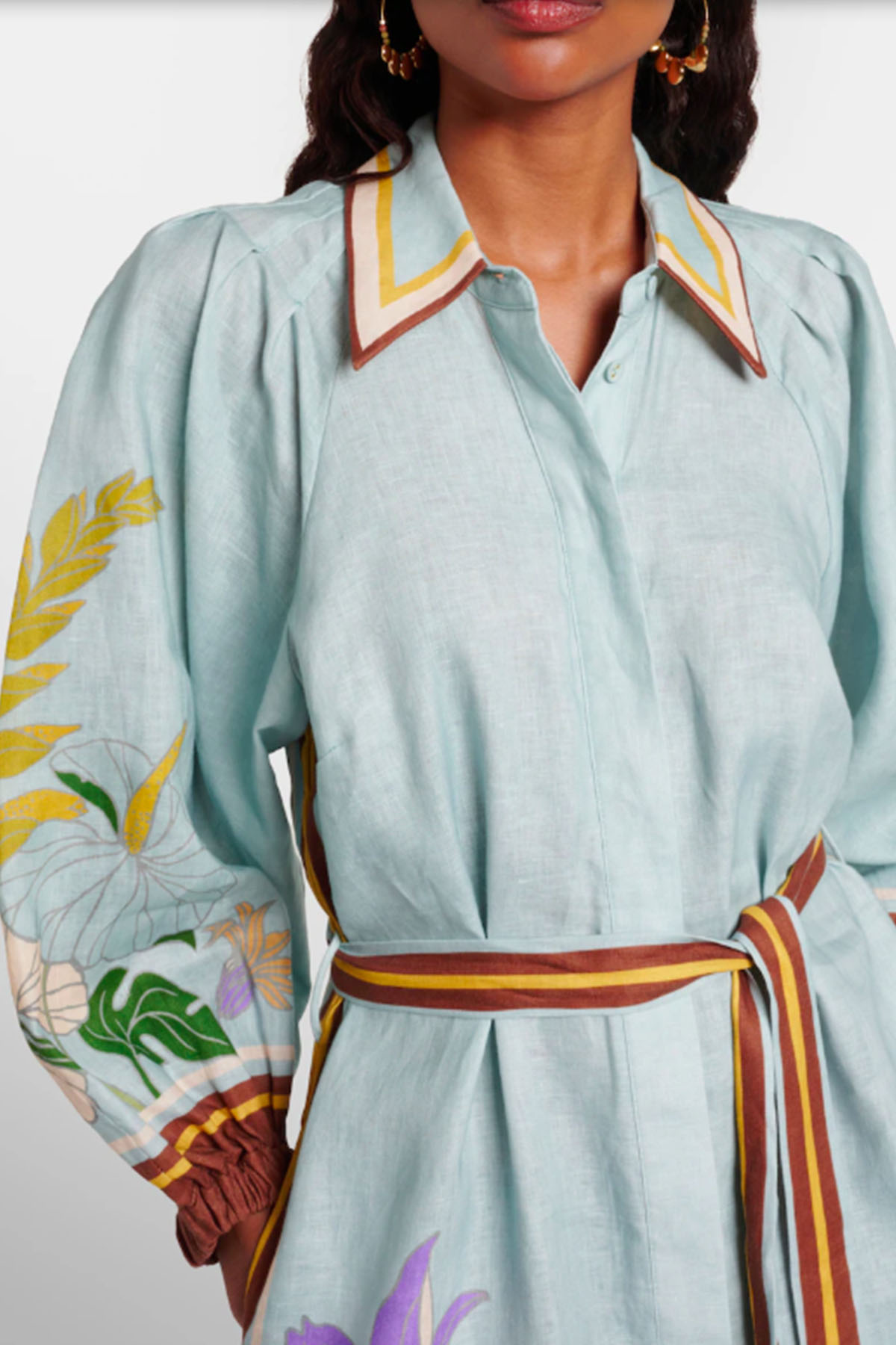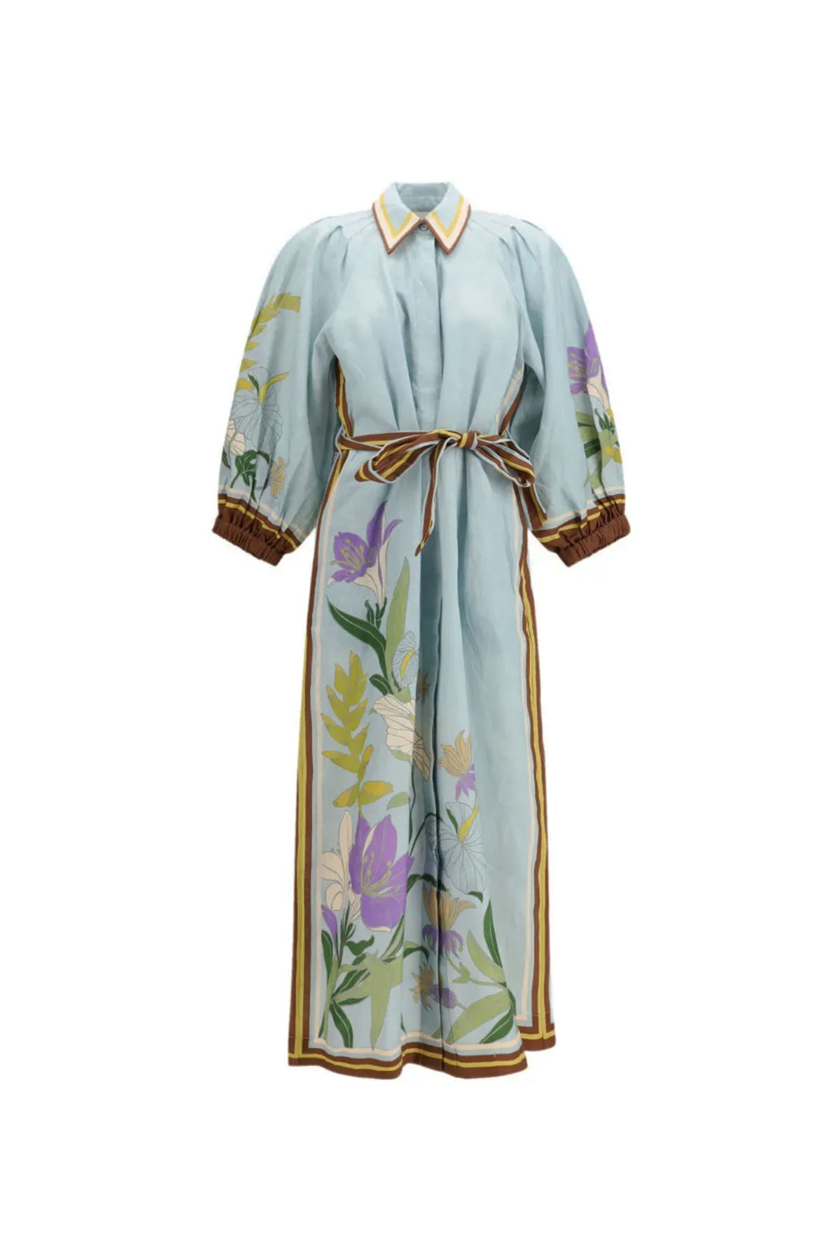 Relaxed midi shirt dress, Pointed collar with band, Concealed placket with covered buttons, Short raglan sleeves with shoulder pleats and elasticated cuffs, Removable fabric belt, Waistband with belt loops, Side pockets, Ankle length.