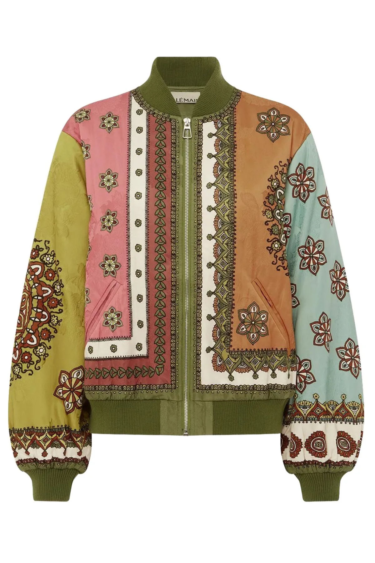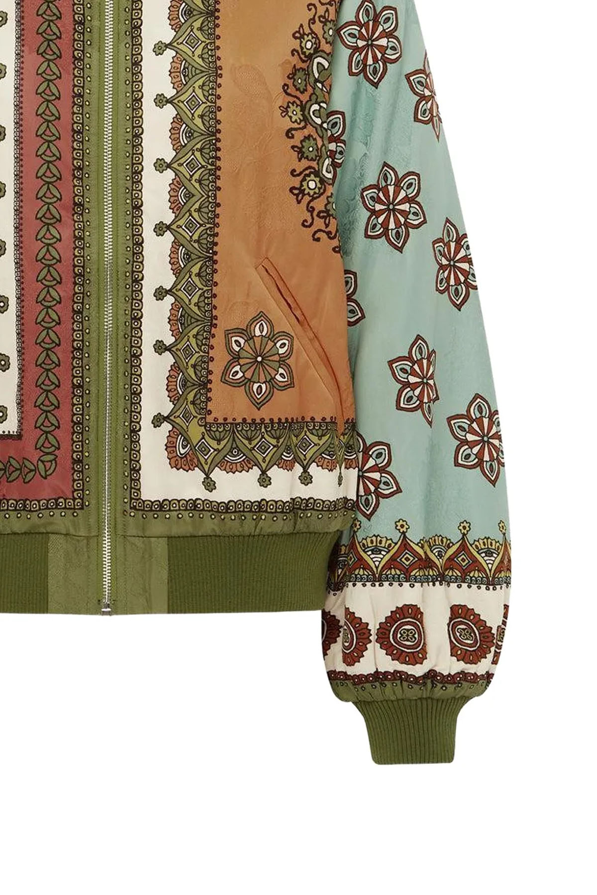 Relaxed-fit bomber jacket with internal padding, ribbed collar, cuffs, and hem, puff sleeves, center-front metal zip closure, and front welt pockets. Fully lined.