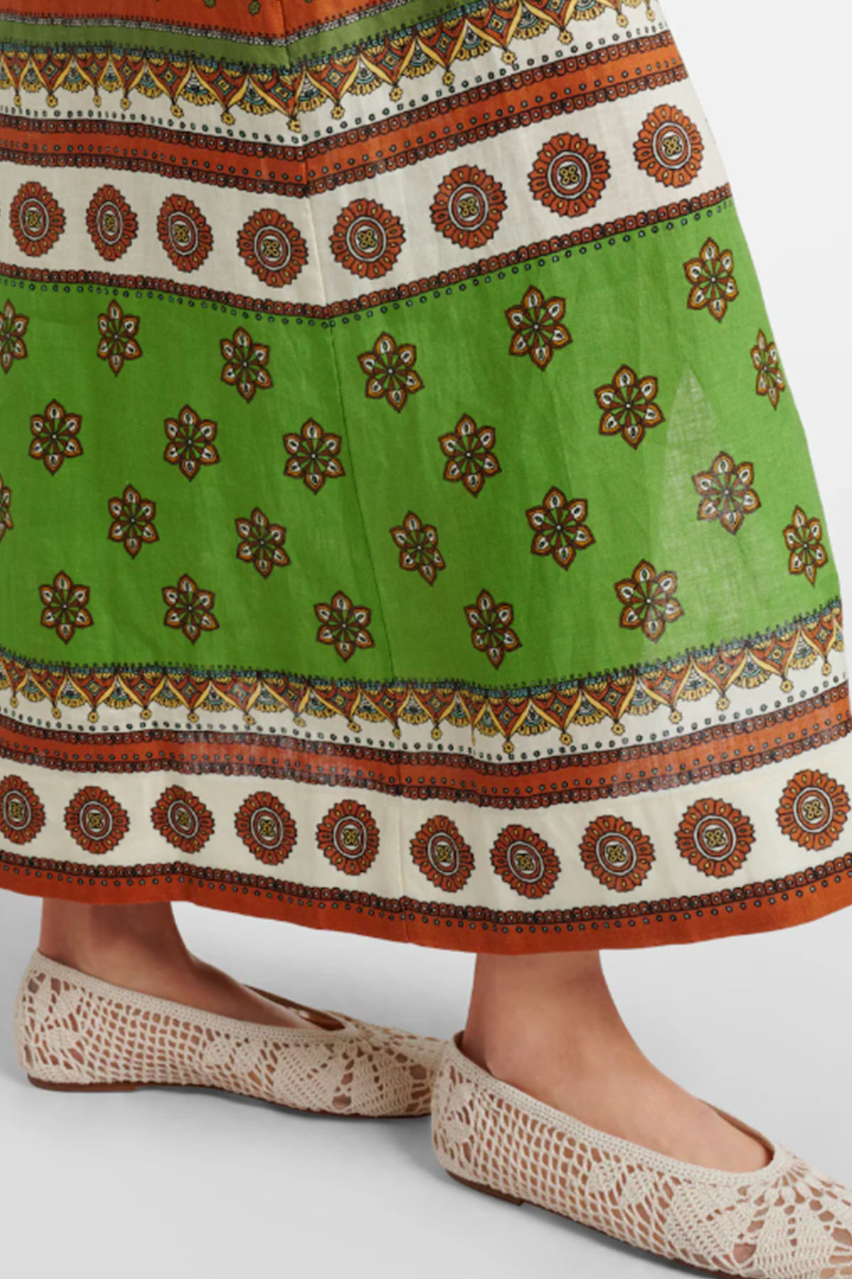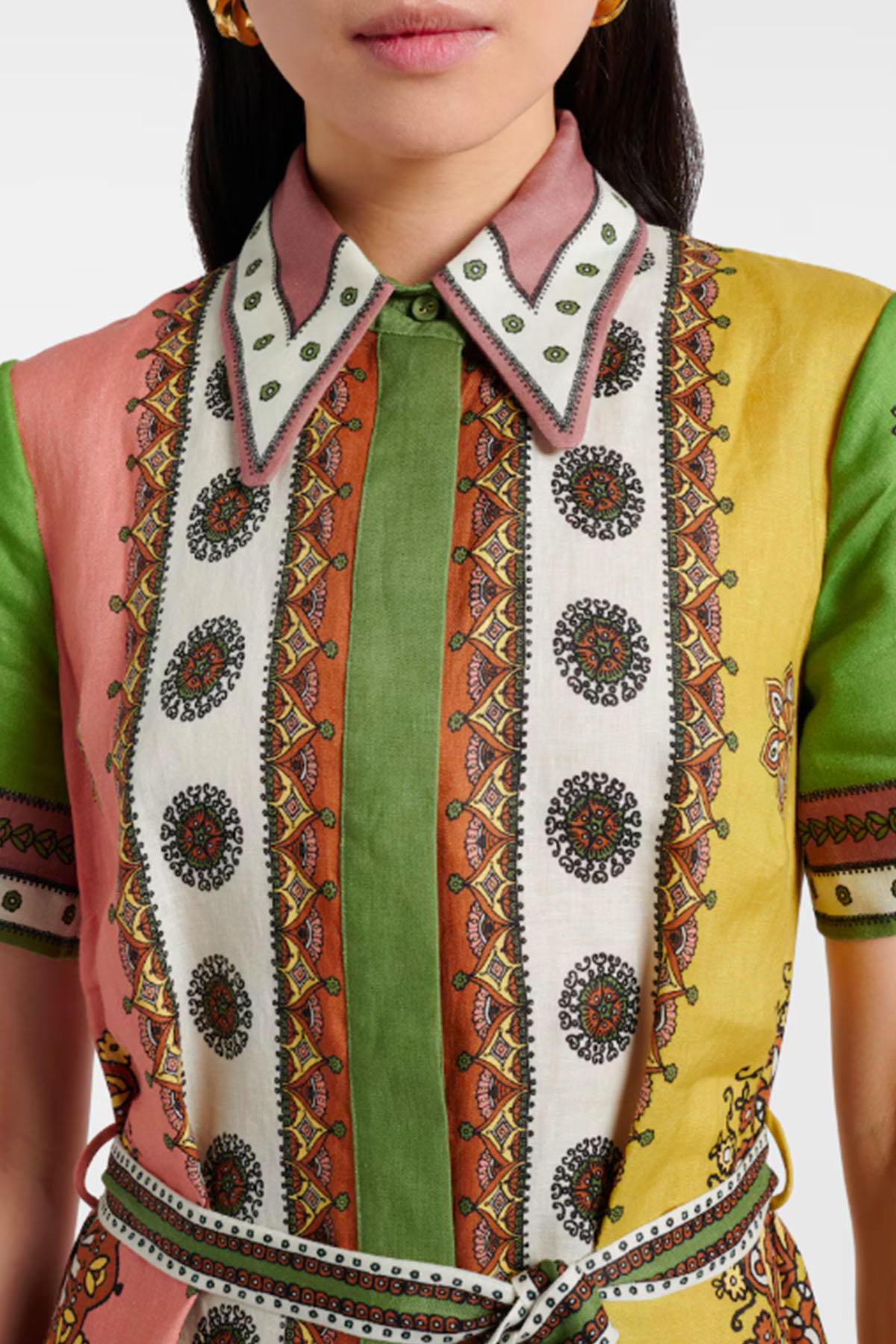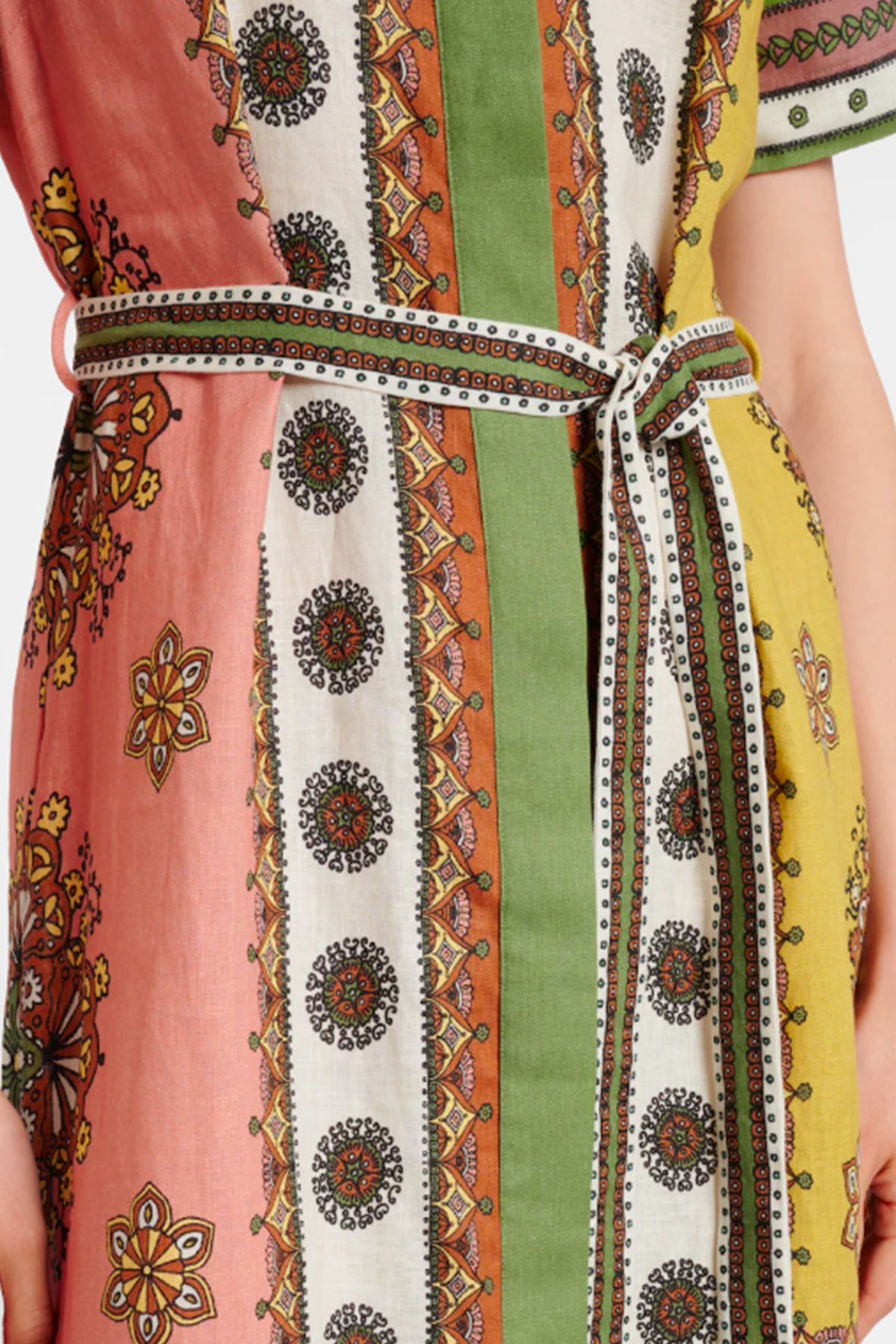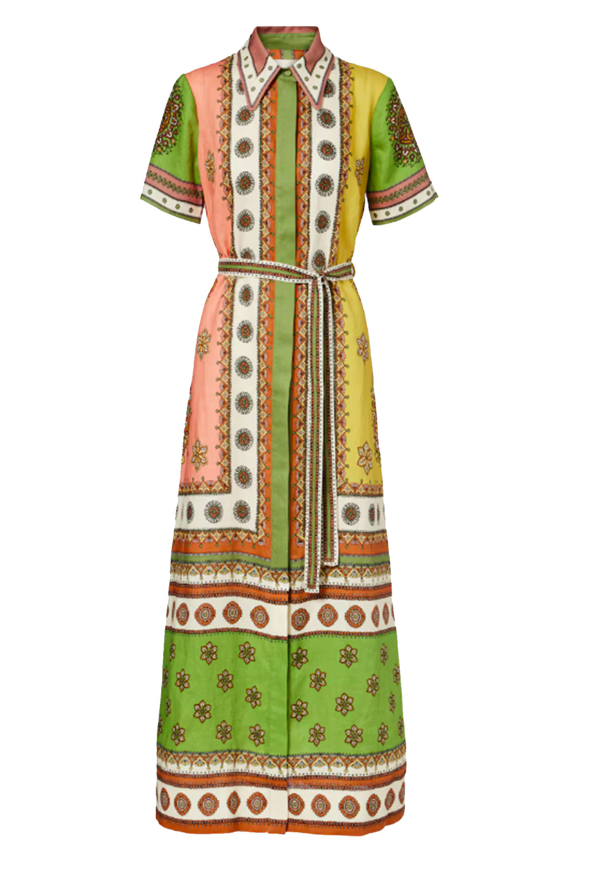 Shirtdress style, collar, short sleeves, concealed front placket with covered buttons, waistband with belt loops and adjustable, removable belt, ankle length.