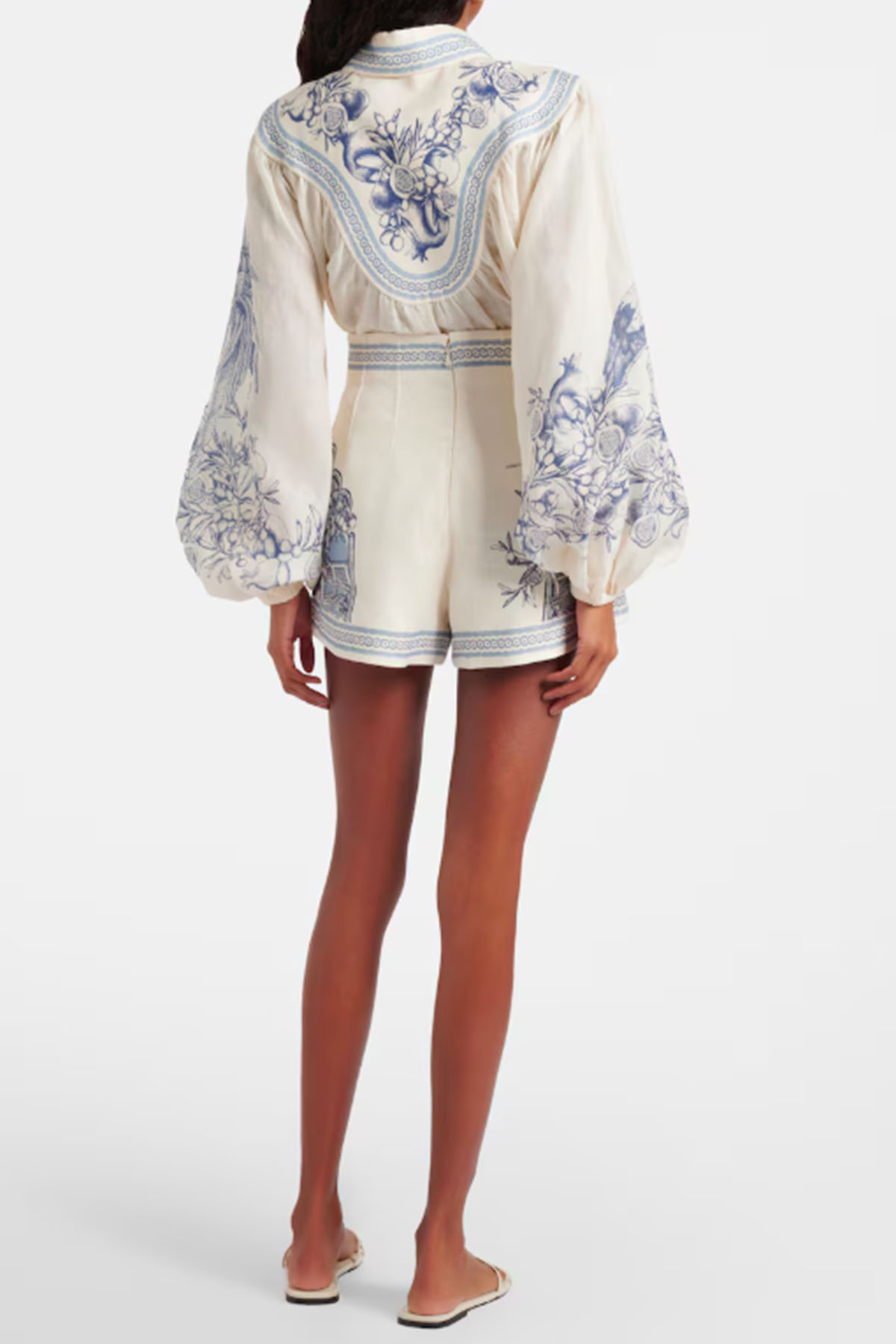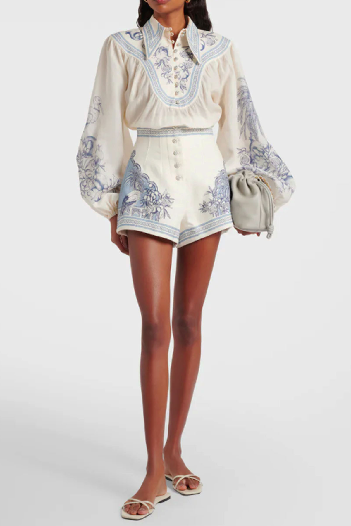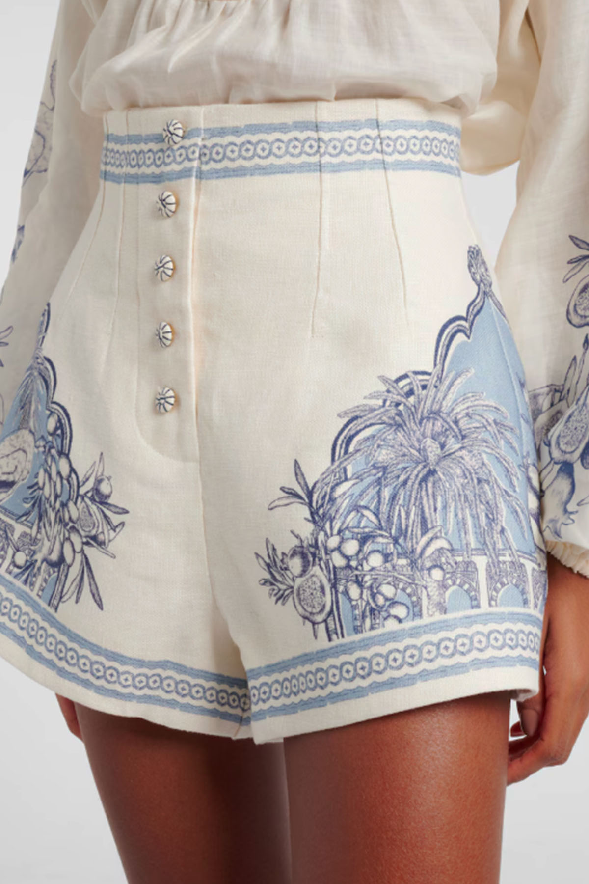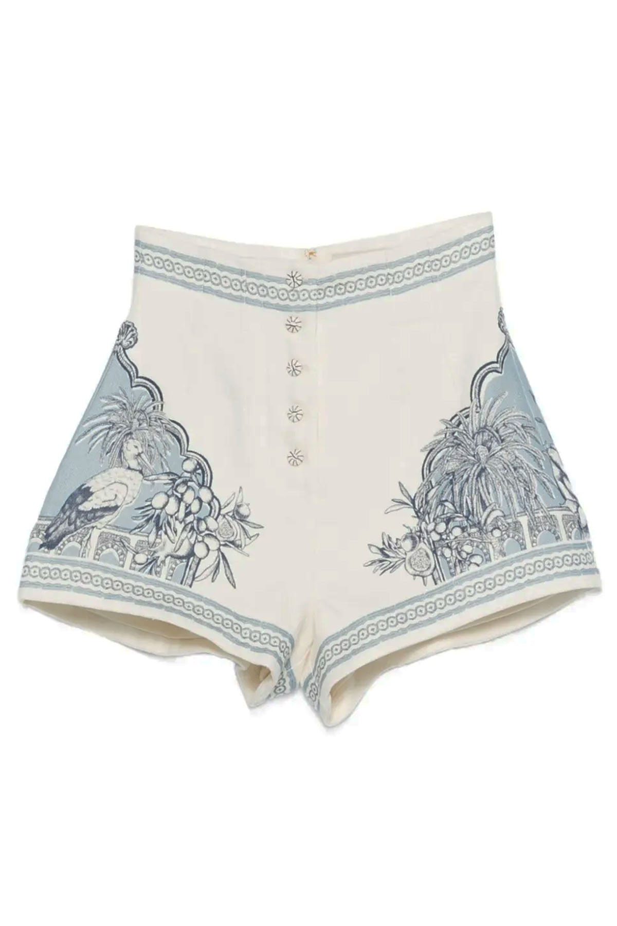 High-waisted, raffia buttons, in-seam pockets, and a front zip closure.