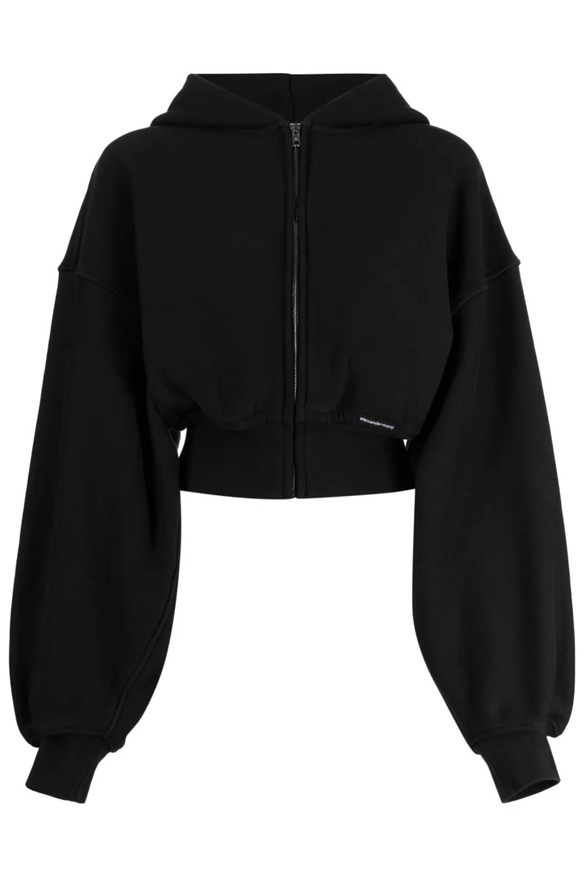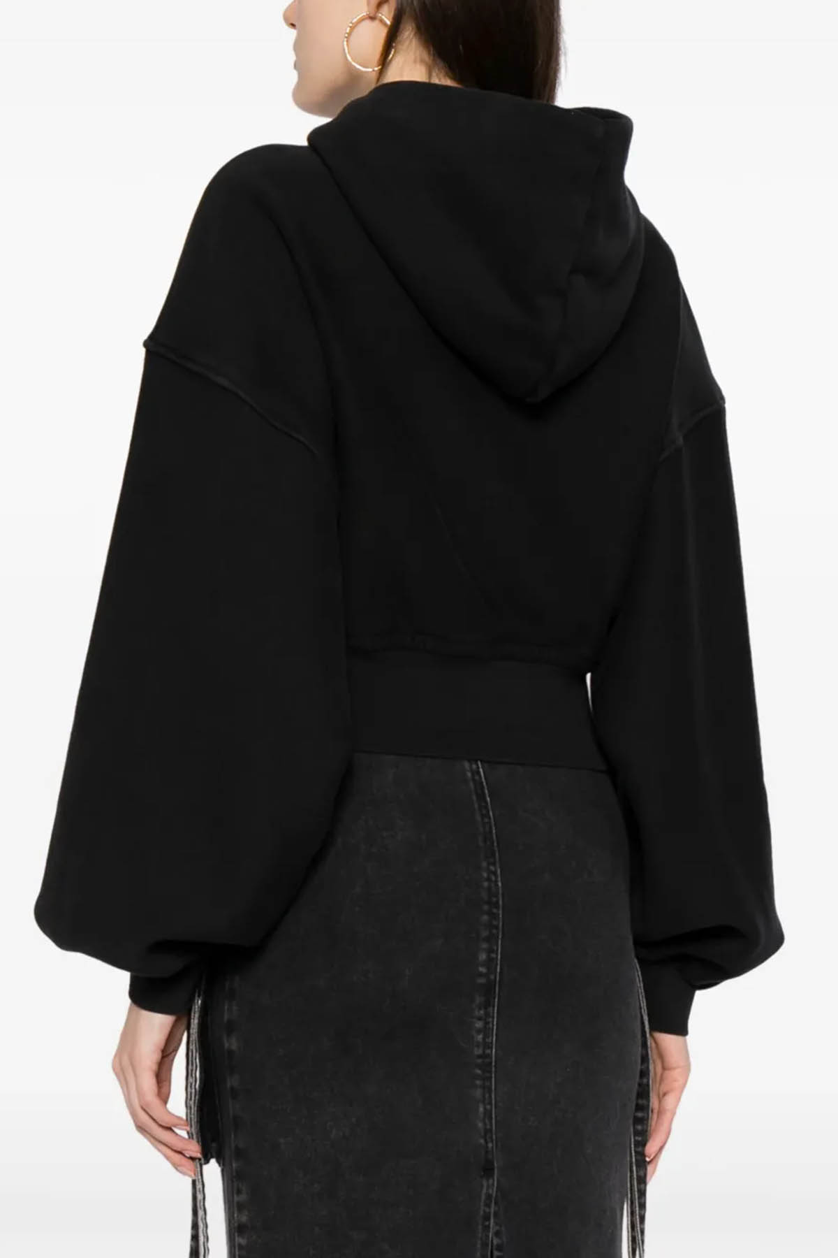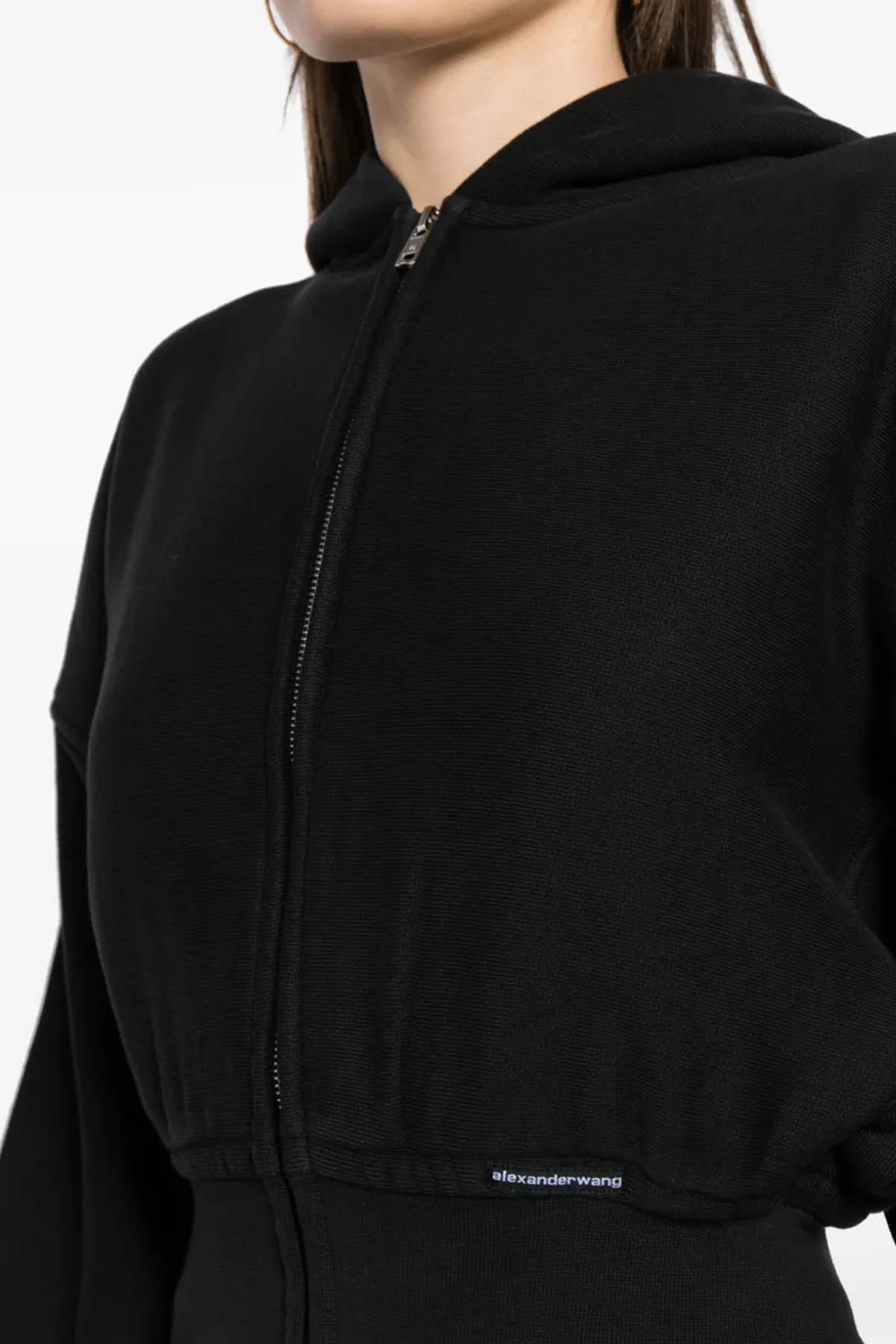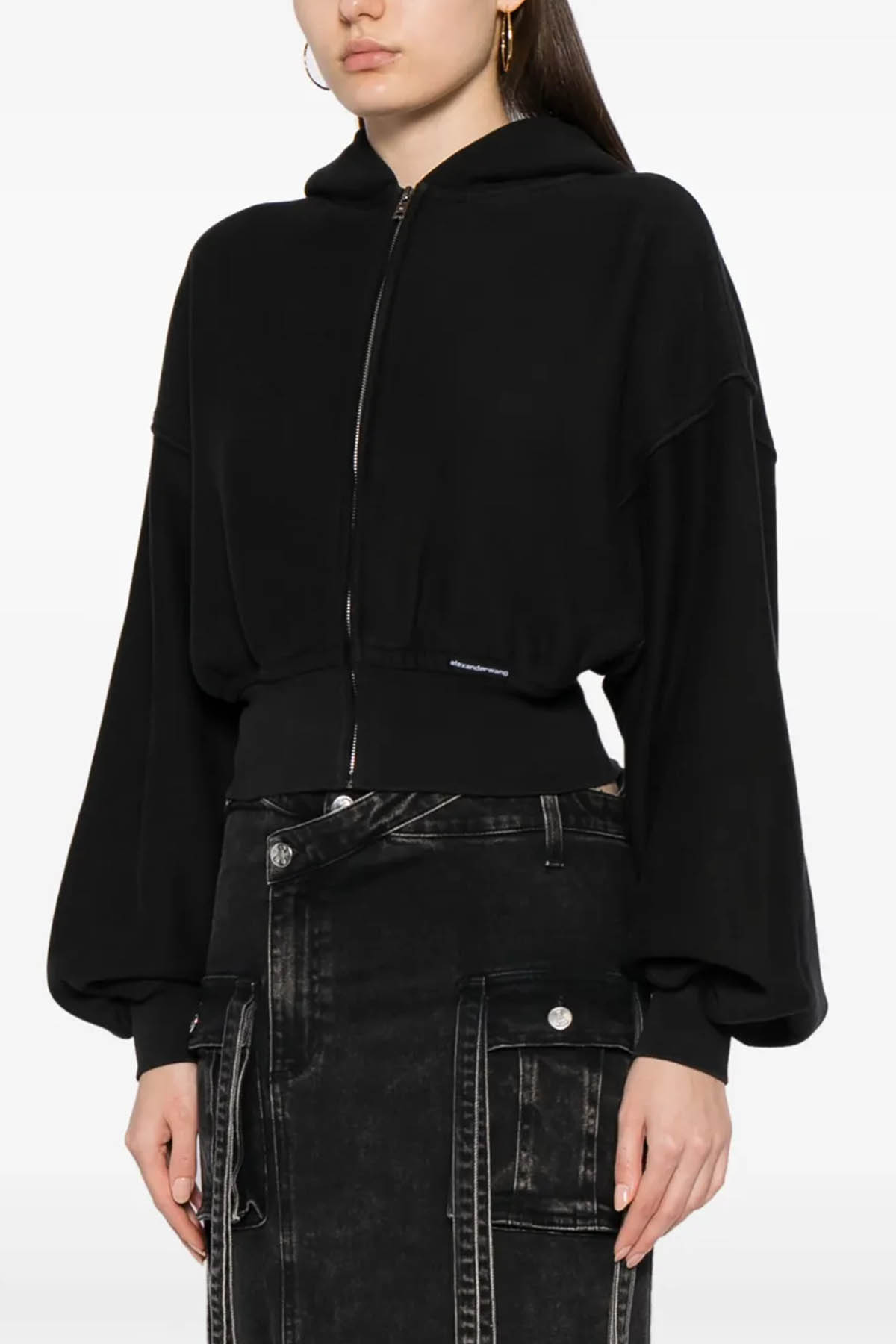 Hooded design, front zip closure, long sleeves, cropped length, elasticated hem and cuffs, and dropped shoulders.