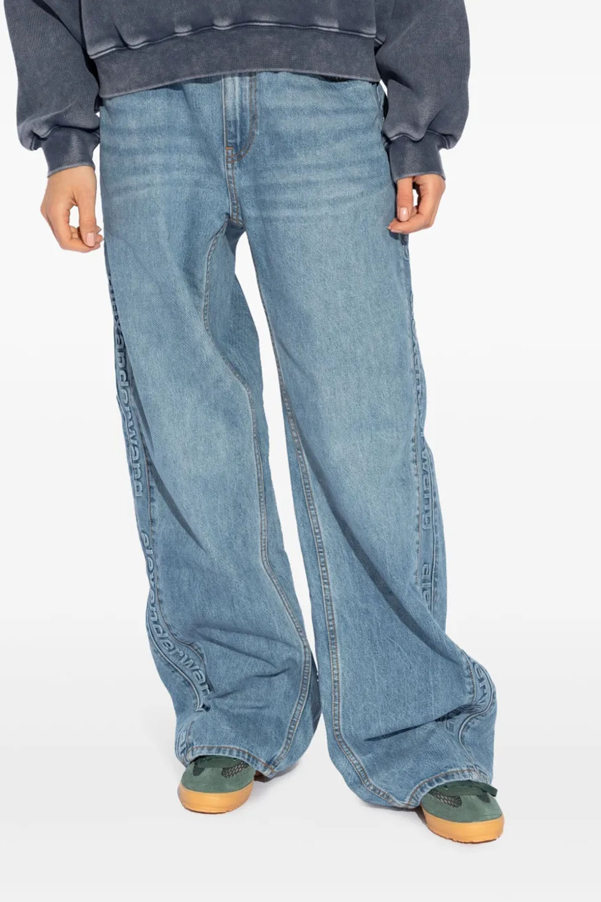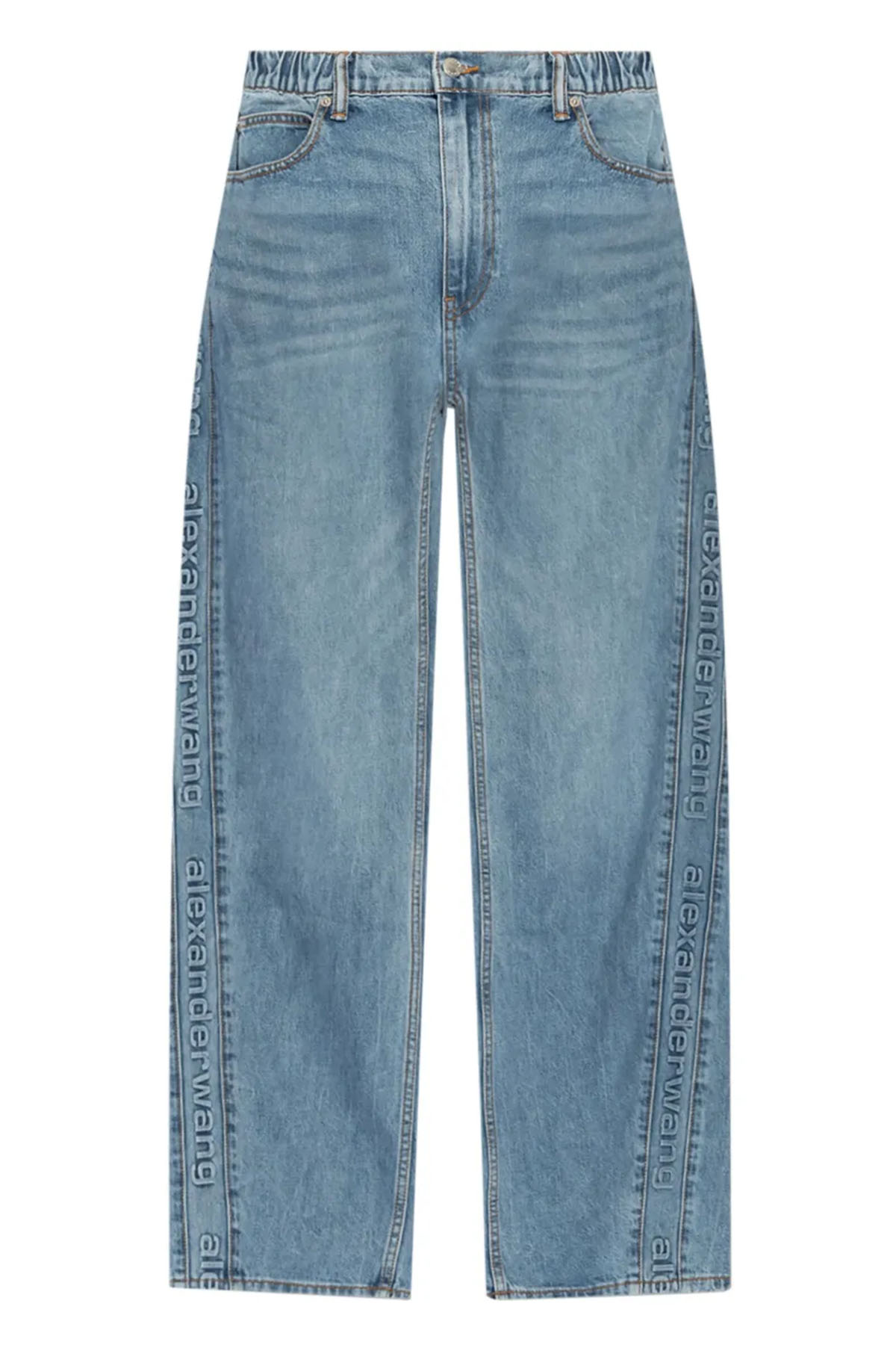 Lightweight denim joggers with a mid-rise and wide, rounded leg, they feature a twisted side seam, an elastic waistband, and classic five-pocket styling with a fly and zip fly.