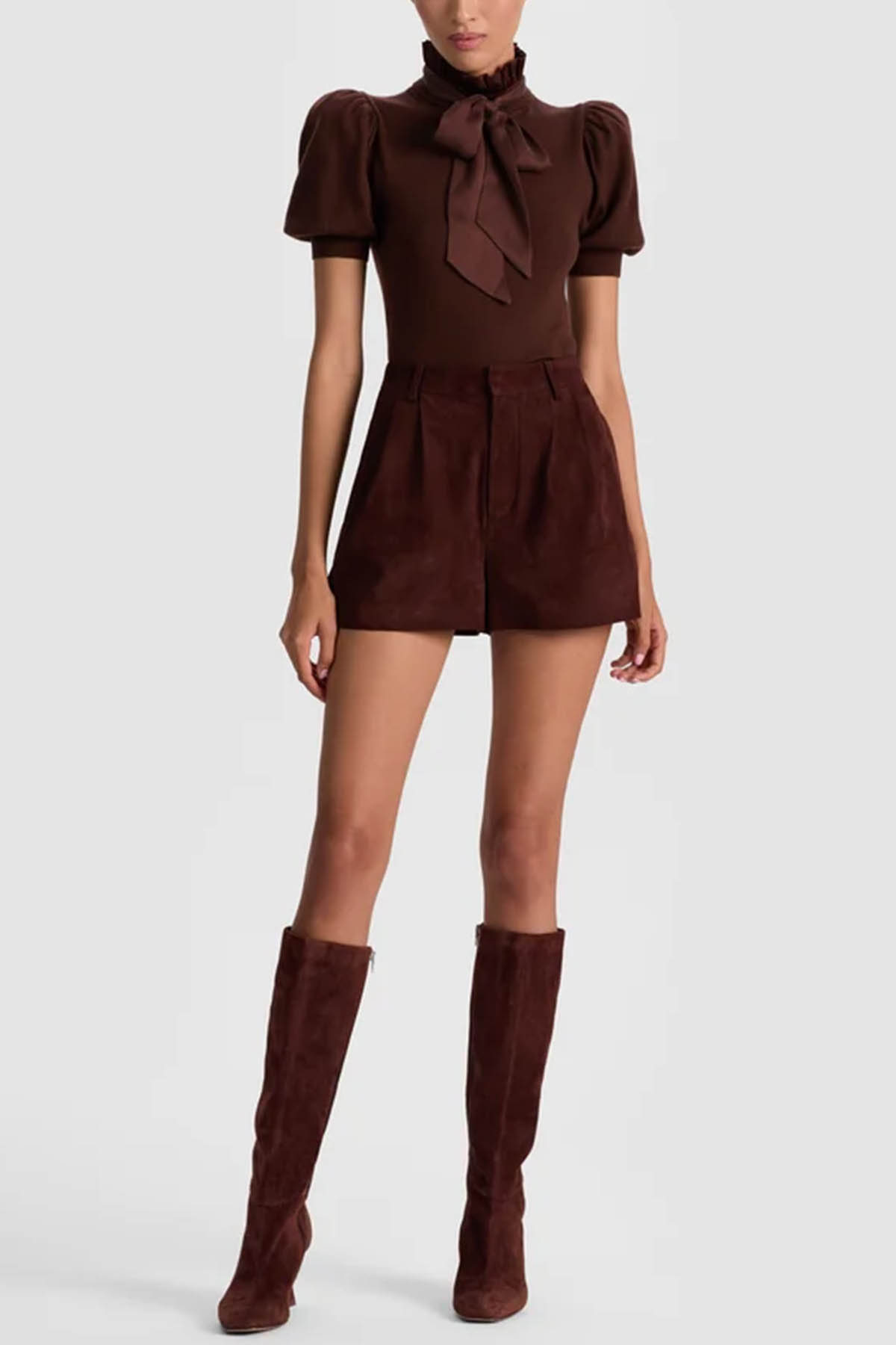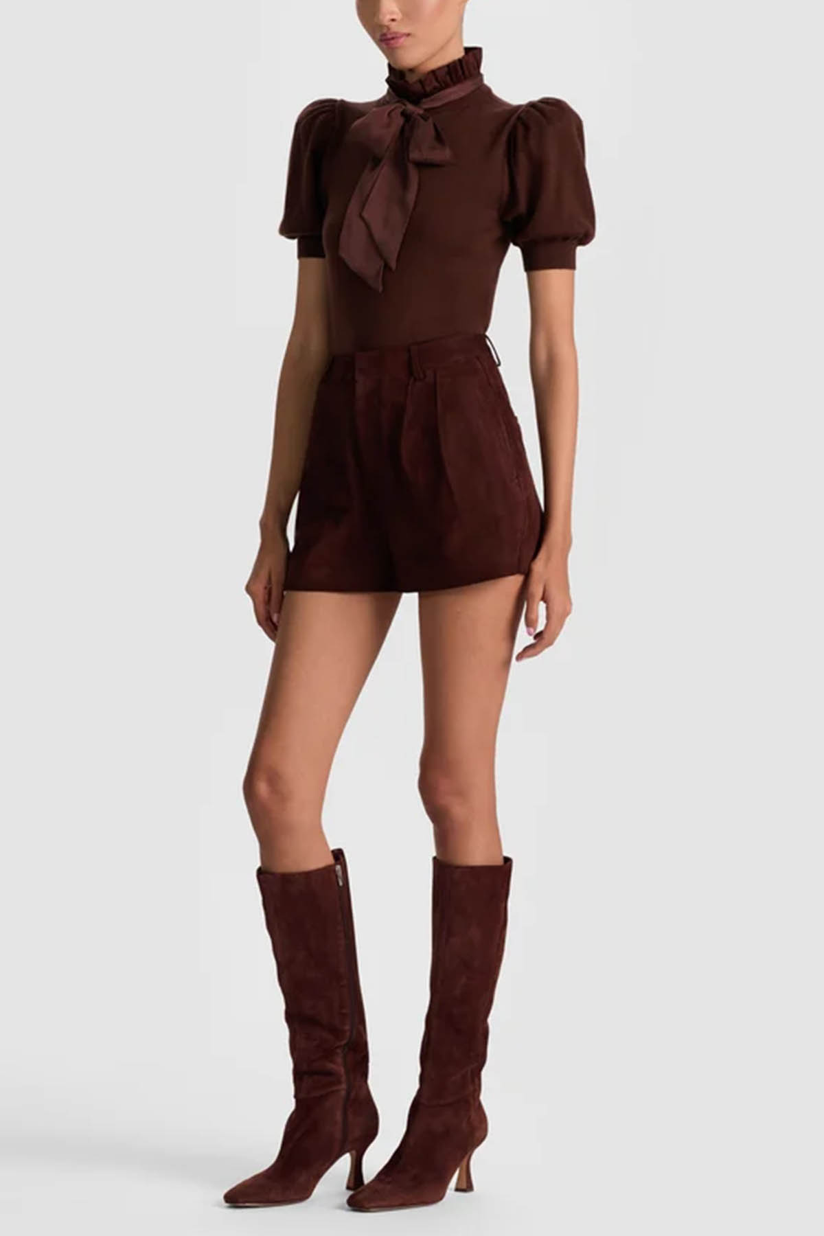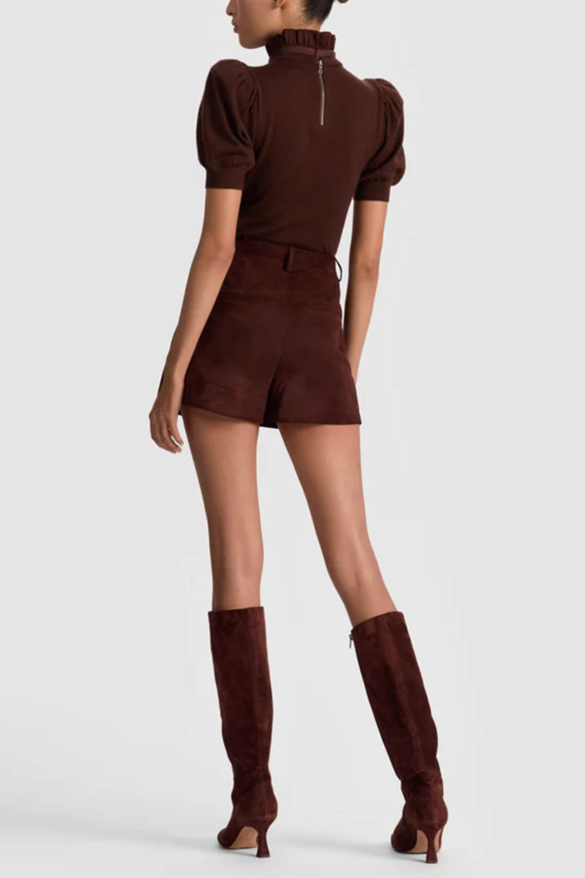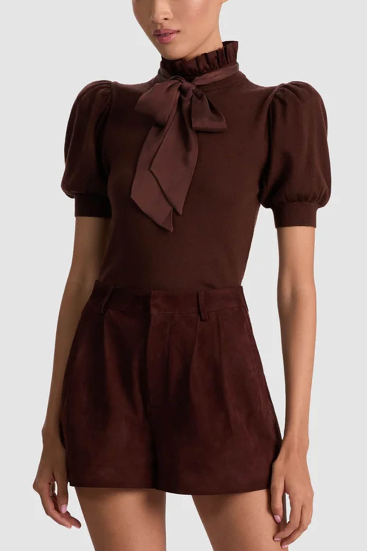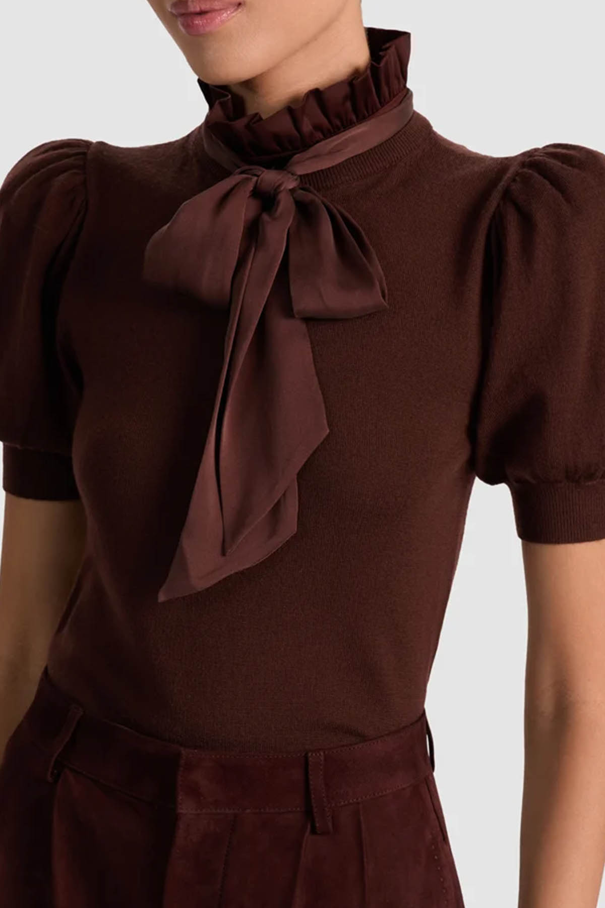 Featuring a removable ruffle collar, an adjustable and removable bow, puff sleeves, a back zip closure, and a cropped design.