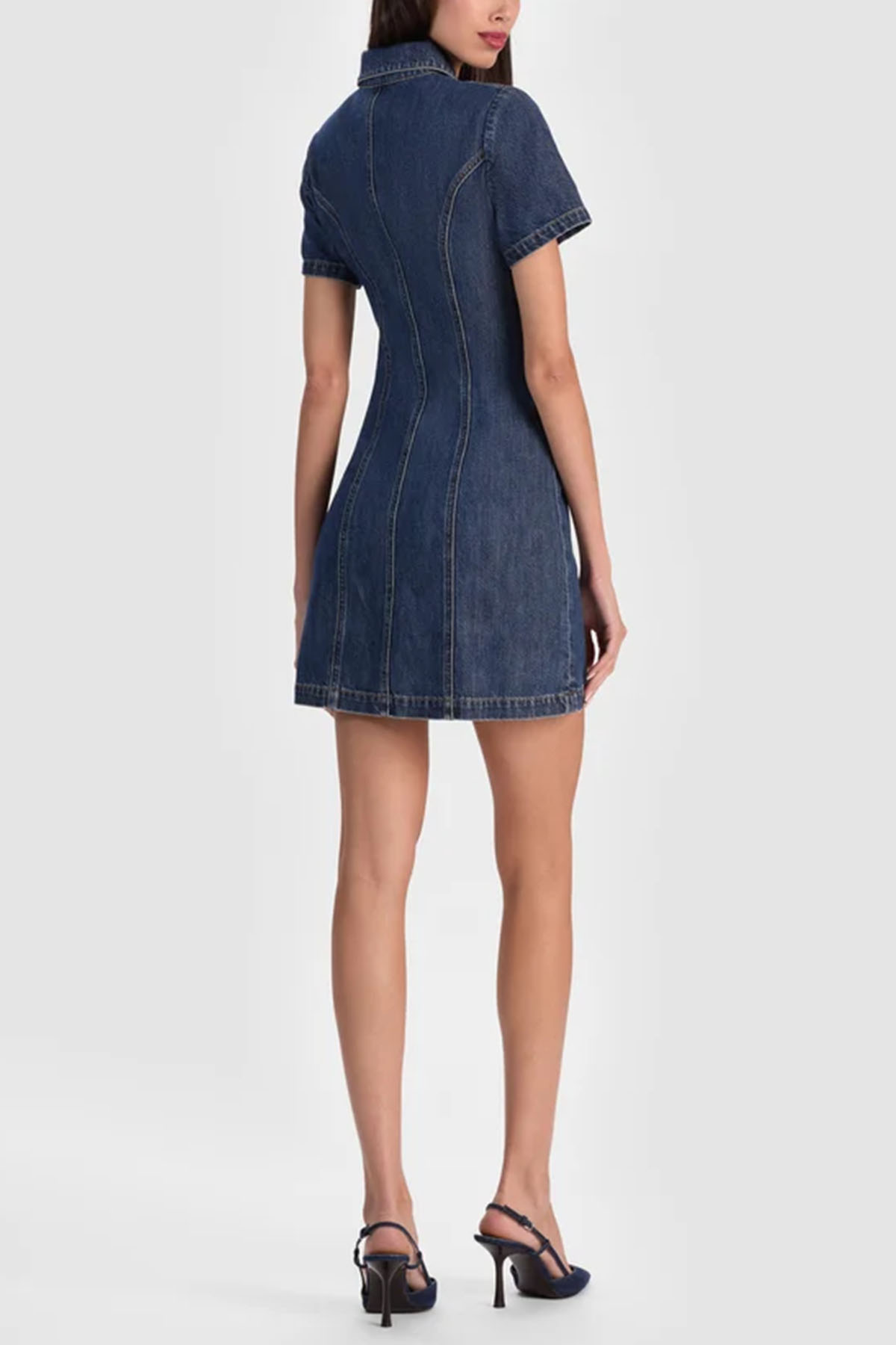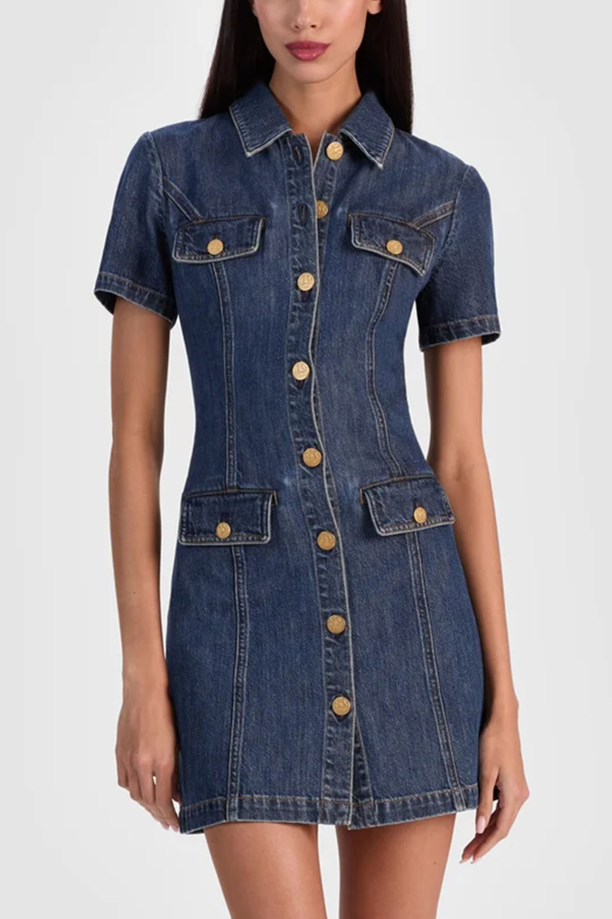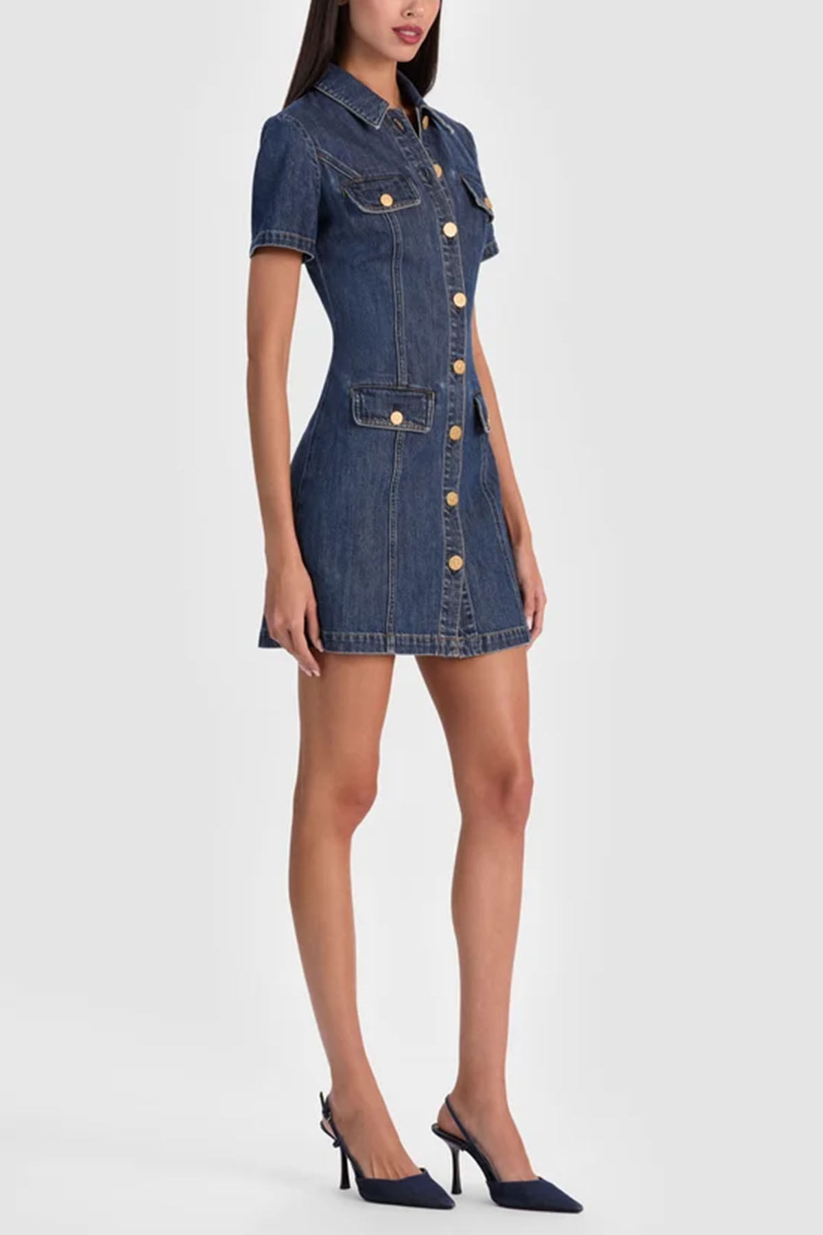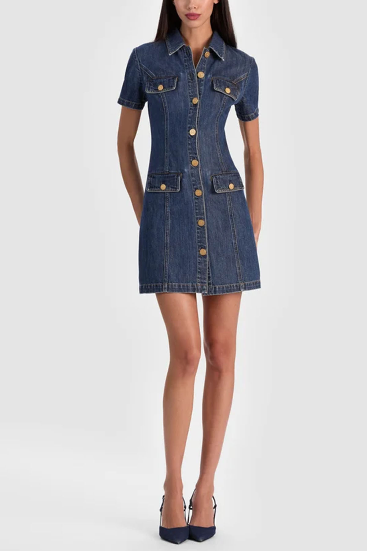 Mini denim shirt dress, classic collar, short sleeves, front closure with gold buttons, flap pockets with buttons, above-the-knee length.