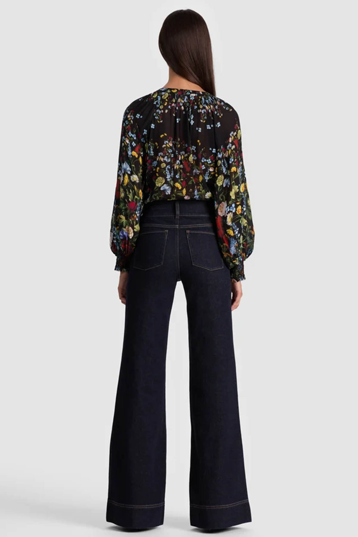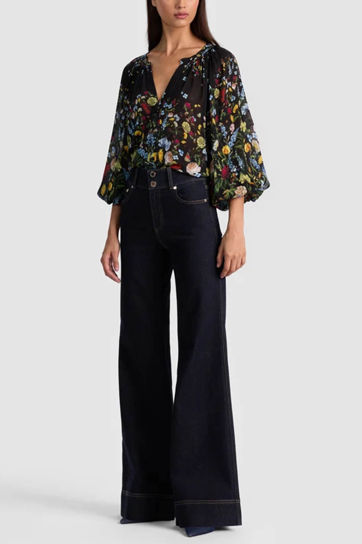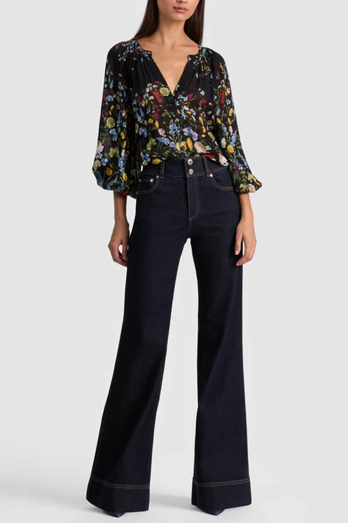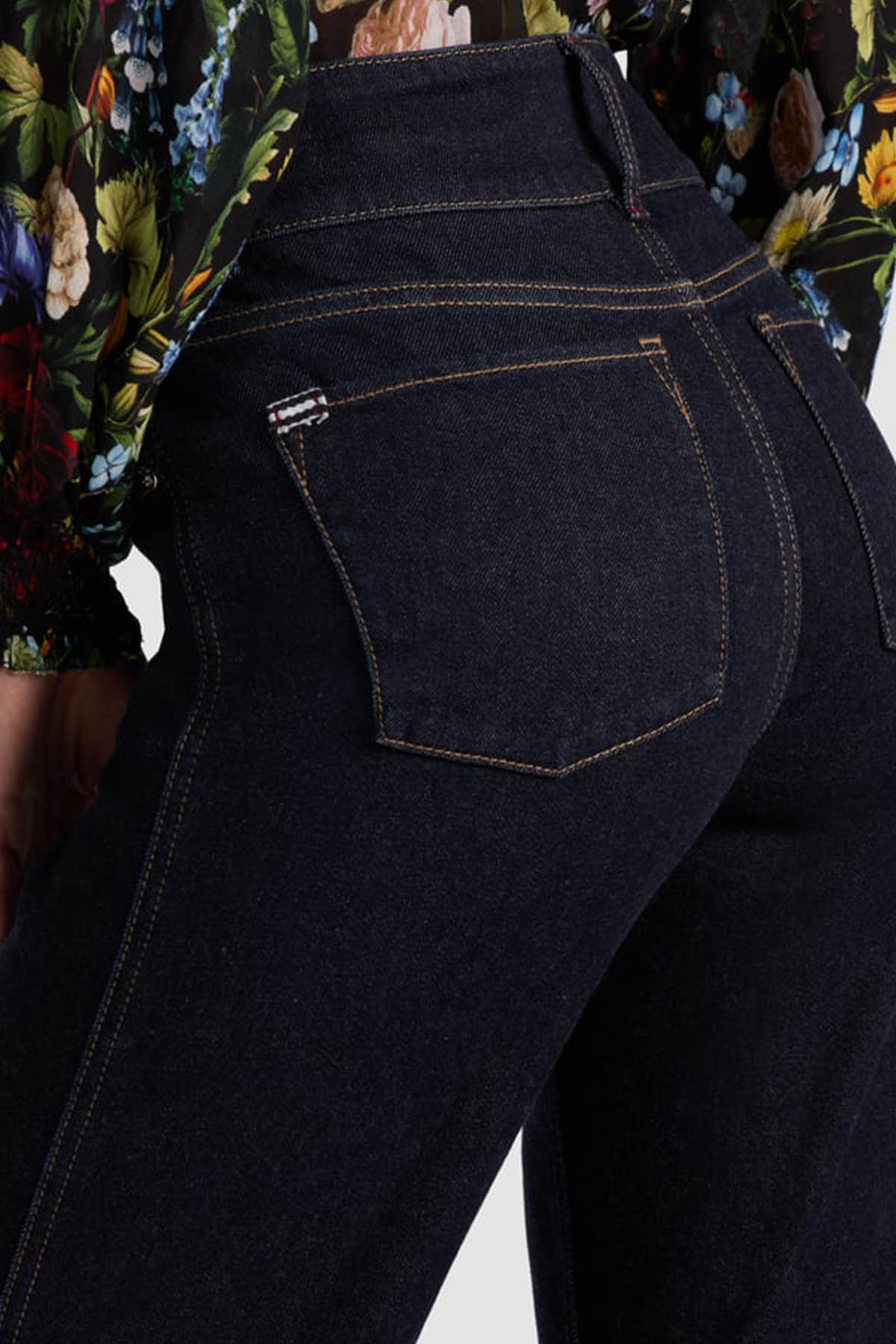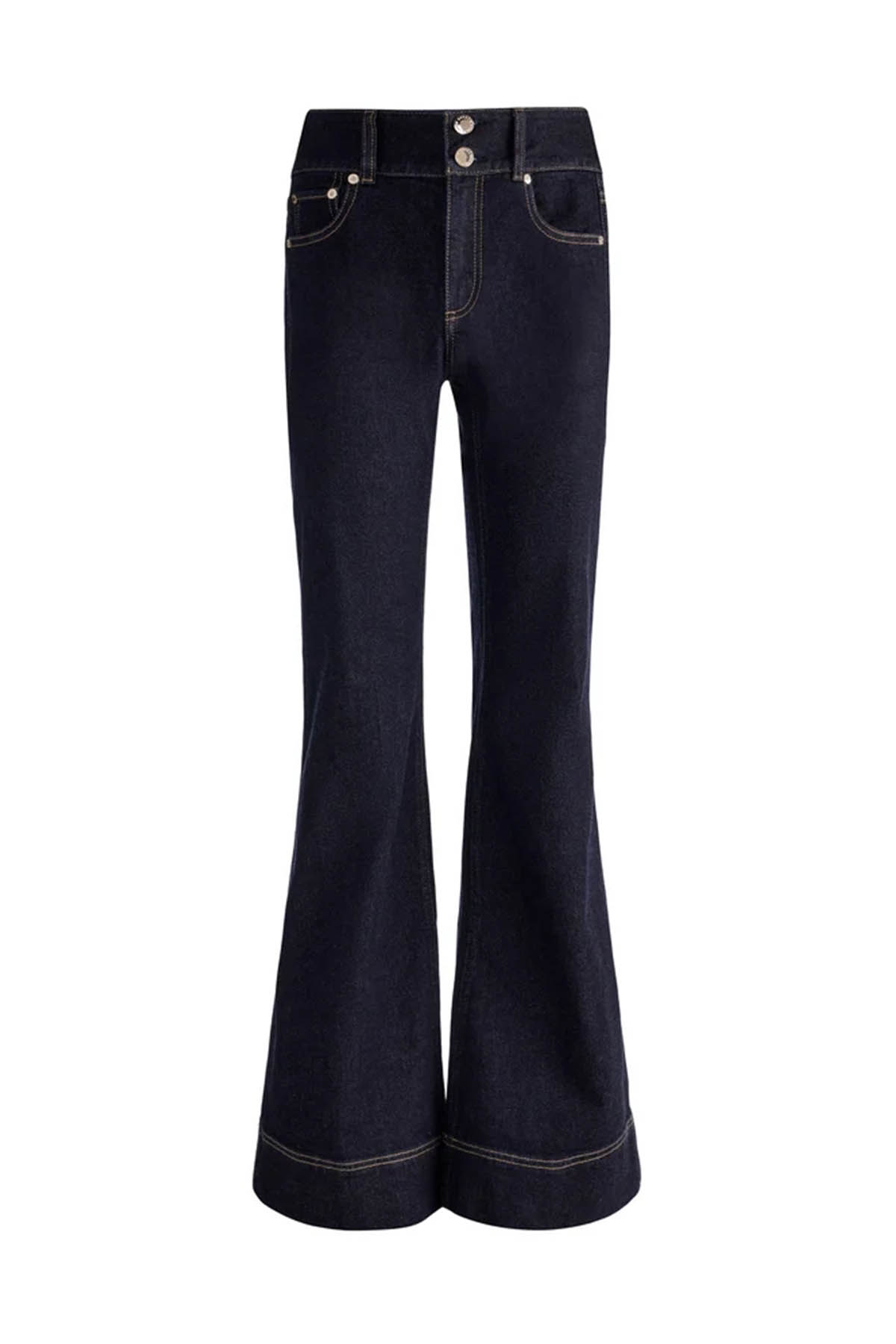 High-waisted, five-pocket, belt loops, front concealed zip and double button closure, flared design.