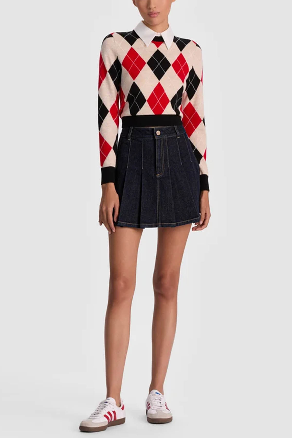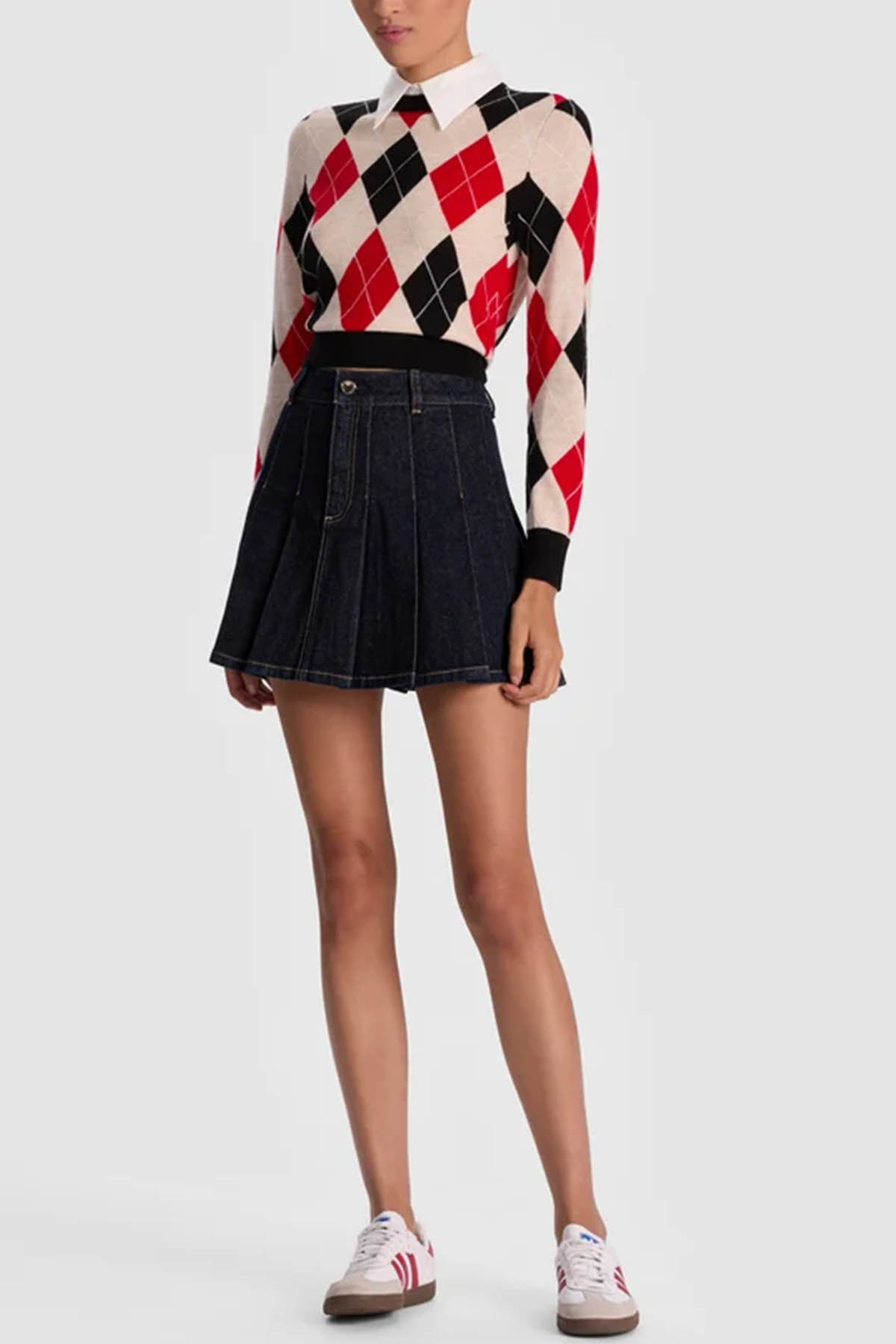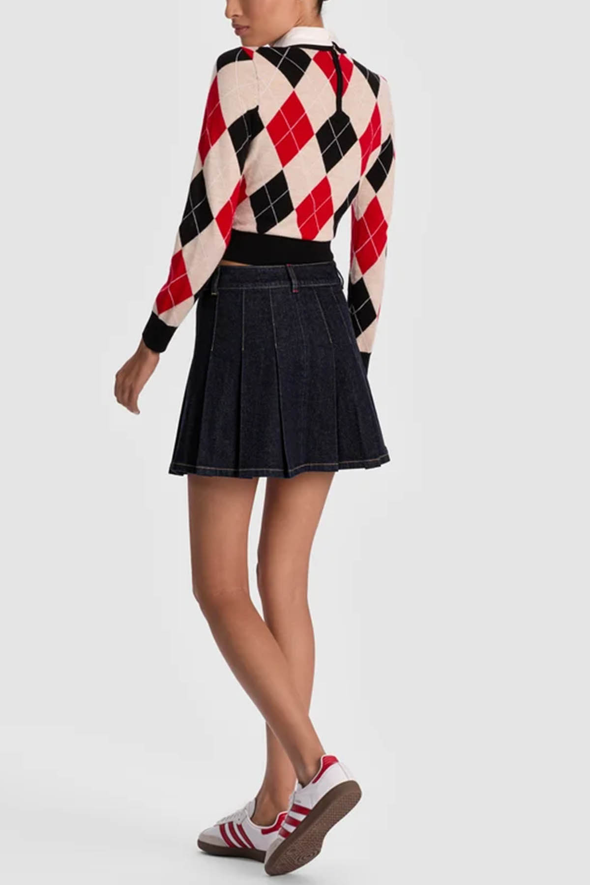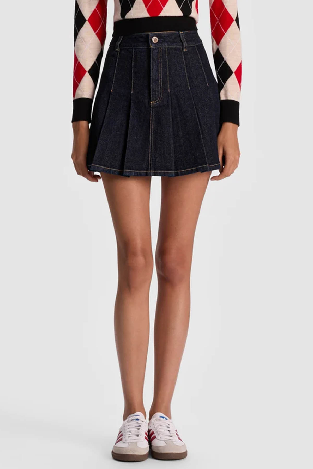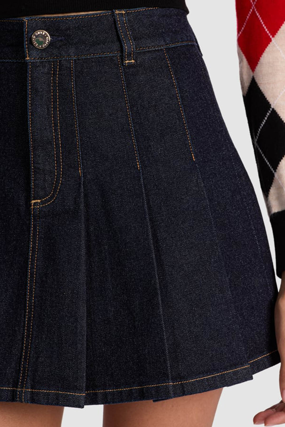 Pleated denim design, front closure with hidden zip and button, side pockets, waistband with belt loops, cropped length.