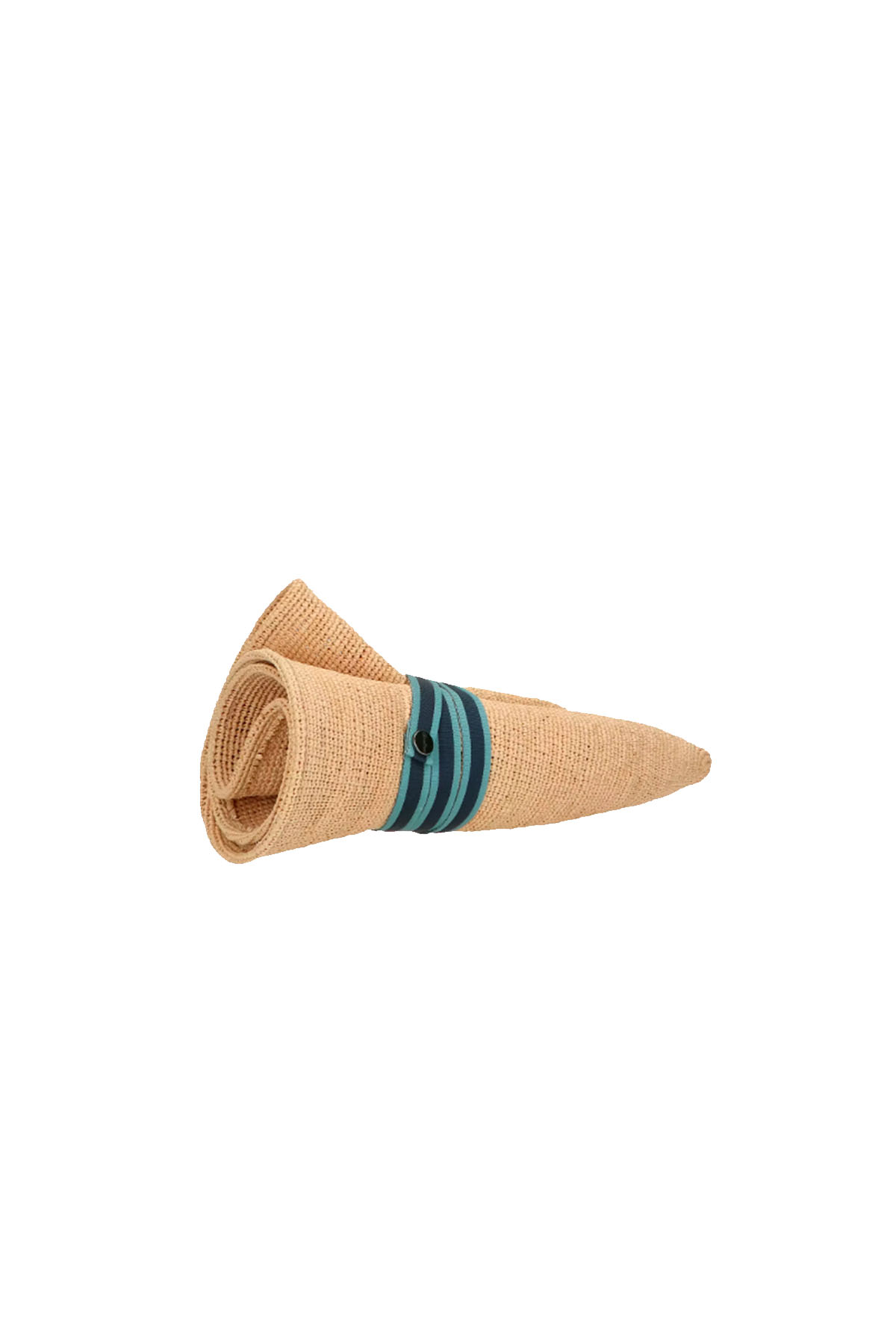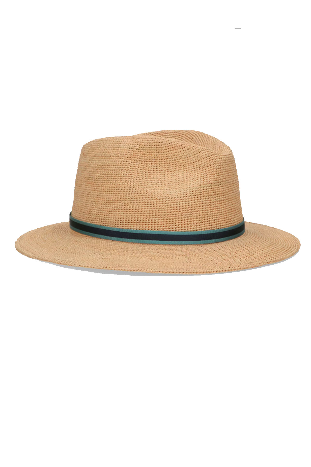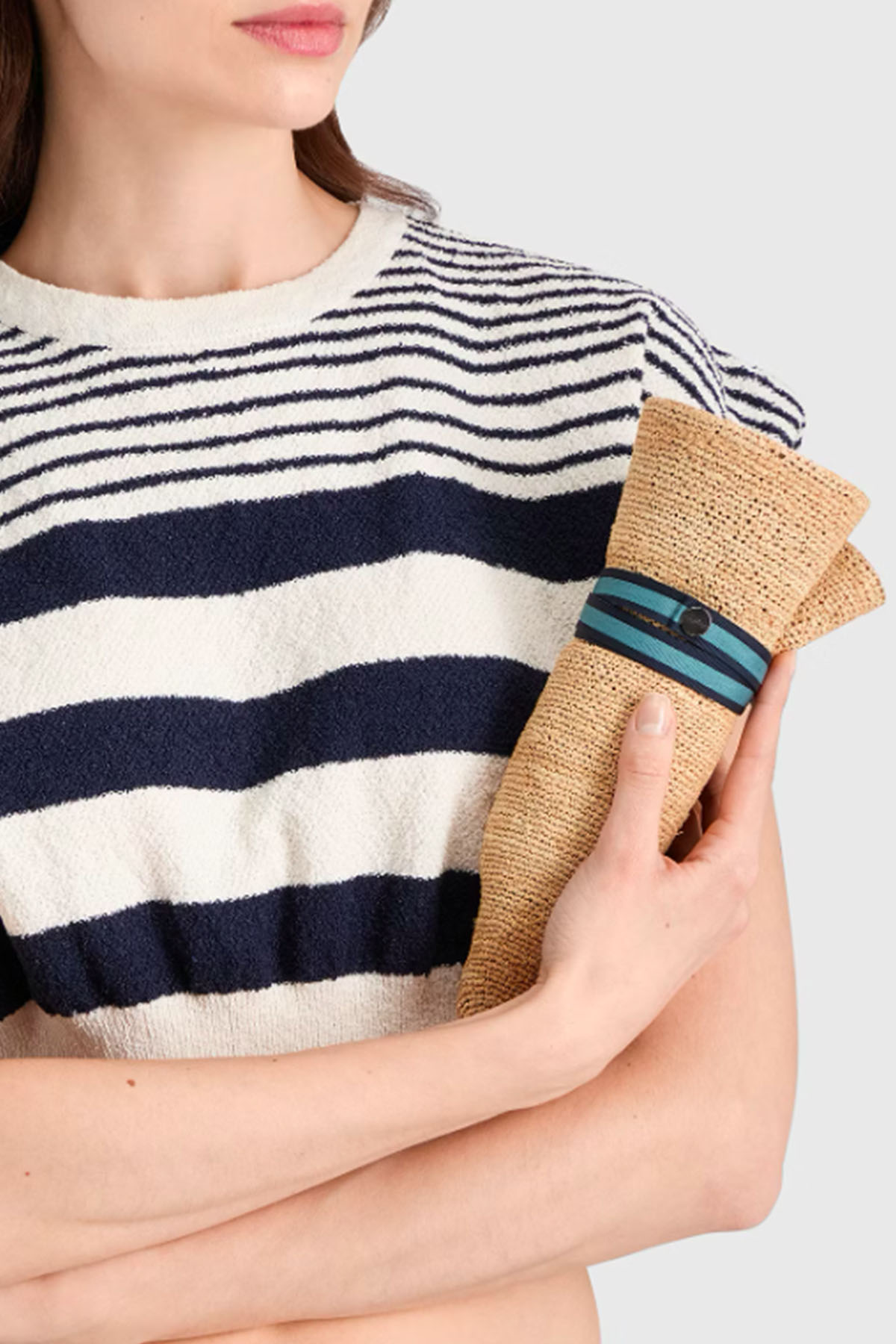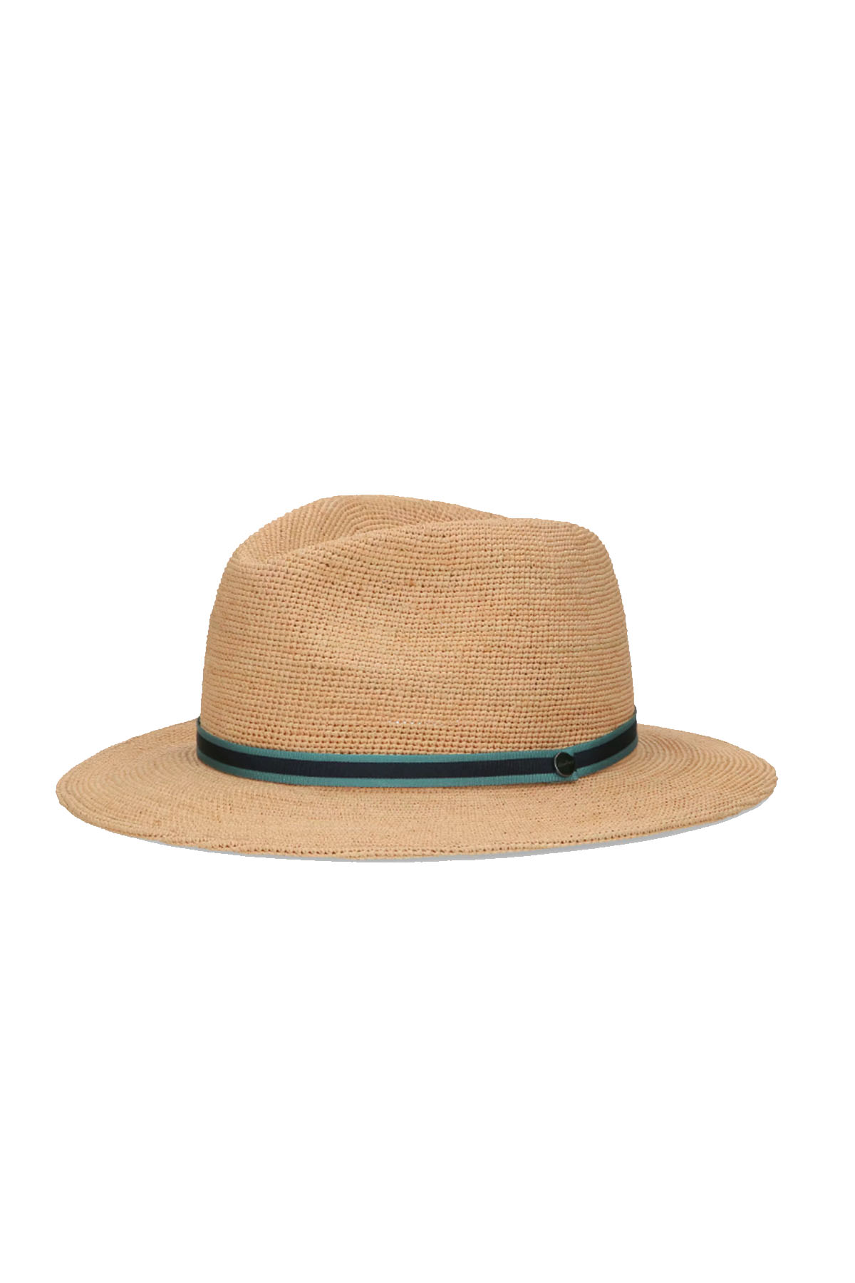 Made of fine crochet raffia, hand-woven with a crochet hook to create a light and breathable texture, the design is completed by a 1.5 cm two-tone band with a logo snap button, adding a distinctive detail. The wide brim measures approximately 6.5 cm.