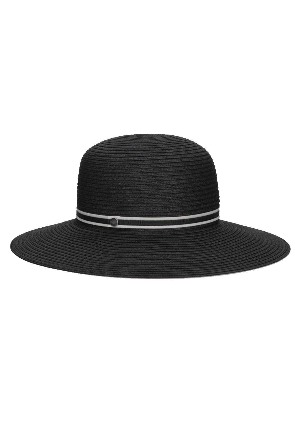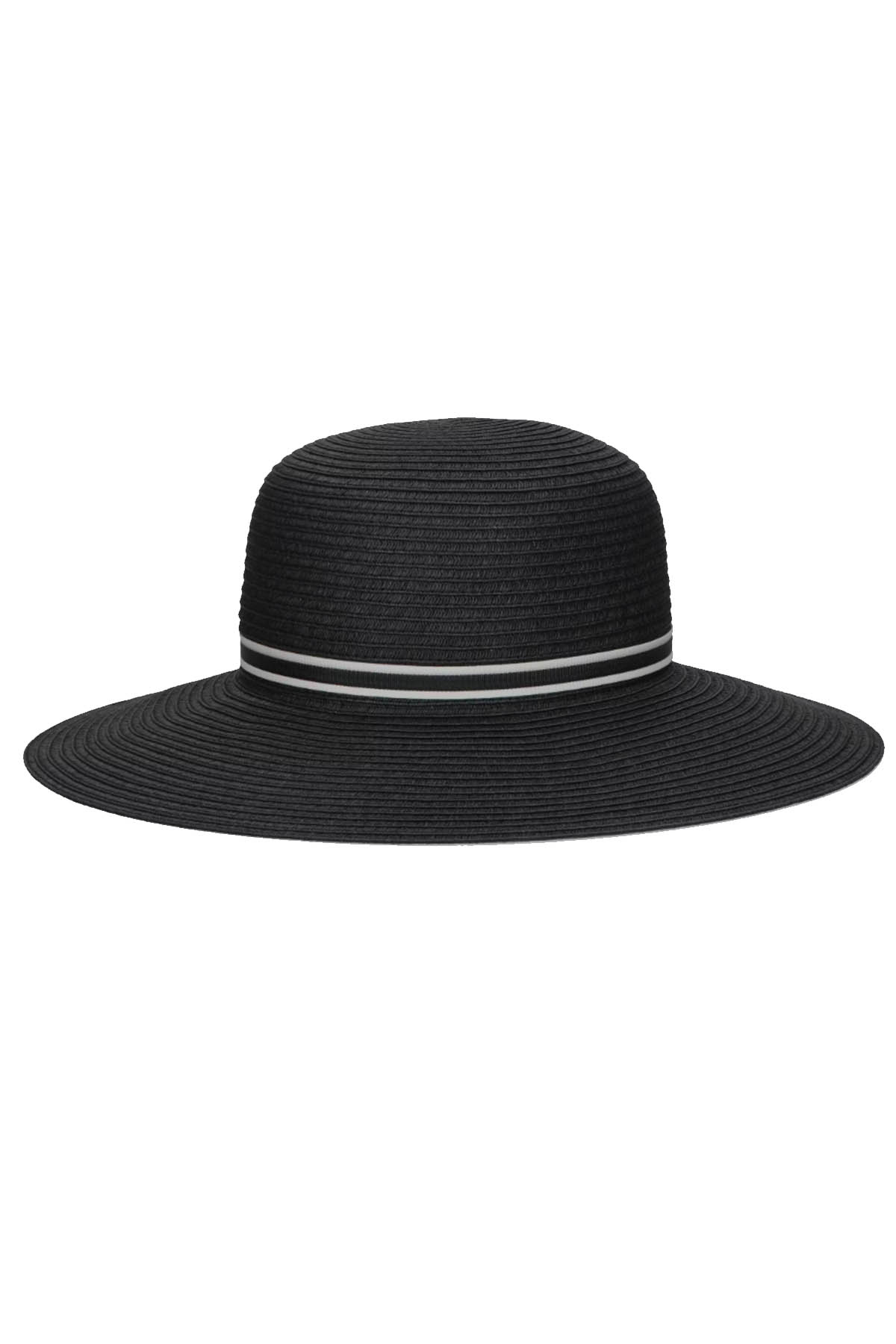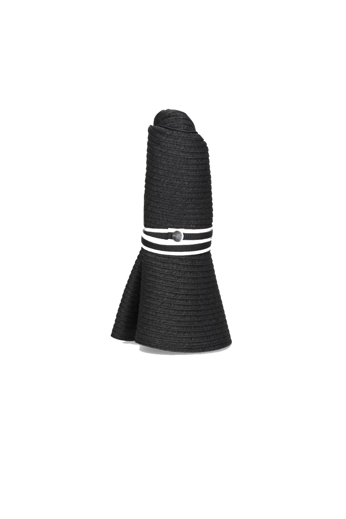 Model made of paper braid, design completed by a 1.5 cm two-tone band with branded snap button, the wide brim measures approximately 9 cm. The hat can be rolled up and comes with a coordinated dustbag for practicality and protection.