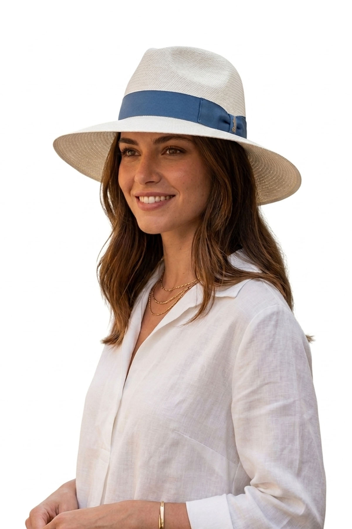 The Sophie Panama hat is hand-woven from the finest palm fibers, ensuring a fine, uniform, lightweight, and durable weave. The medium-height crown is well-structured. The model features a loose brim, which can vary between approximately 10 and 12 cm. A 4 cm grosgrain band completes the design.