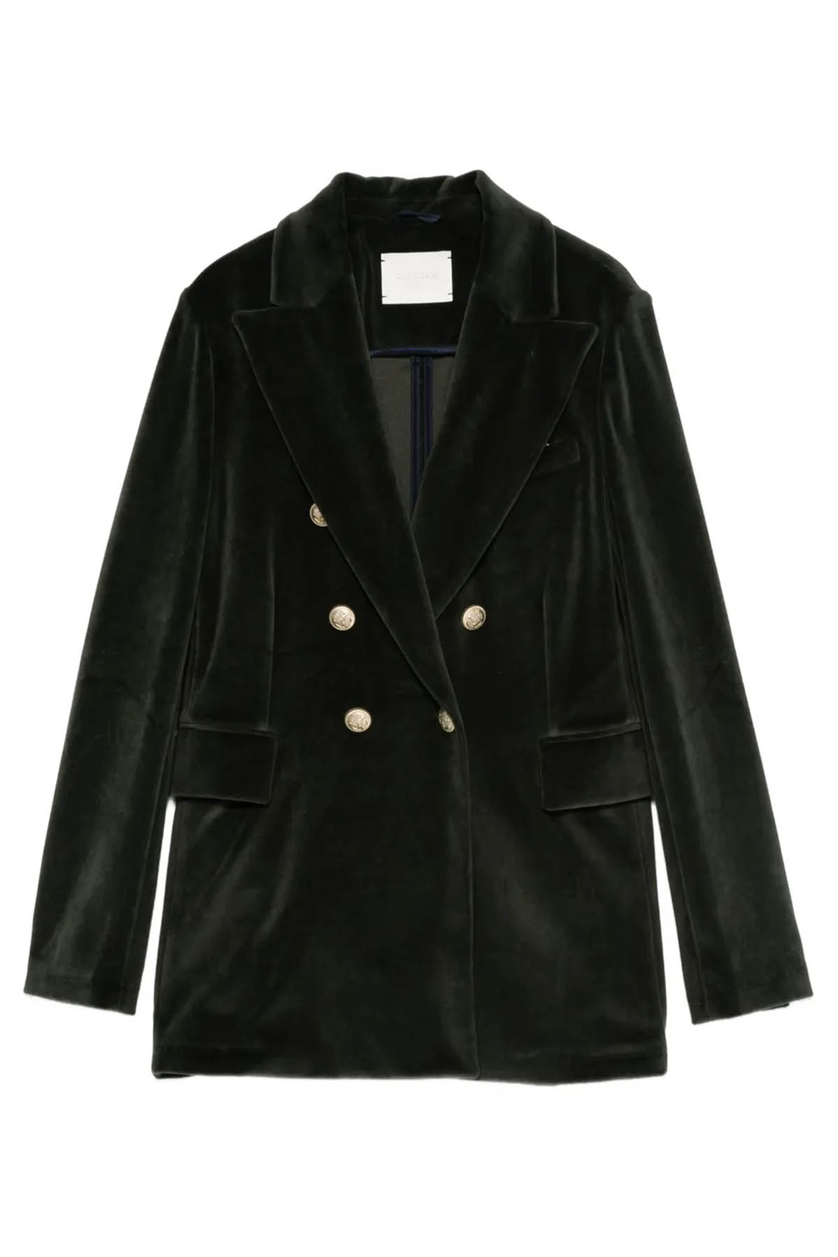 Double-breasted style in smooth velvet, peak lapels, six metal buttons, an inside button, buttoned cuffs, two flap pockets and one welt pocket with a pocket square.