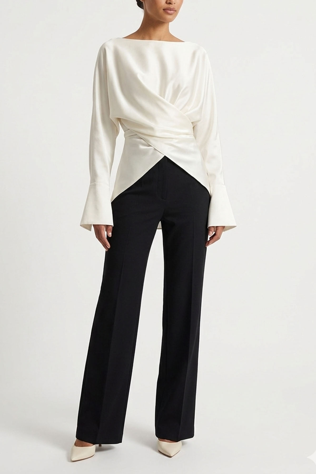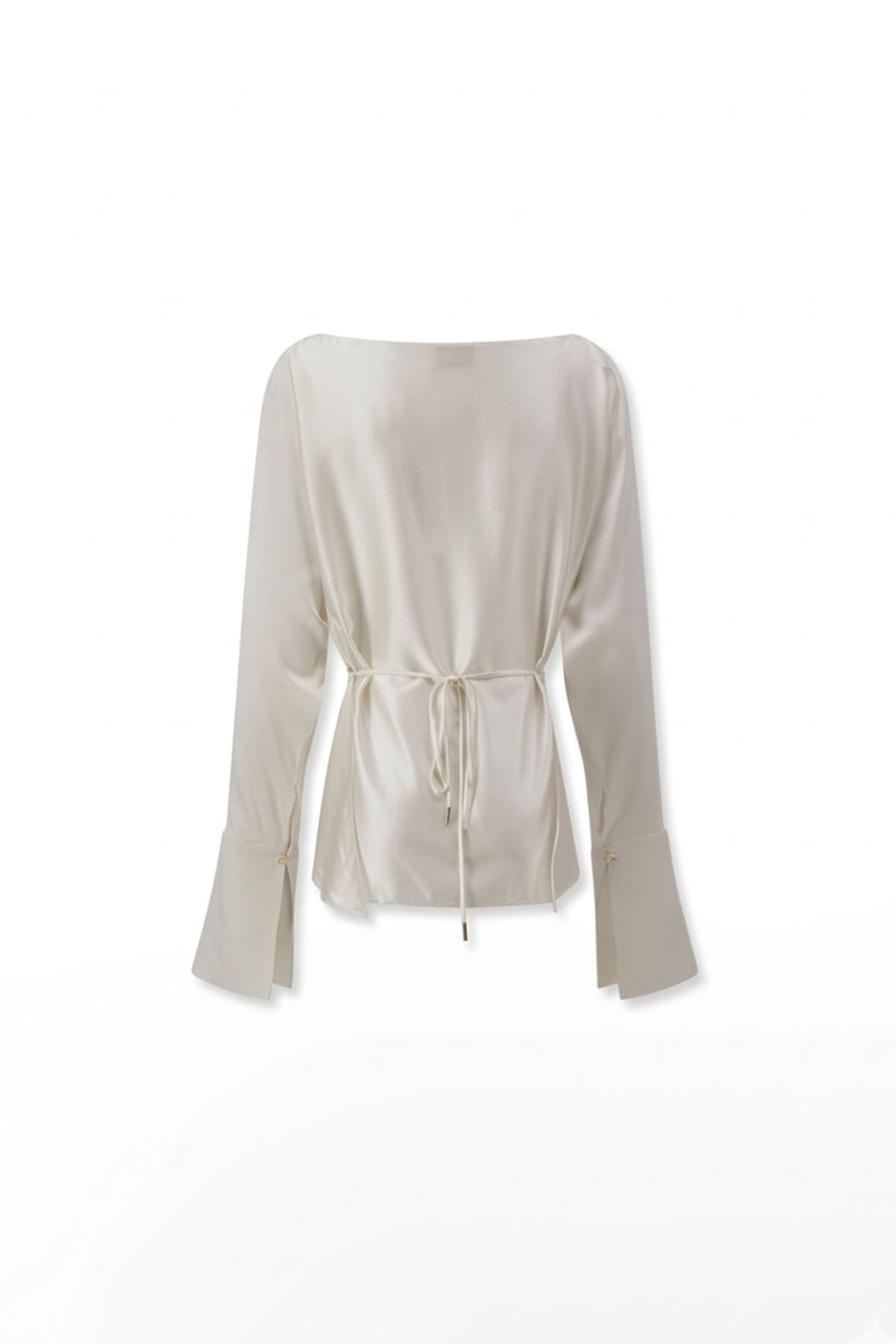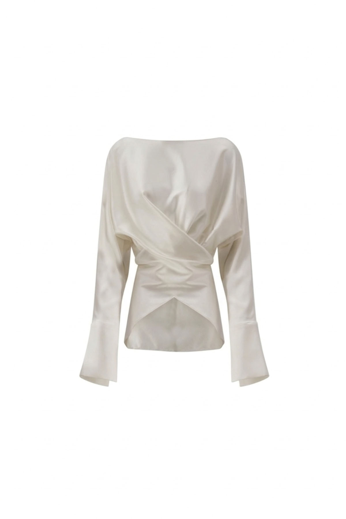 Silk blouse with a wrap waist, flatters the figure with fluid drape and refined elegance. It features low-cut shoulders, long sleeves, silk-covered button cuffs, and a wide neckline.