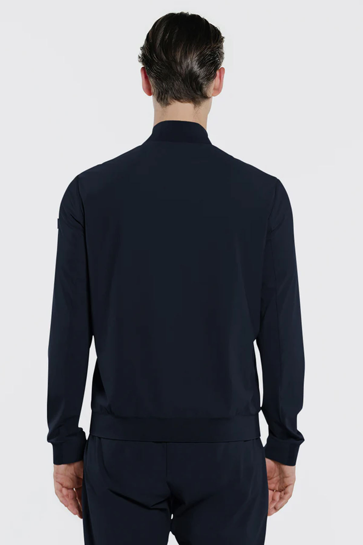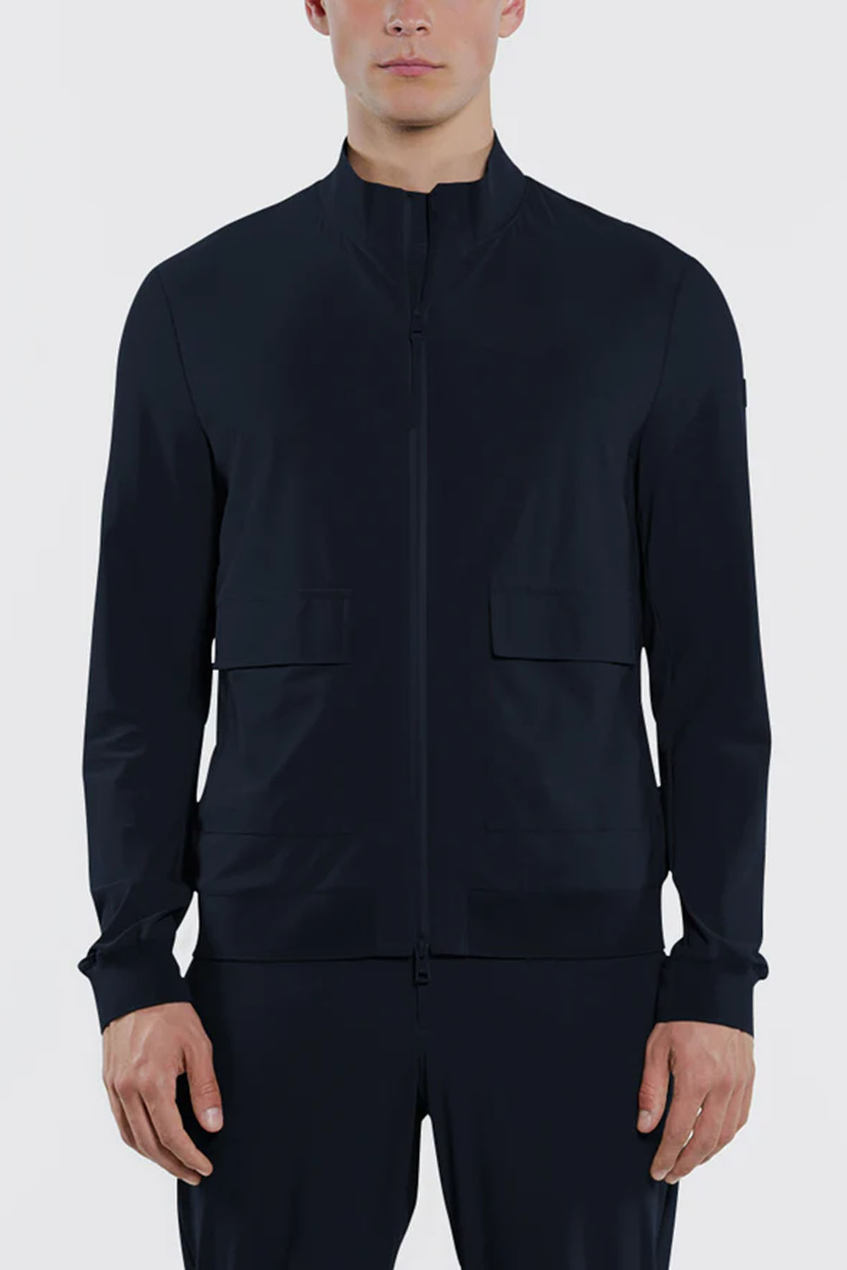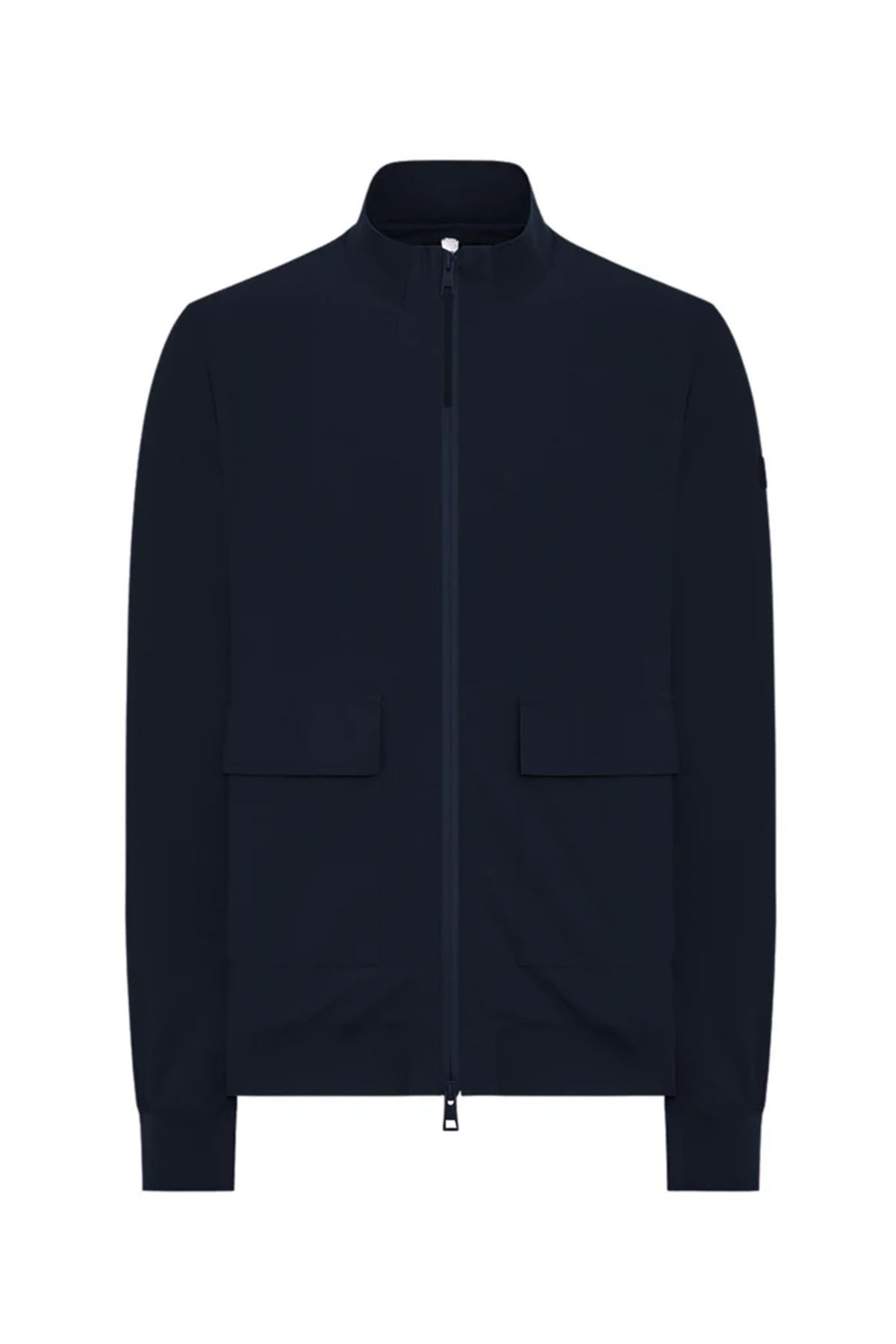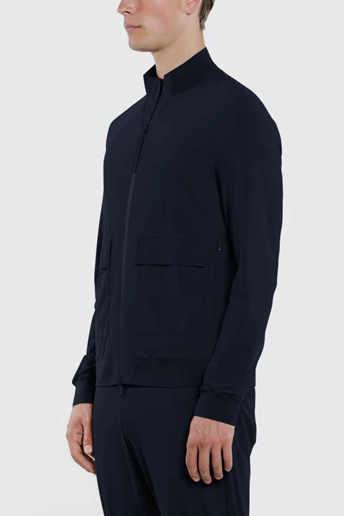 Blue bomber jacket in two-way stretch nylon, full-length water-resistant zip front closure with zip puller, matching-tone laser-cut bonded neoprene under-zip, personalized with a perforated logo, front patch pockets with snap flaps, additional side pockets with invisible zips, single-layer technical rib-knit collar, bottom hem, and cuffs, underarm vents, heat-sealed internal pockets with zips.