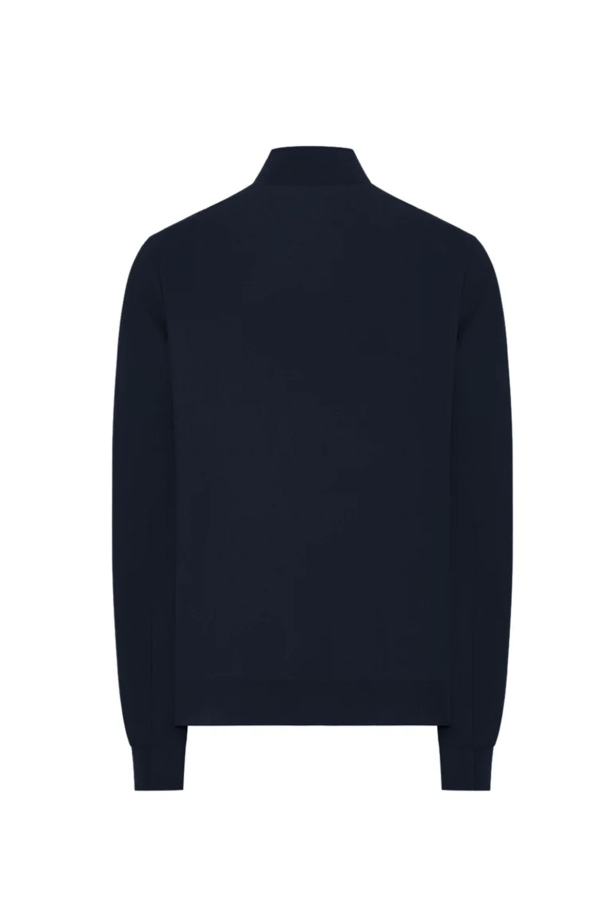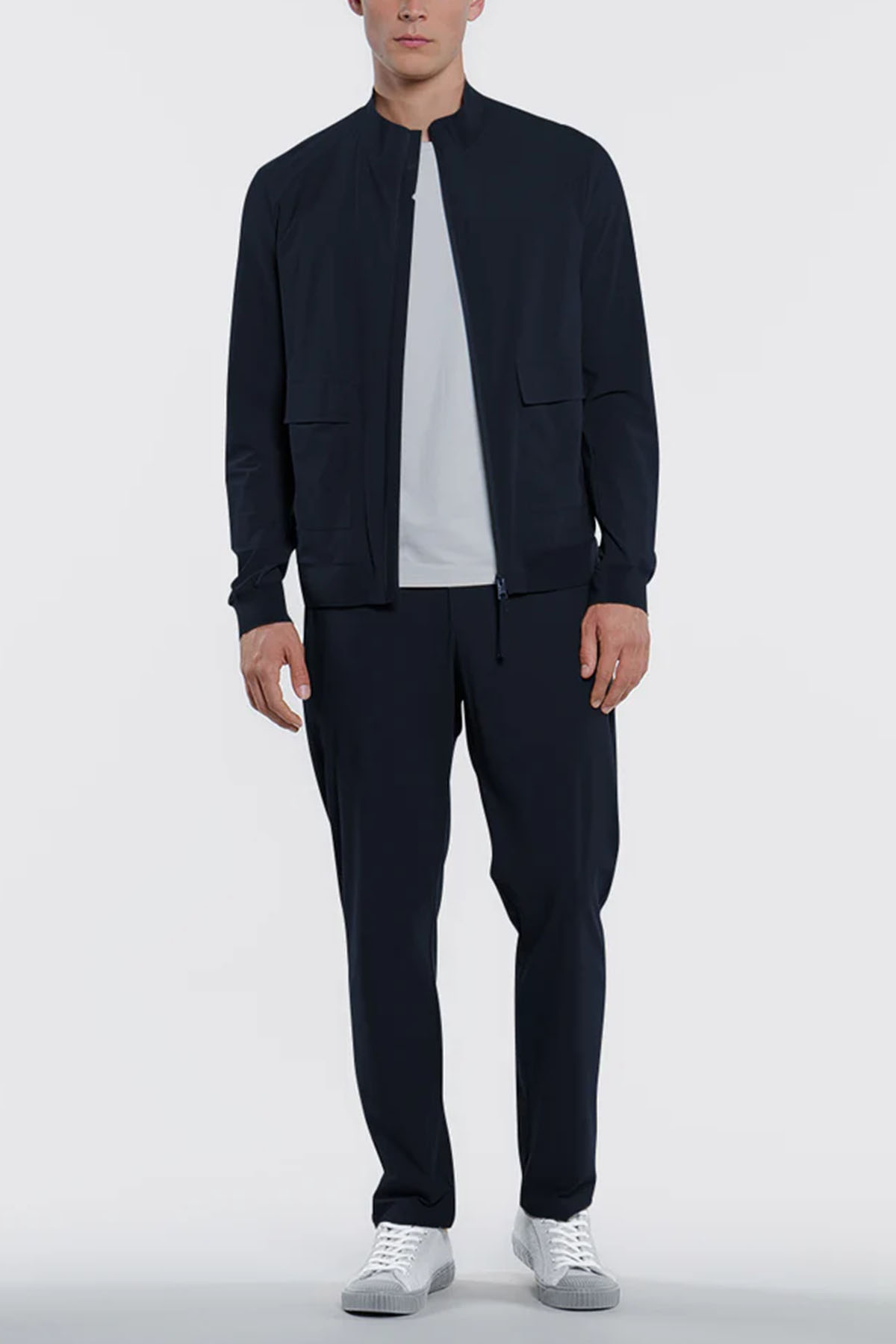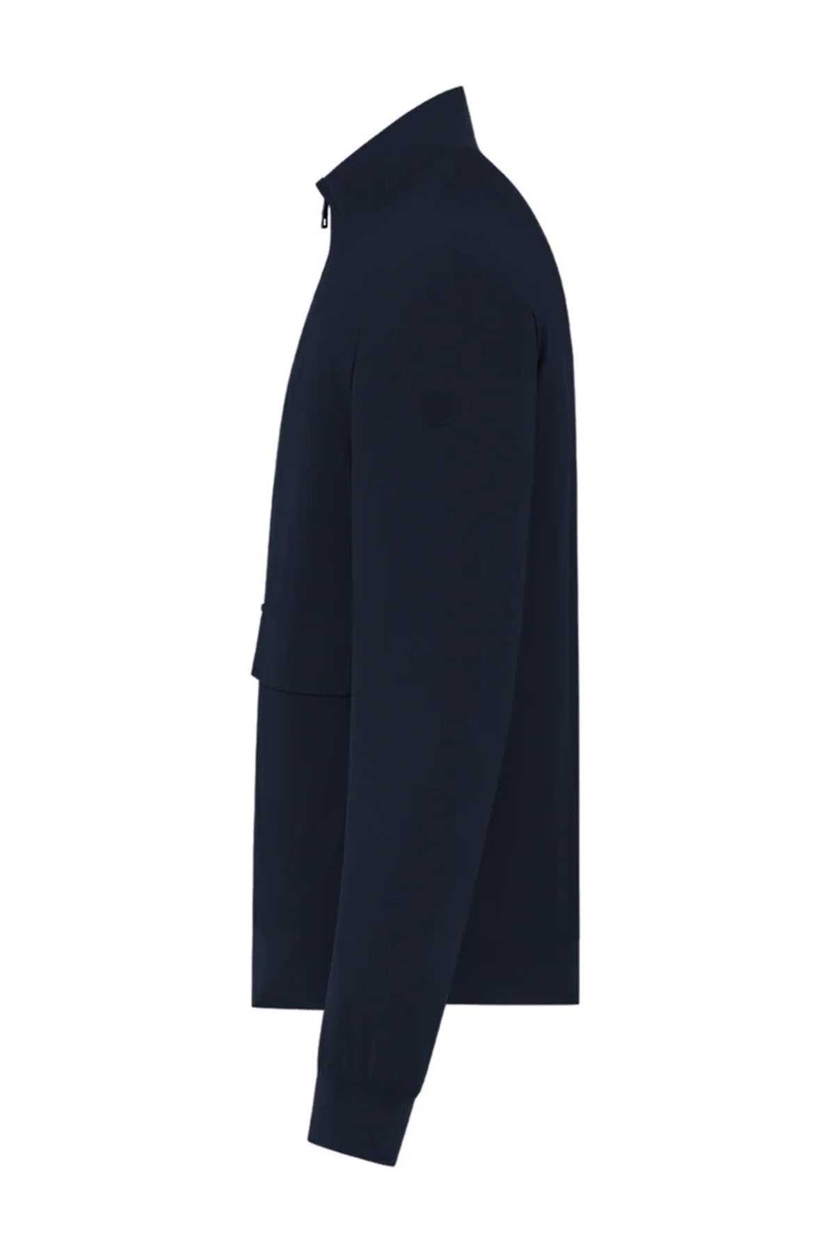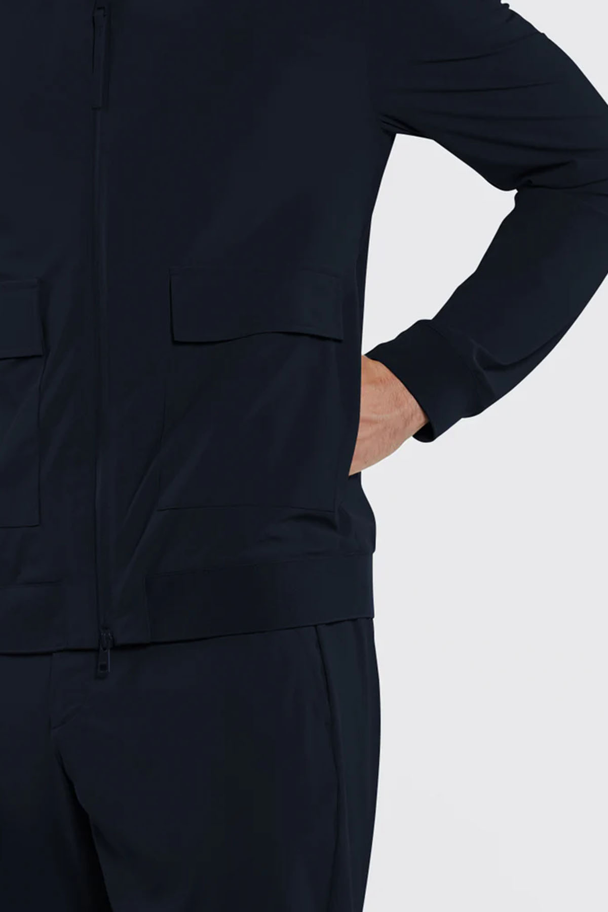 Blue bomber jacket in two-way stretch nylon, full-length water-resistant zip front closure with zip puller, matching-tone laser-cut bonded neoprene under-zip, personalized with a perforated logo, front patch pockets with snap flaps, additional side pockets with invisible zips, single-layer technical rib-knit collar, bottom hem, and cuffs, underarm vents, heat-sealed internal pockets with zips.
