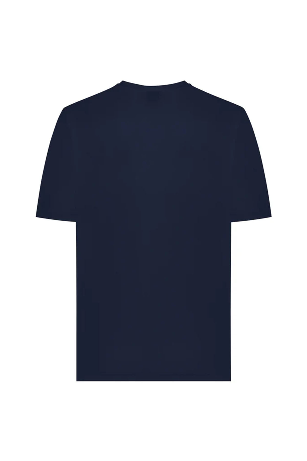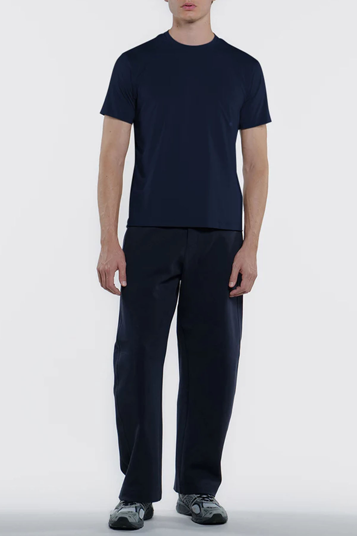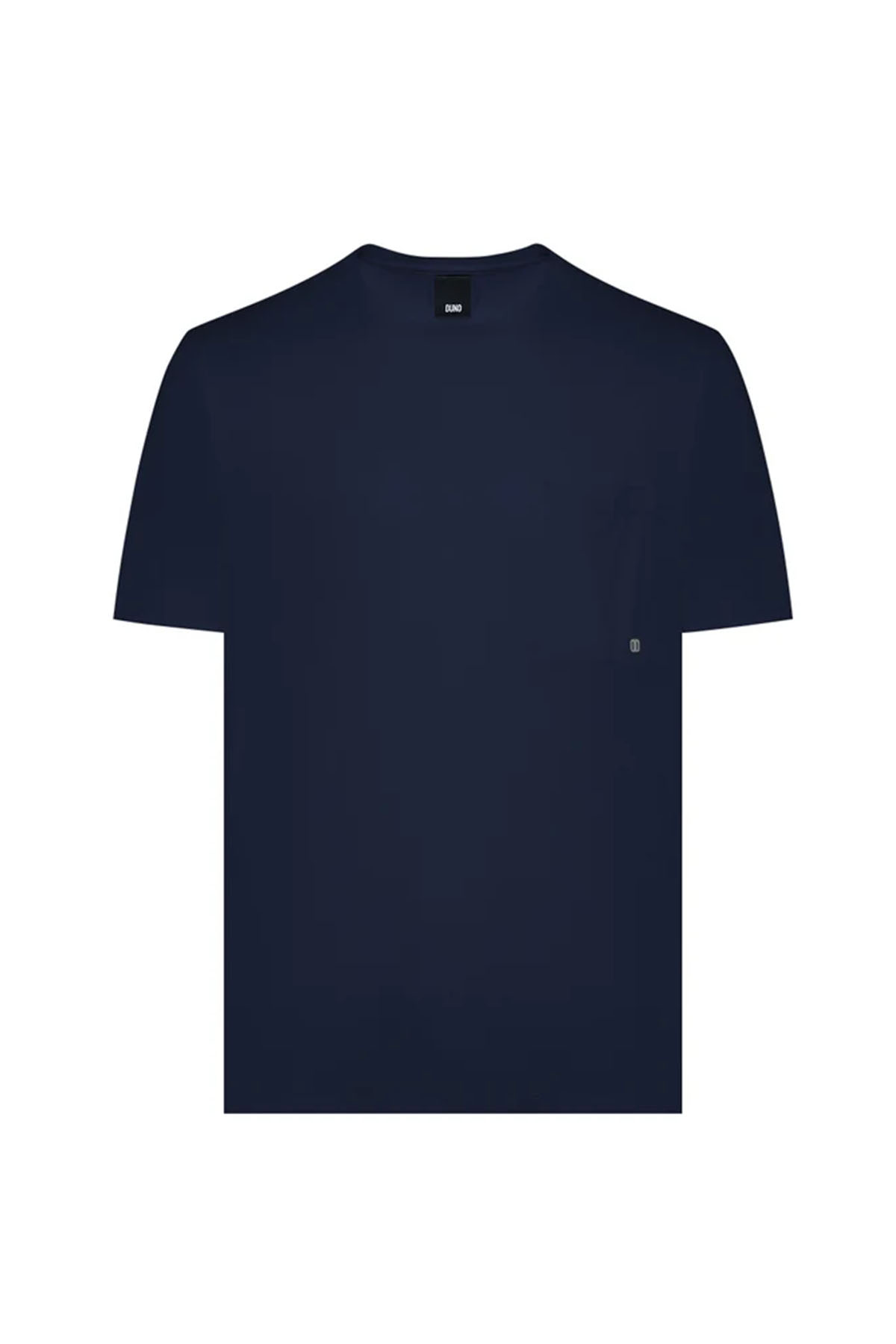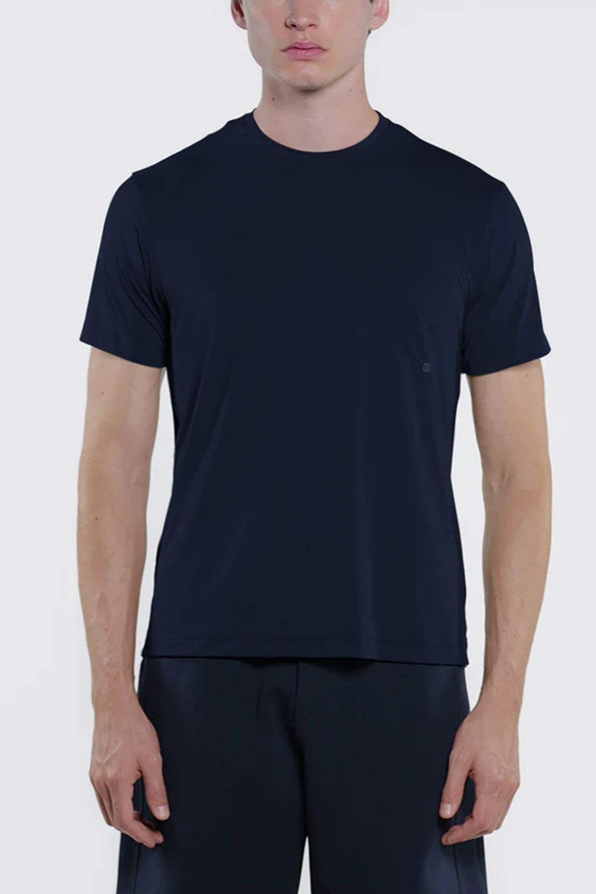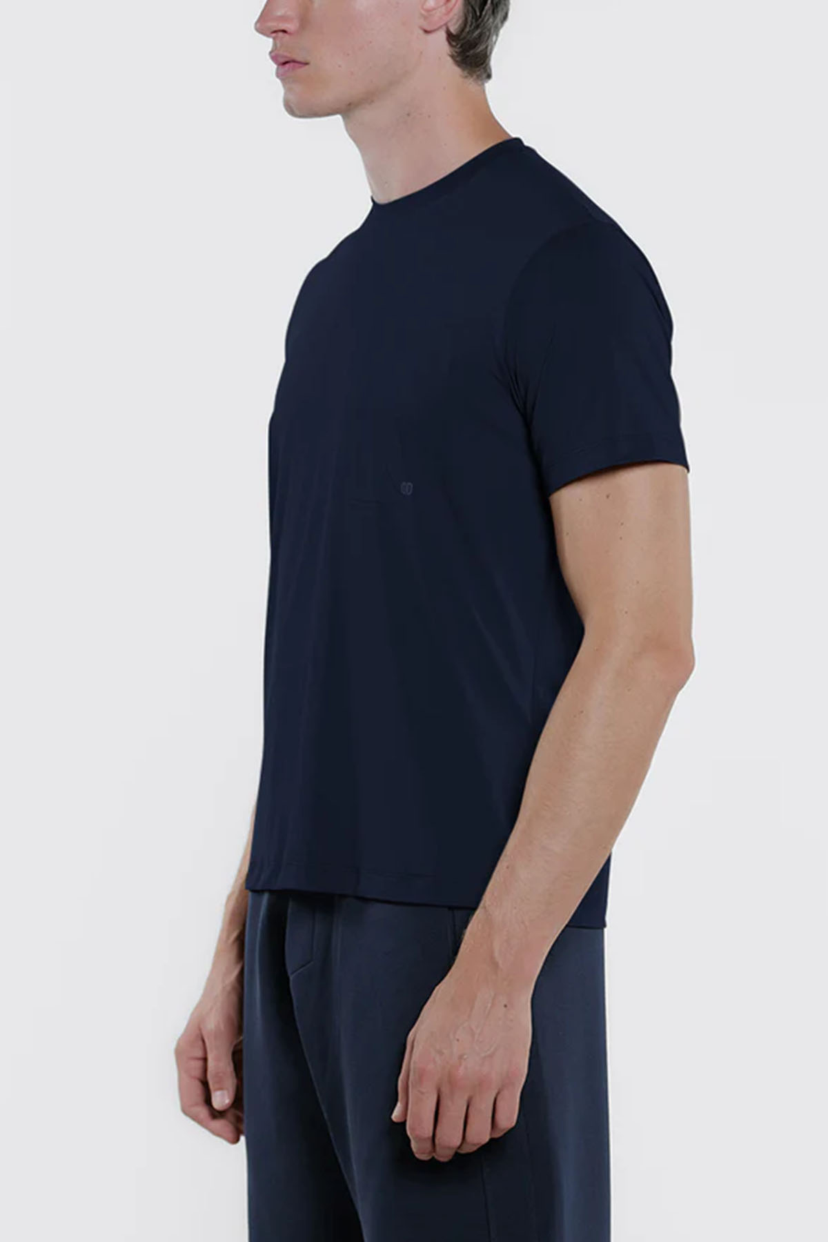 Blue crew-neck T-shirt in lightweight, two-way stretch warp-knit fabric. Patch pocket entirely laser-cut and heat-sealed to the edge. Reflective logo on the pocket.