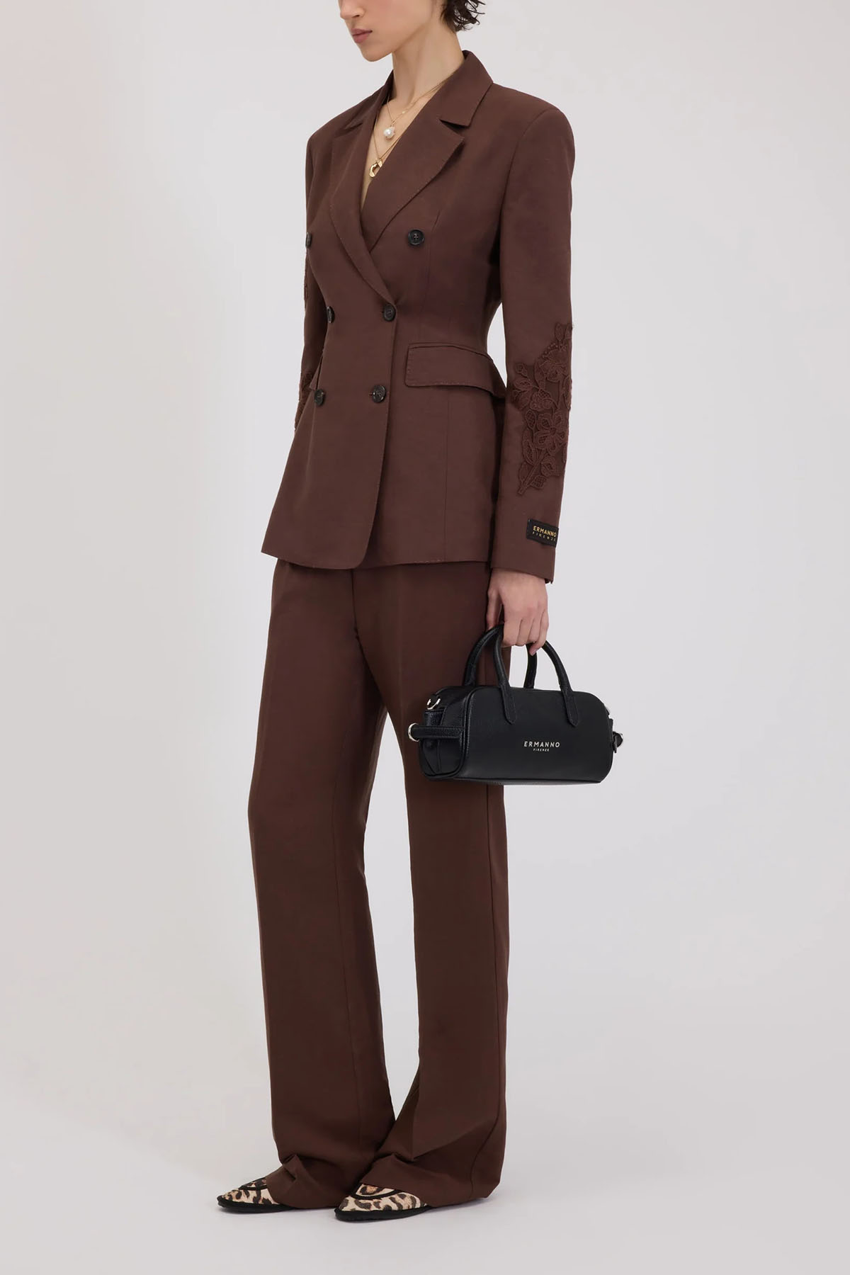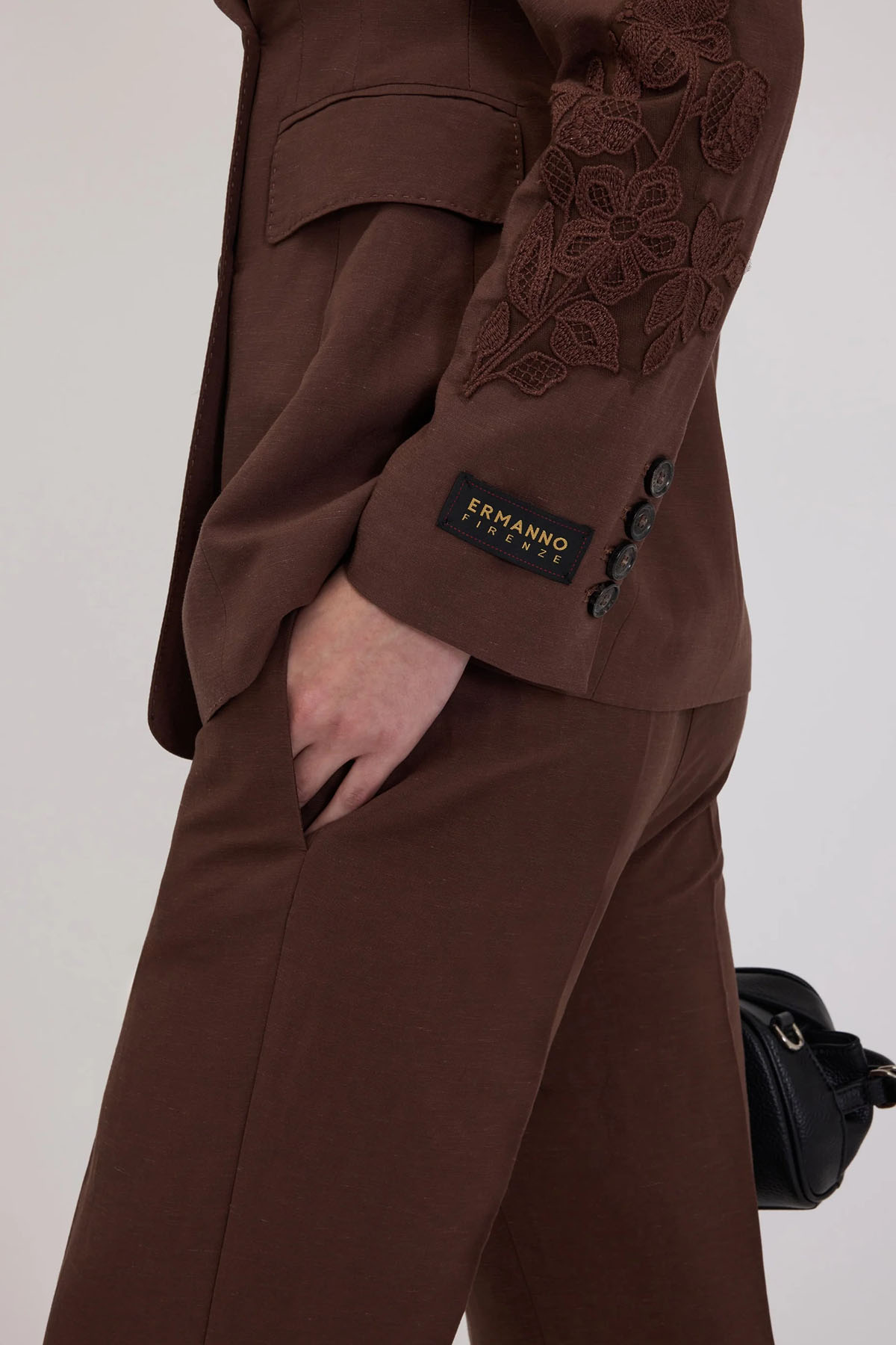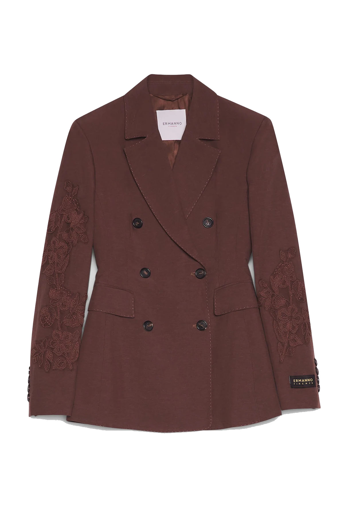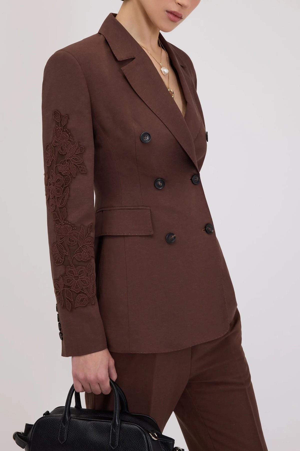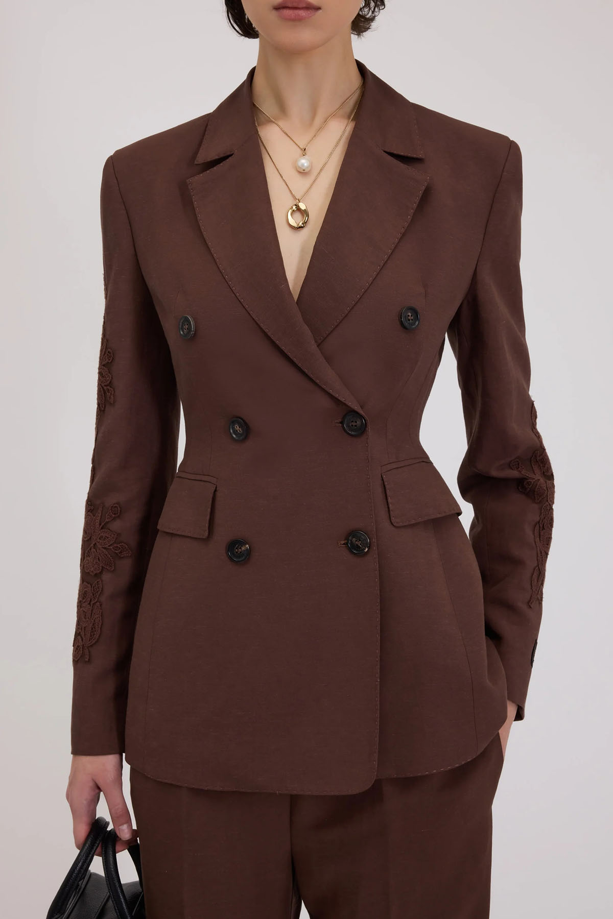 Double-breasted linen blend blazer with a fitted waist for a hyper-feminine silhouette, sleeves embellished with tone-on-tone floral embroidery, and side flap pockets.