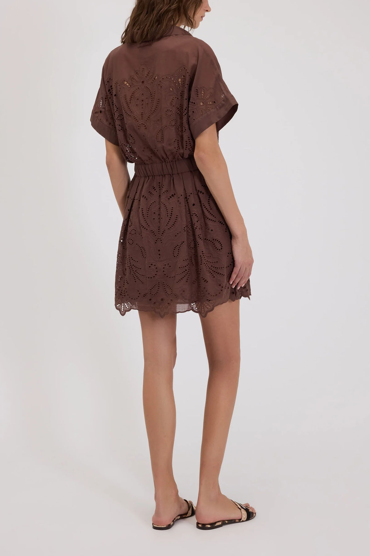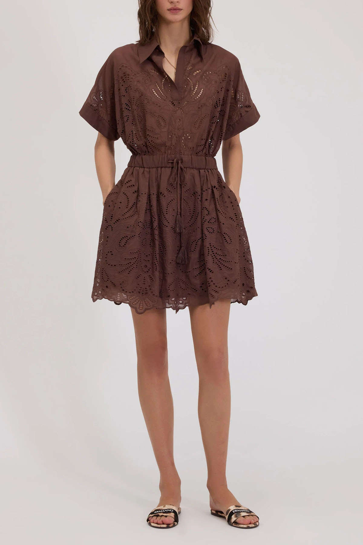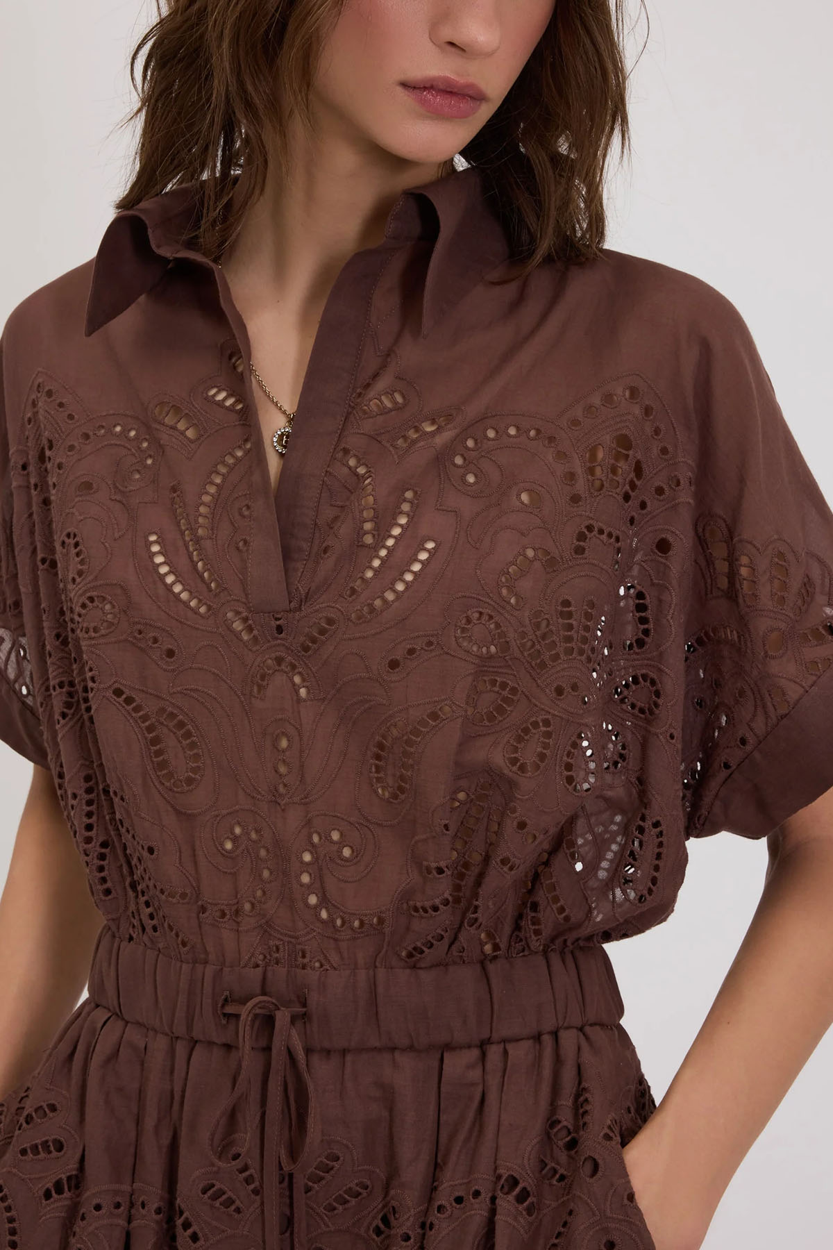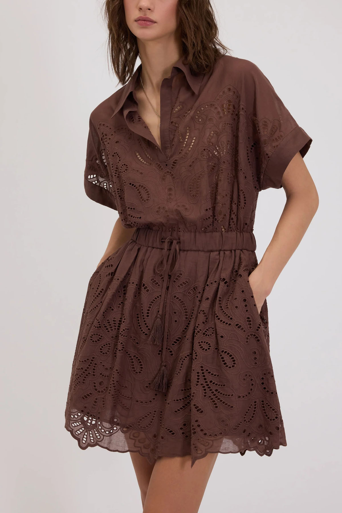 Short cotton muslin shirt dress with broderie anglaise embroidery, shirt collar, short kimono sleeves and a buttonless polo neck, a cinched waist with an internal elastic and drawstring, hidden side pockets, and lined from the waist down.