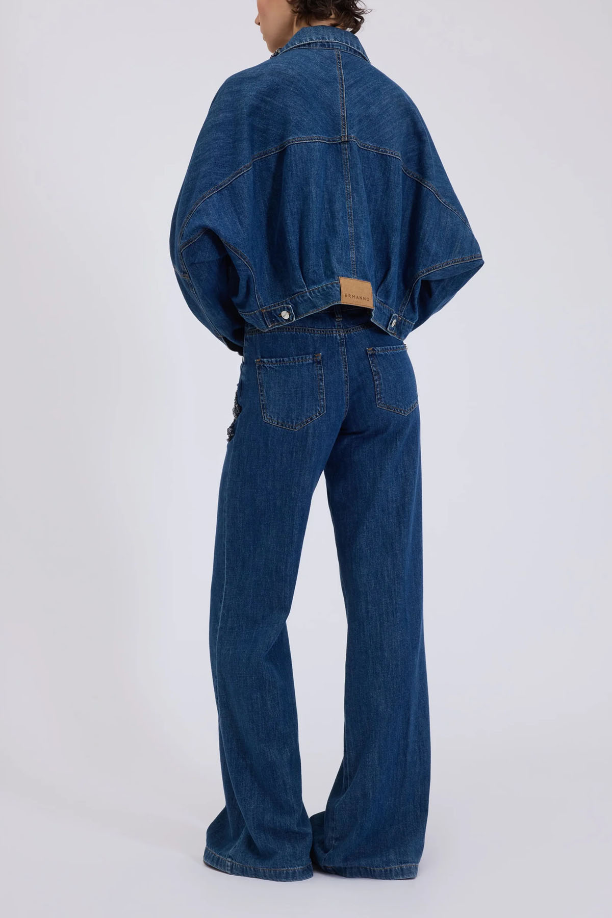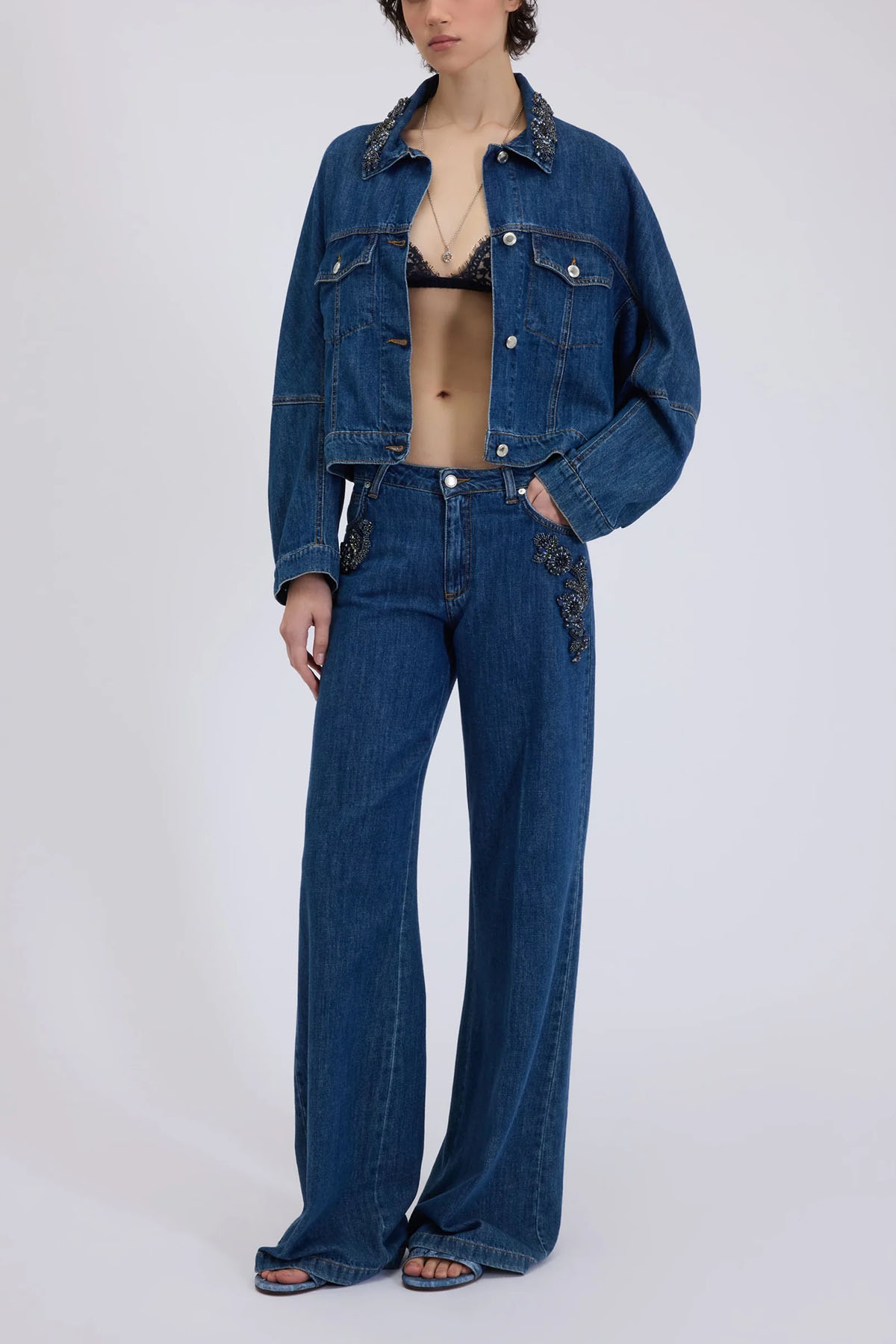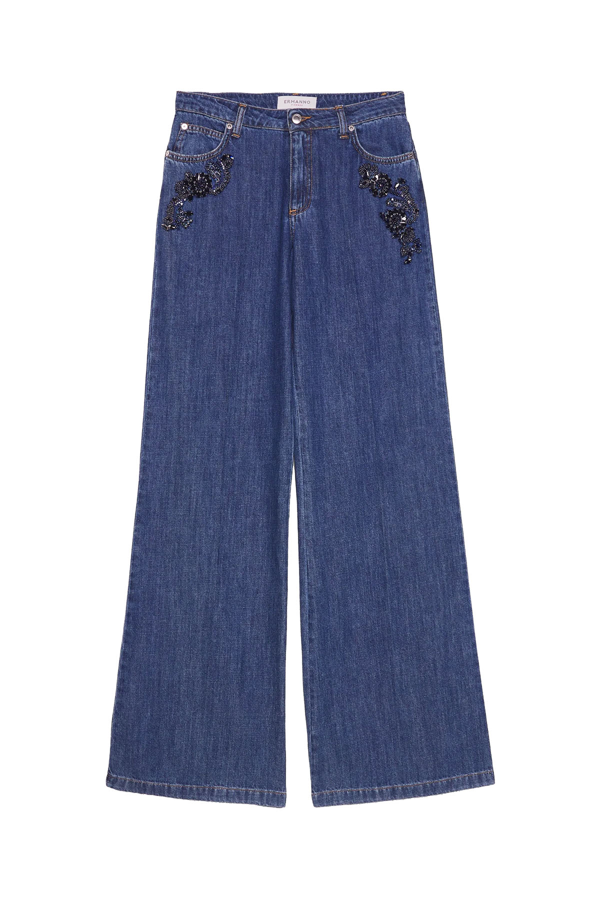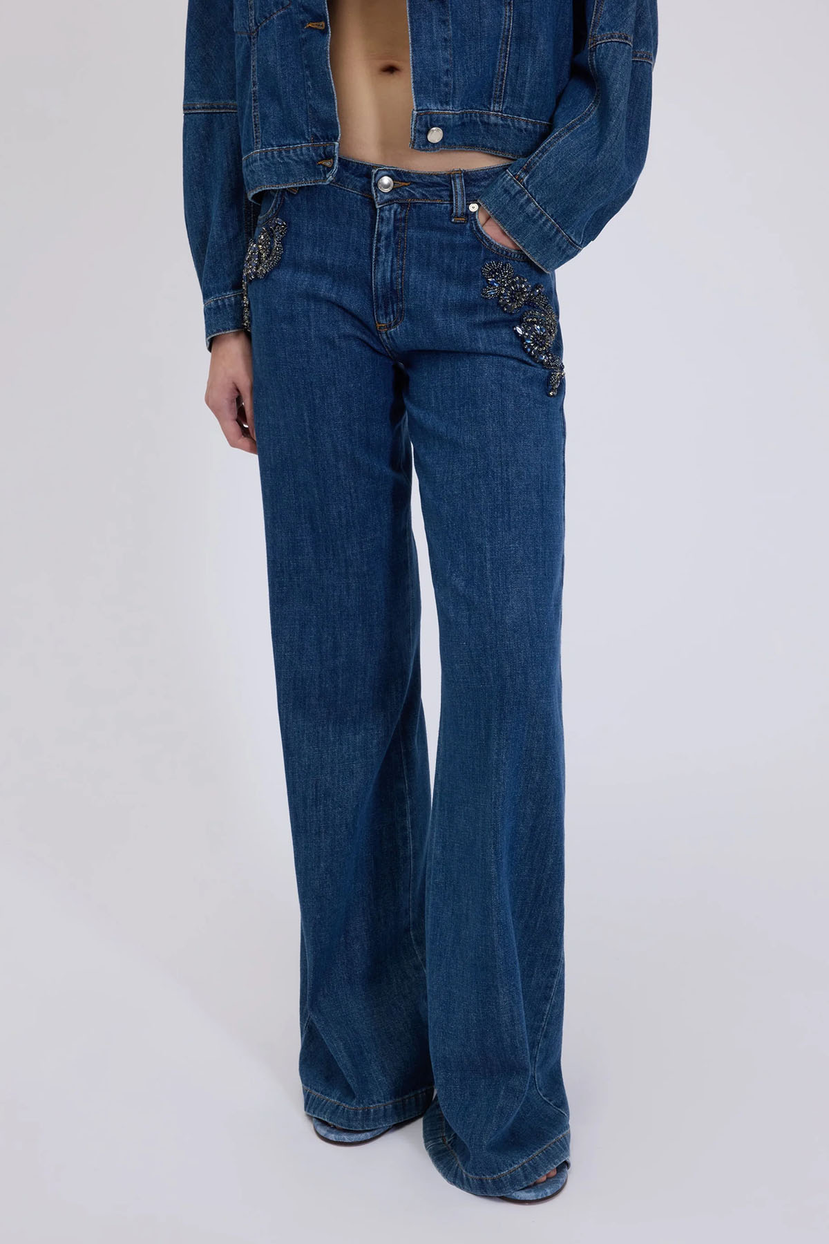 Jeans with precious blue stone embroidery on the sides, a low-rise, 5-pocket design with a regular fit through the hips and a wide, flared leg. Pure, soft, lightweight, dark blue stonewashed cotton, logo buttons and rivets, and a front zip and button closure.