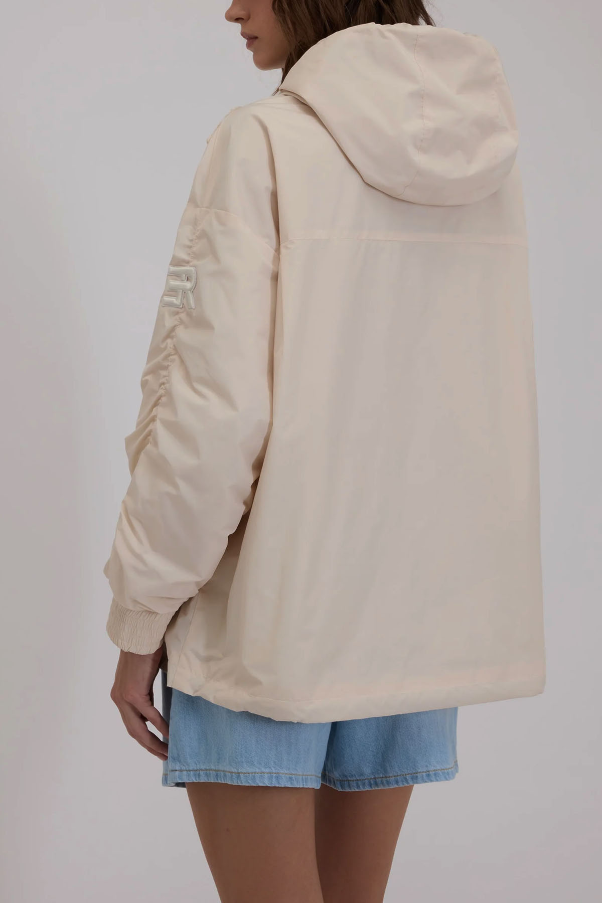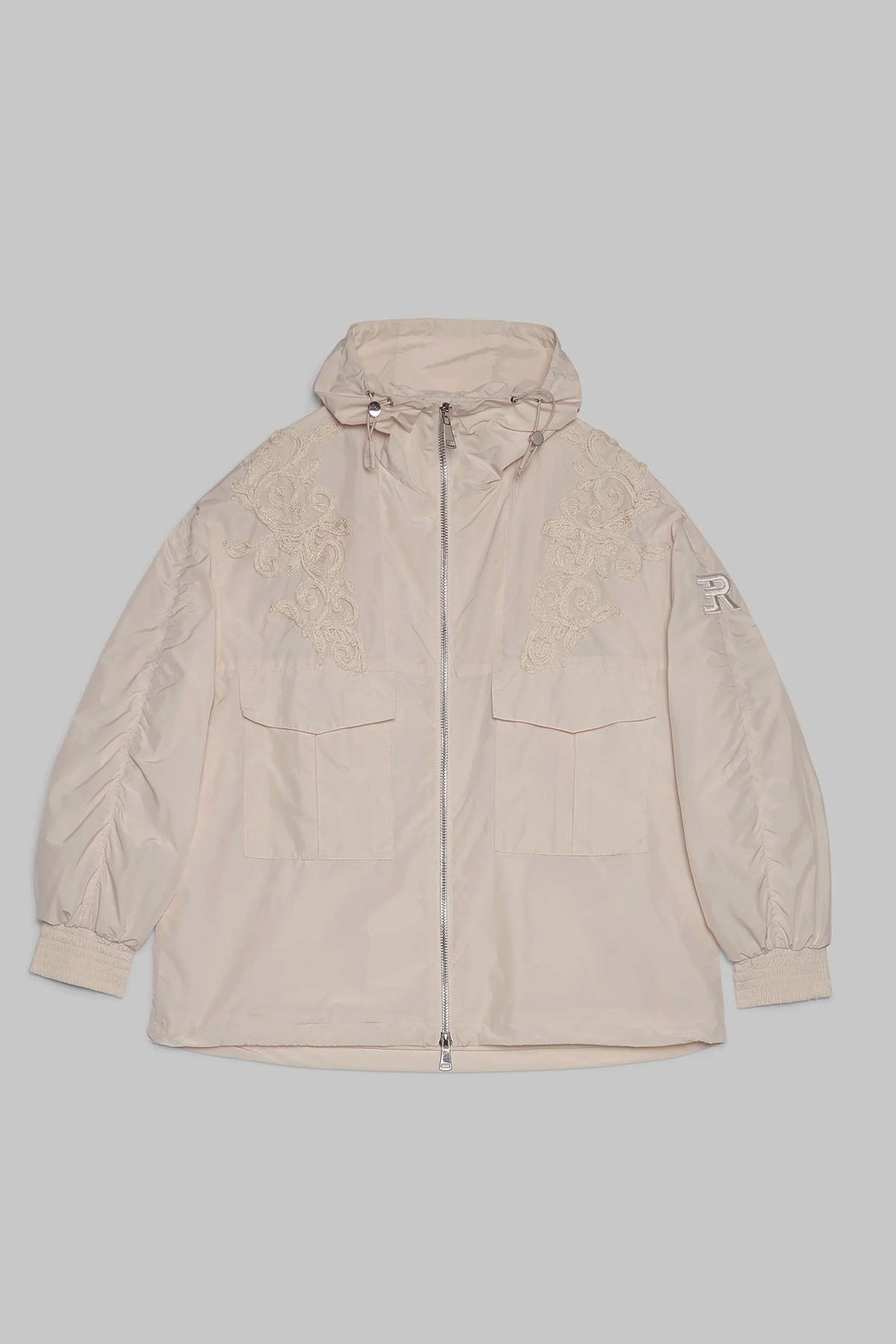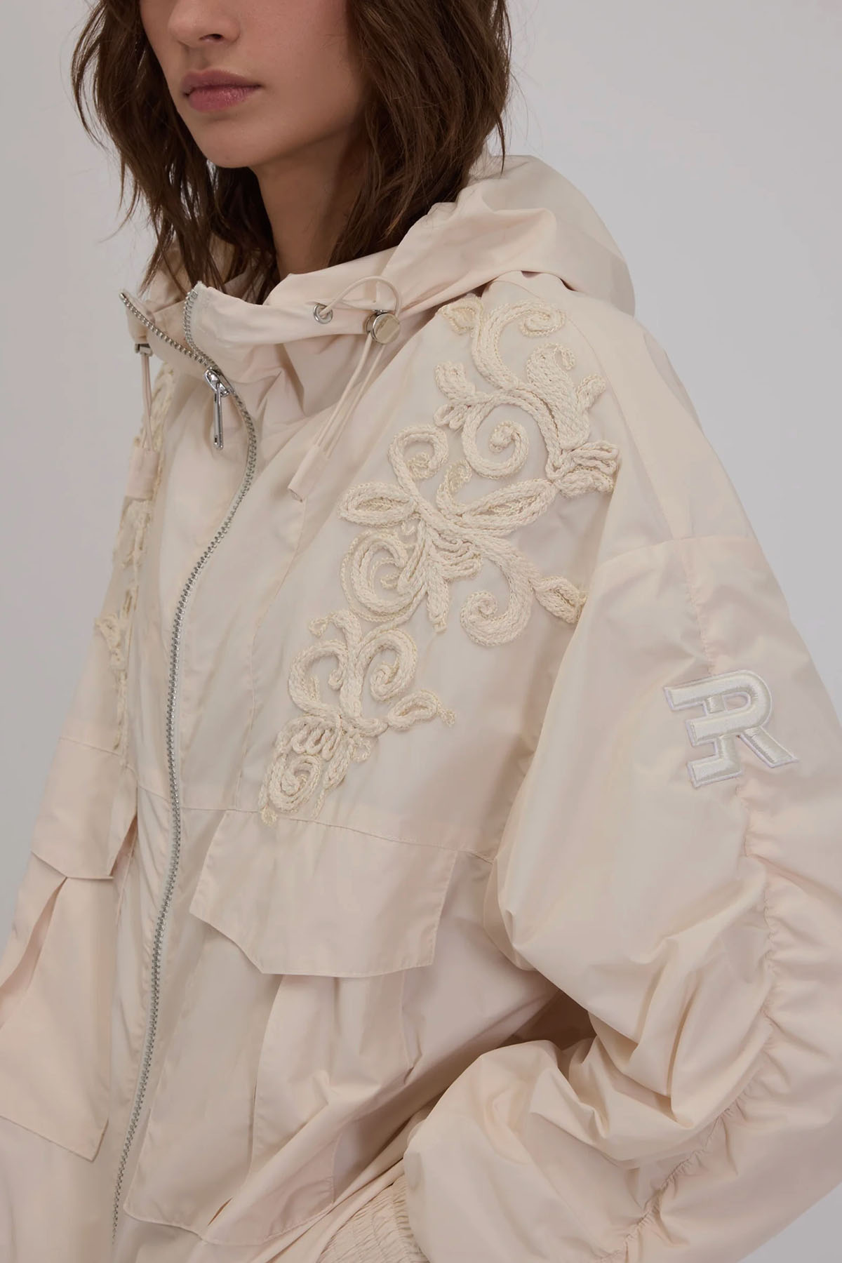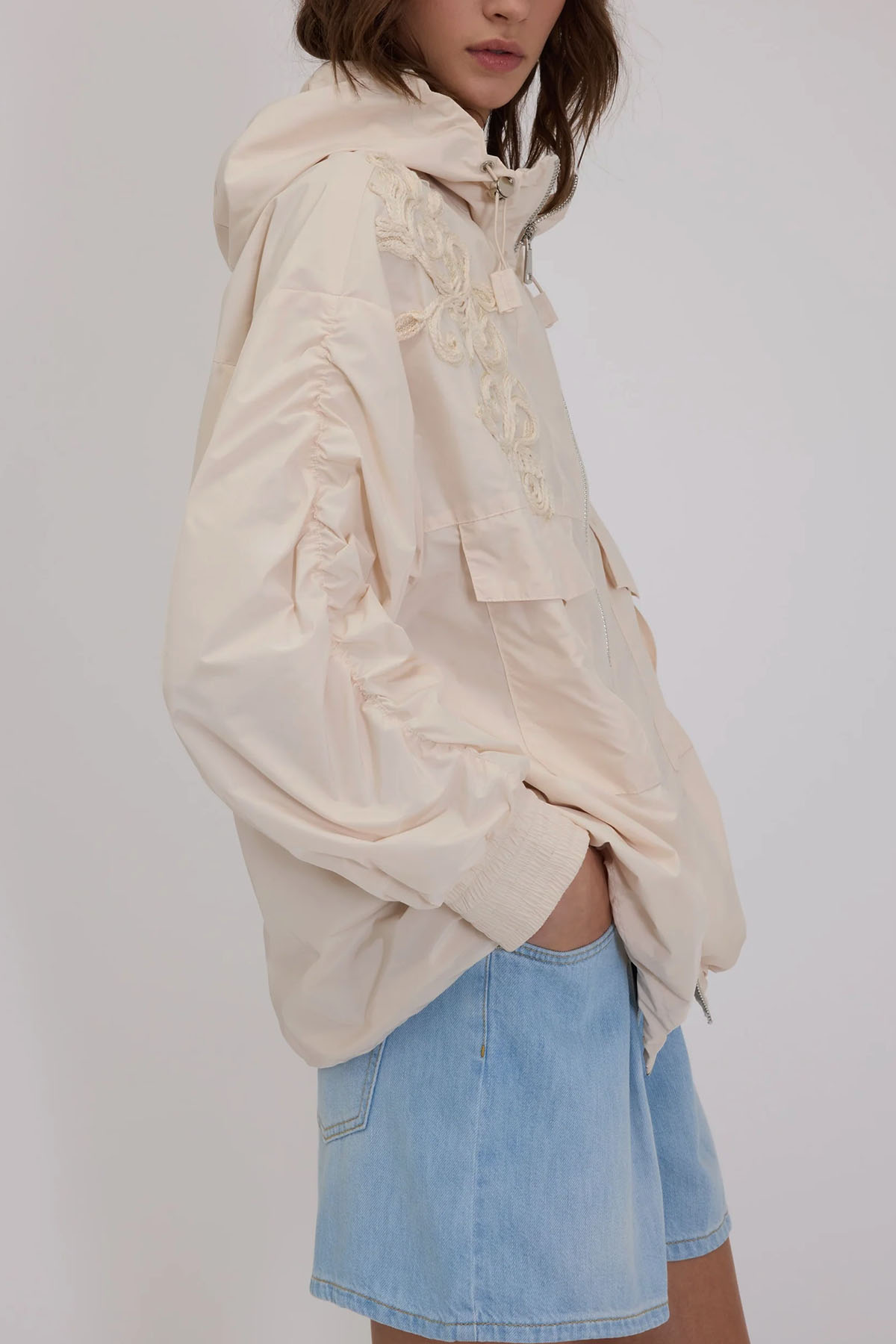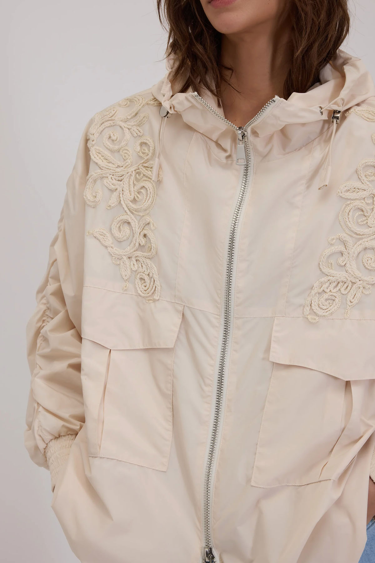 Champagne taffeta model with front cargo pockets, drawstring hood, gathered sleeves, elastic cuffs, and a matching Cornely embroidery on the front.