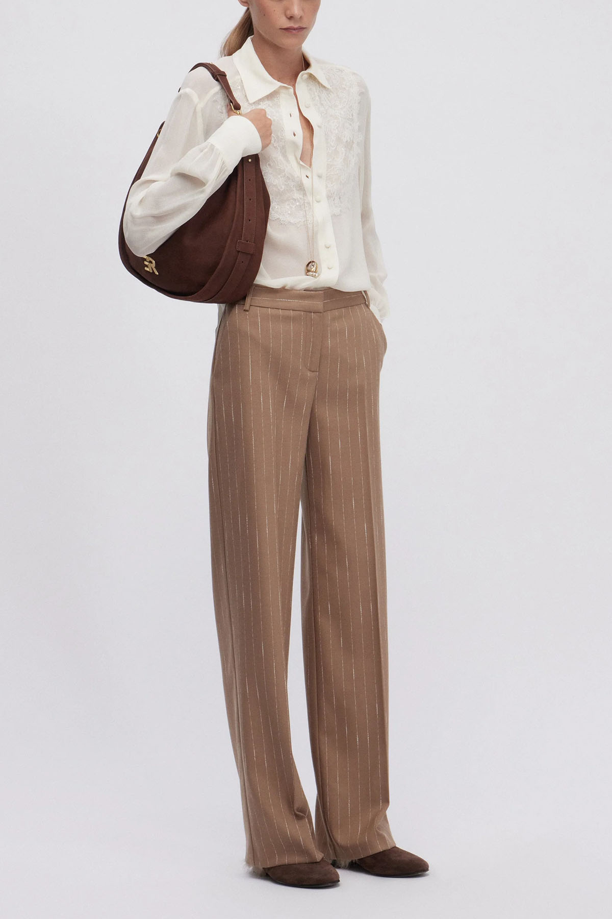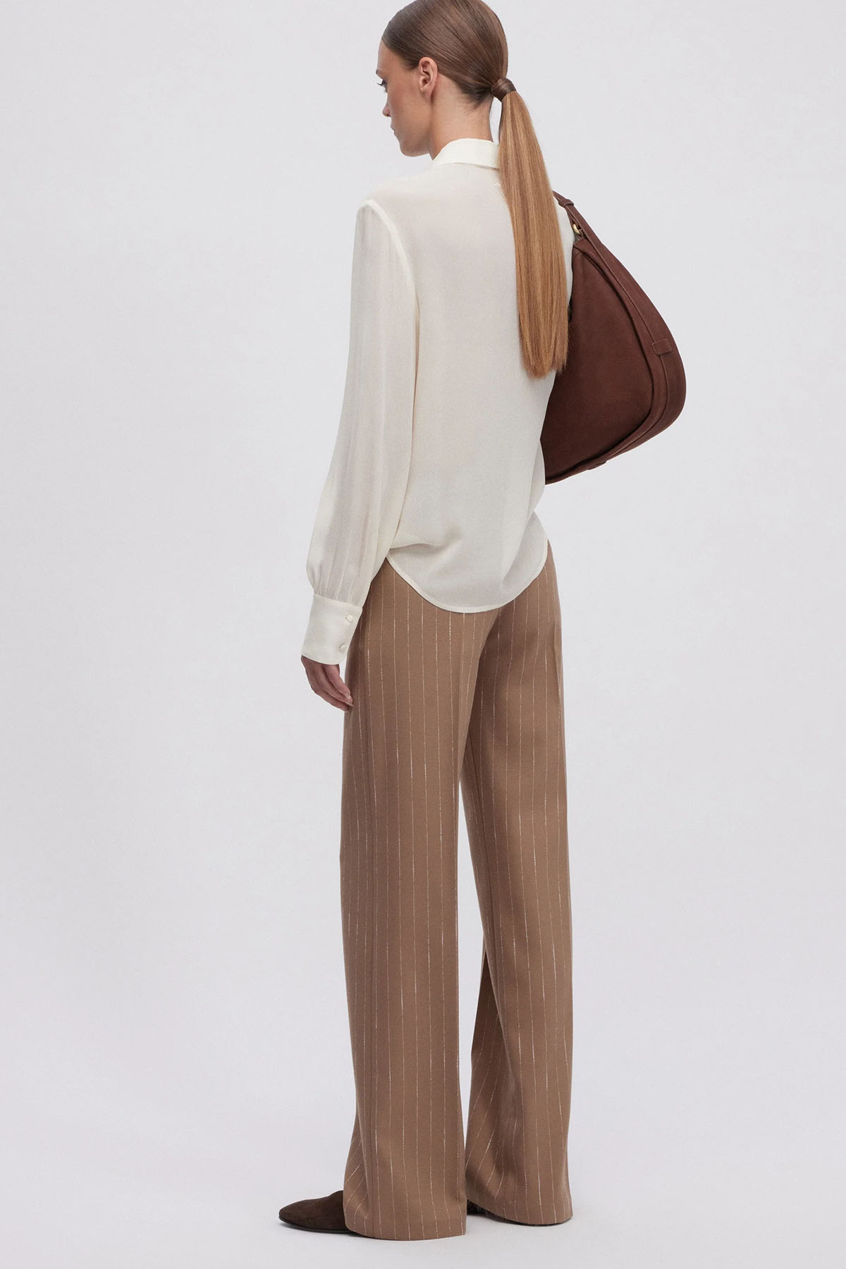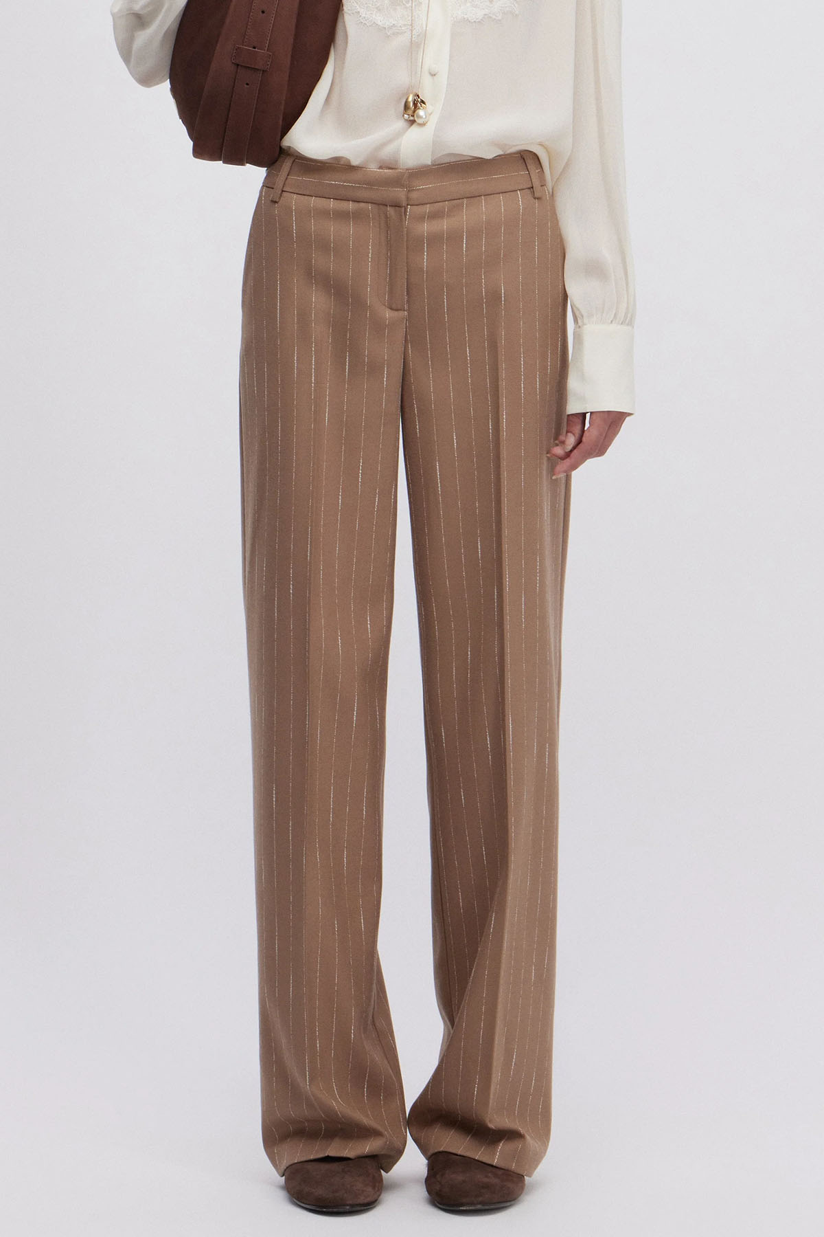 Straight-leg style in soft camel and off-white pinstripe fabric, waistband with belt loops, internal hook and zip closure, side pockets, and pressed crease.