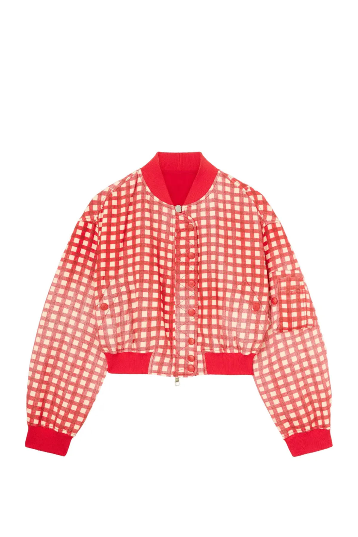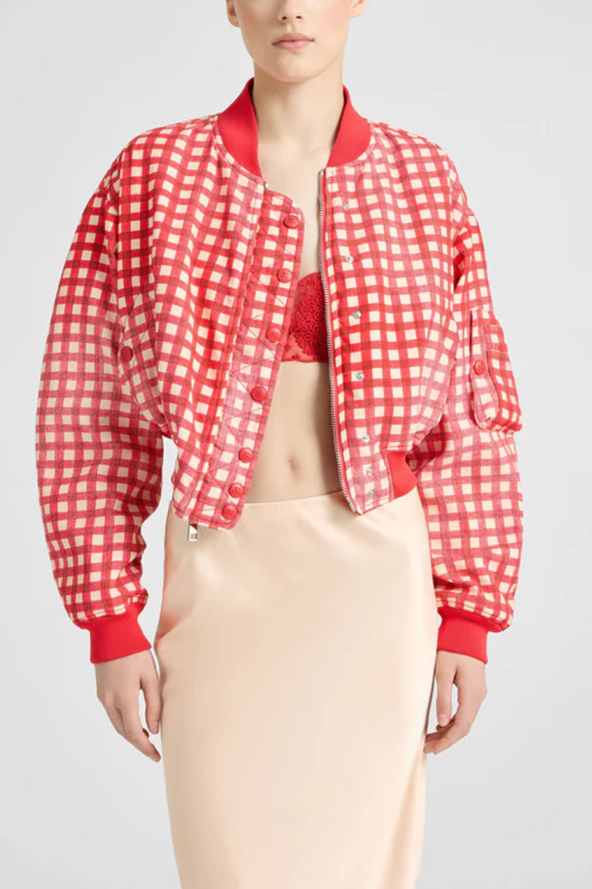 Red bomber jacket. Made of double-faced technical fabric, featuring a vibrant red and white gingham print on the inside, ribbed collar and cuffs, and side pockets with flaps and matching snaps.