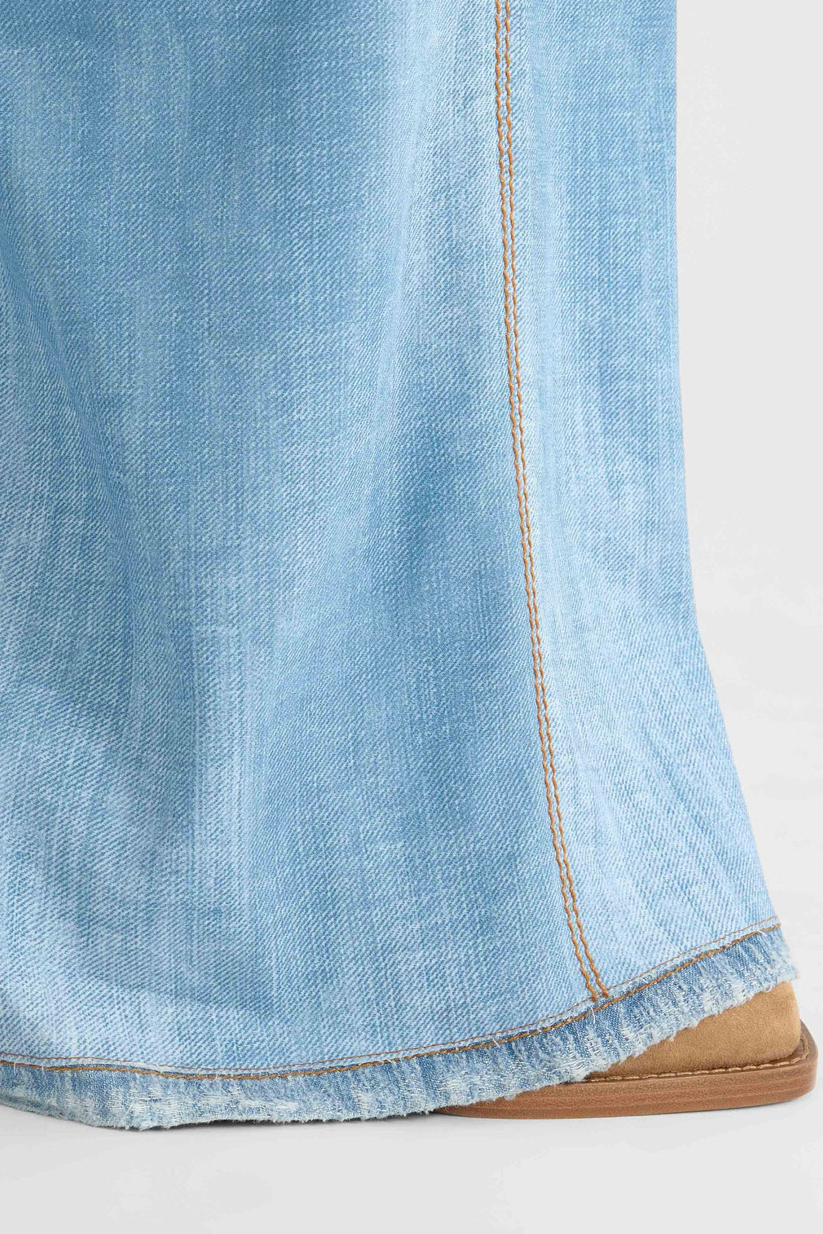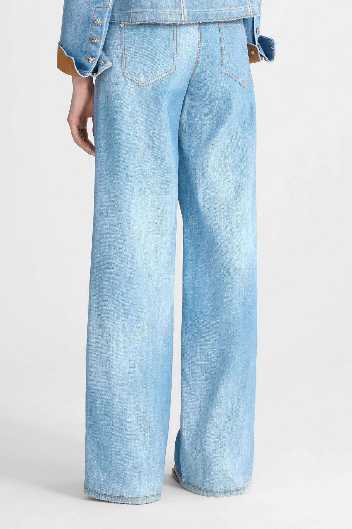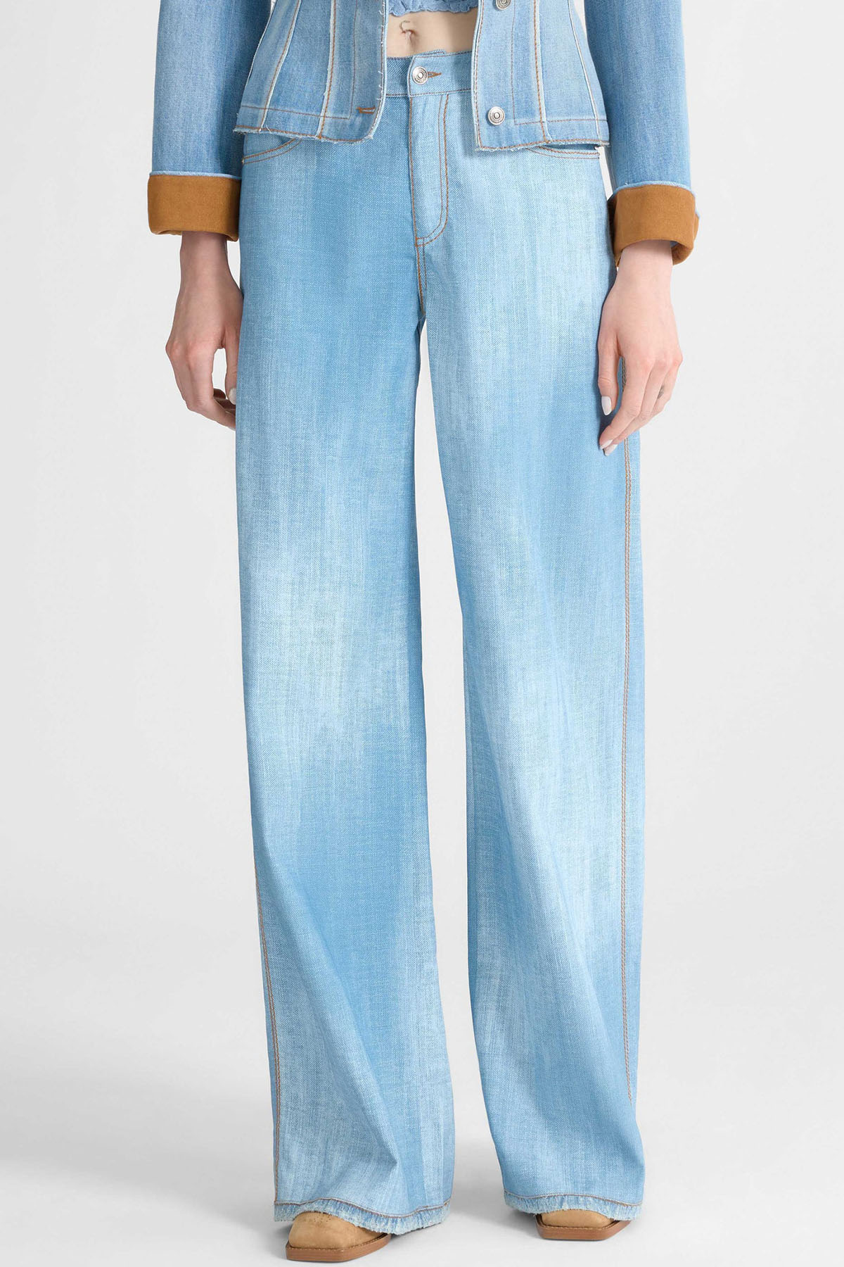Moroccan palazzo pants with a blue denim print, contrasting stitching, a regular waist, and a relaxed fit ensure comfort and ease of movement.