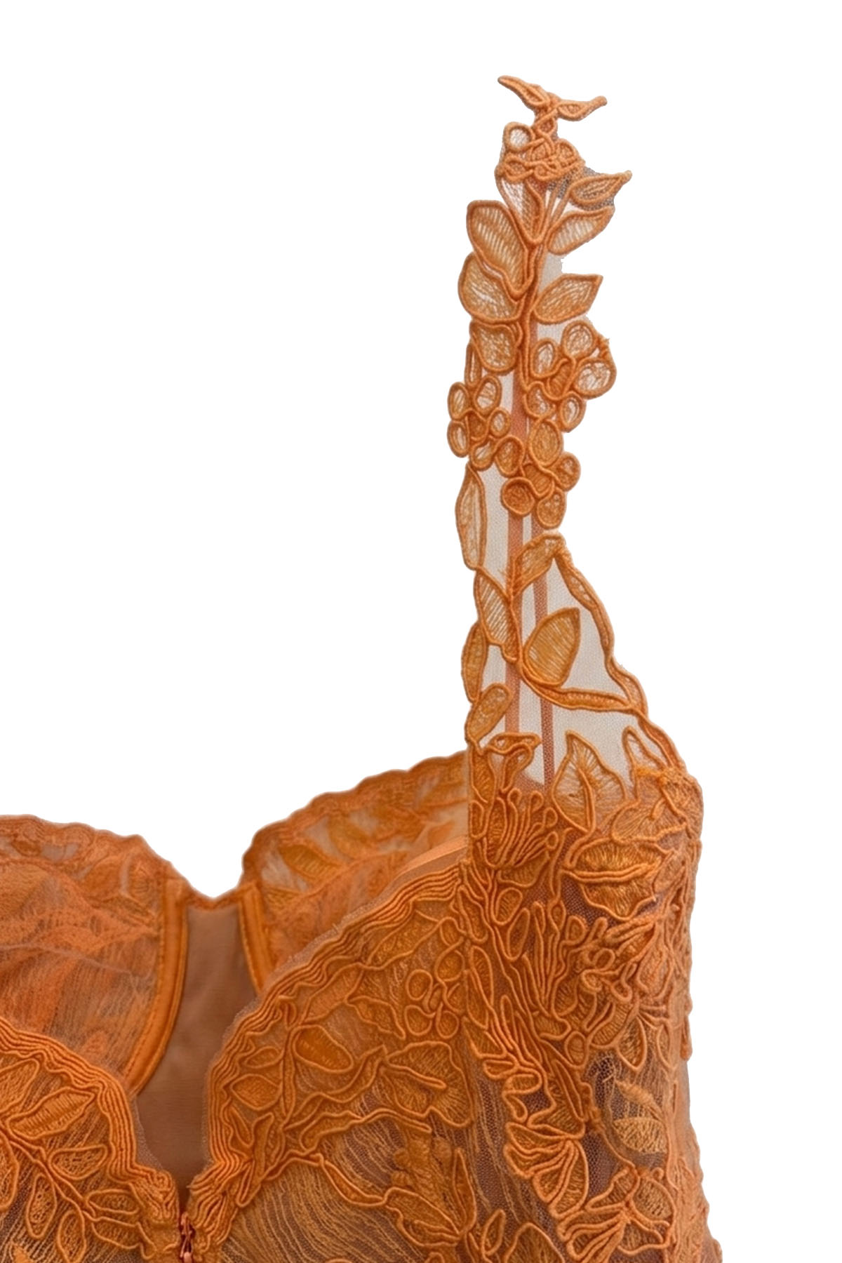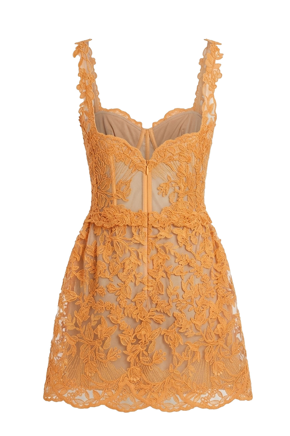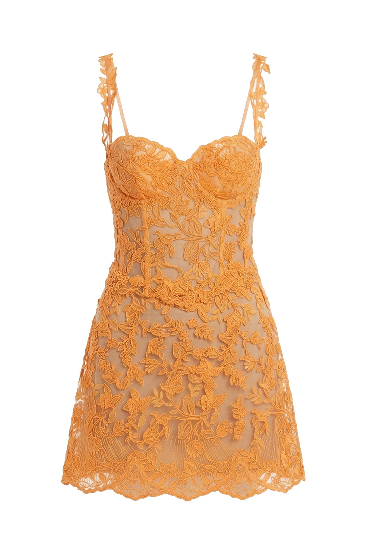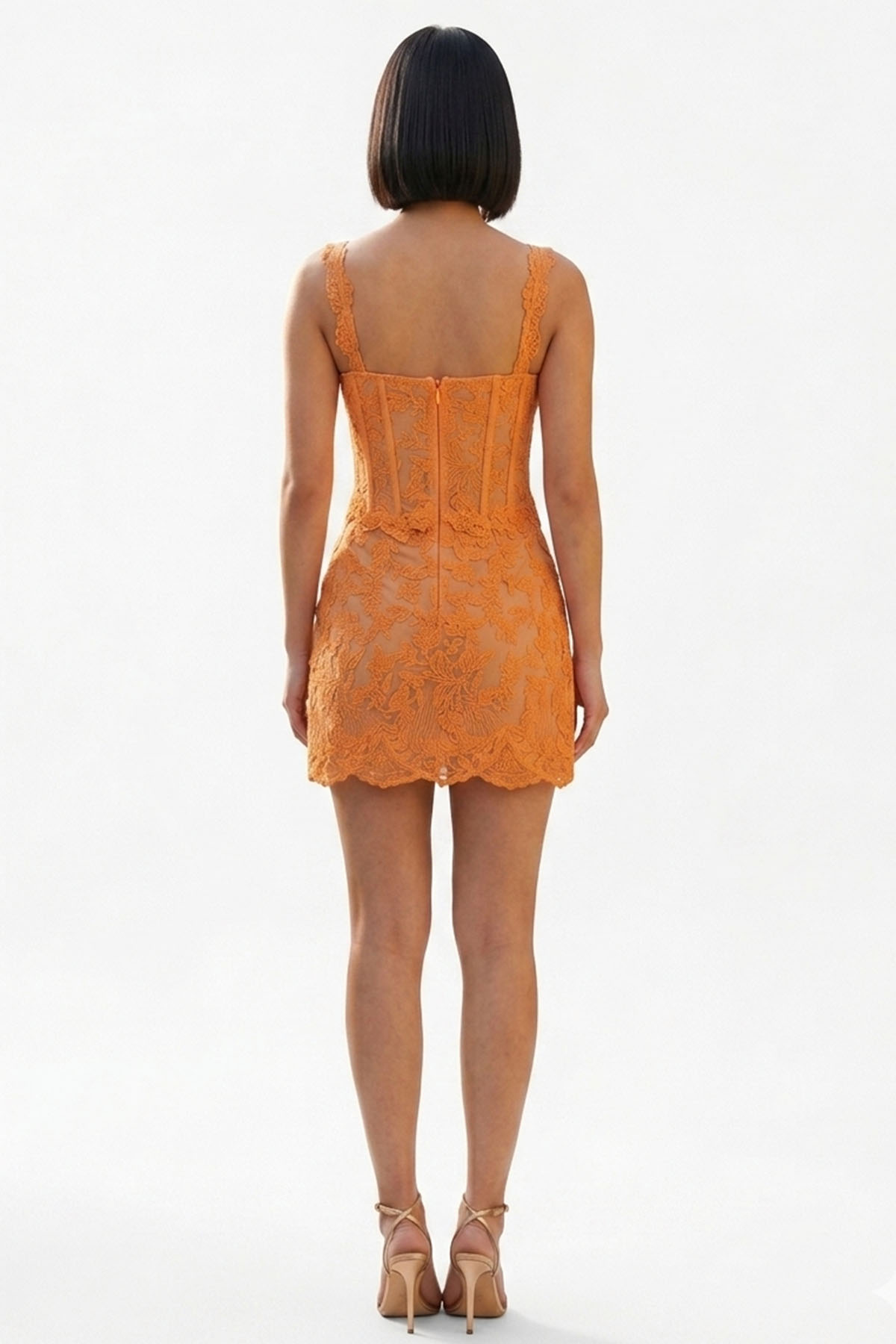 Model with built-in corset, orange color, thin lace straps, slightly flared skirt, hidden back zip closure, short design.