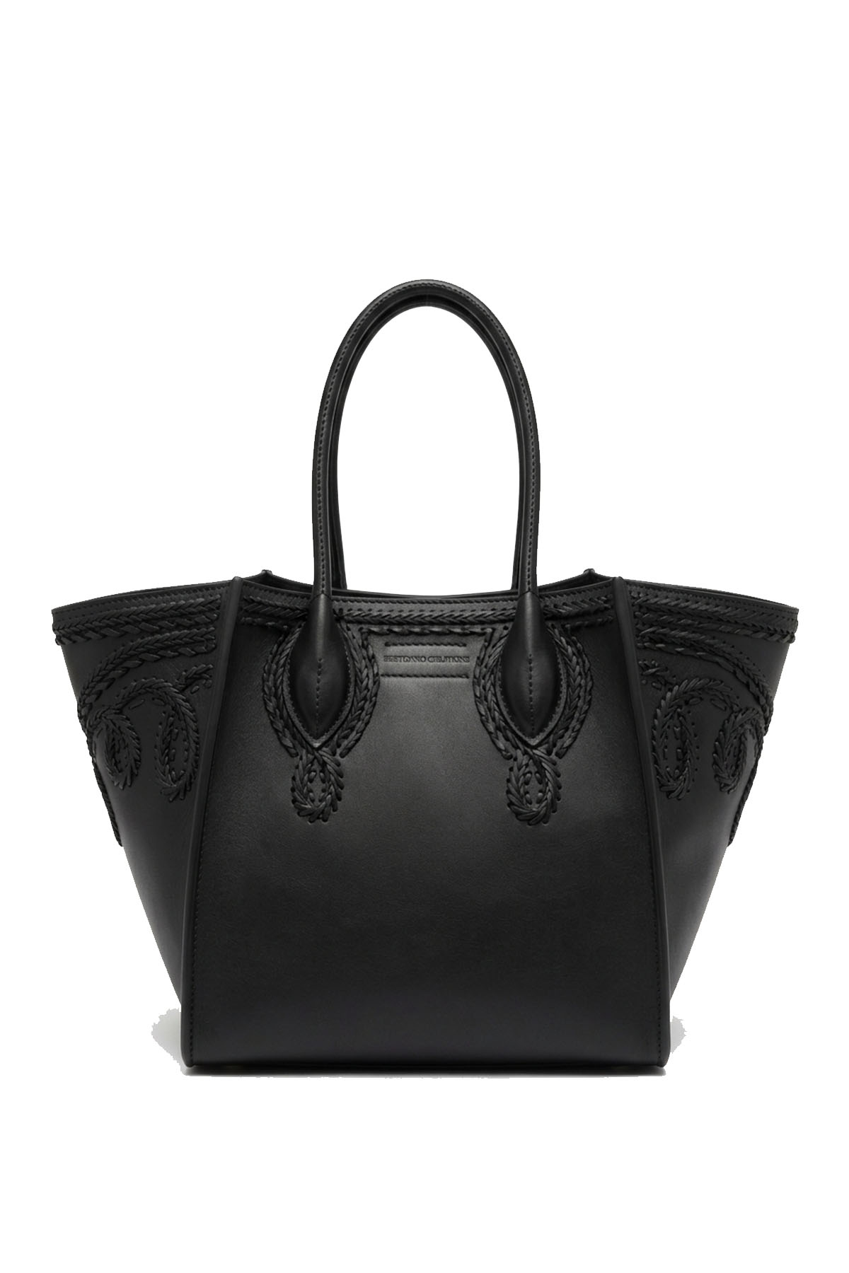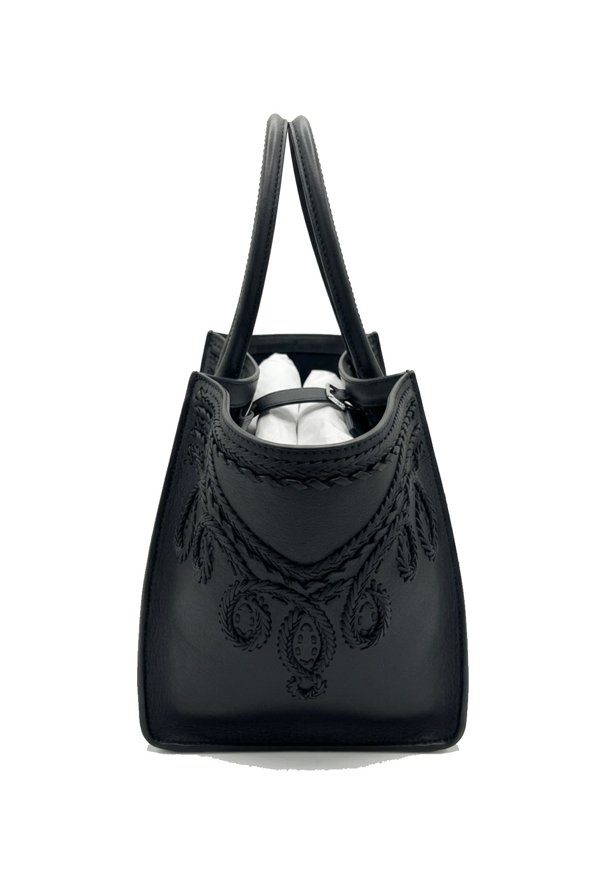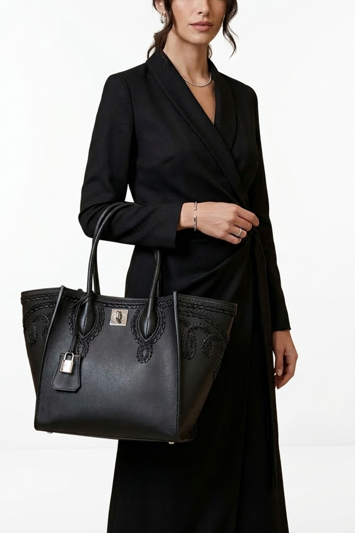 Maggie bag in smooth calfskin with double handle and matching split leather interior, tone-on-tone embroidery, personalized closure with a logoed and banded padlock, and metal studs on the bottom. Detachable and adjustable leather shoulder strap.