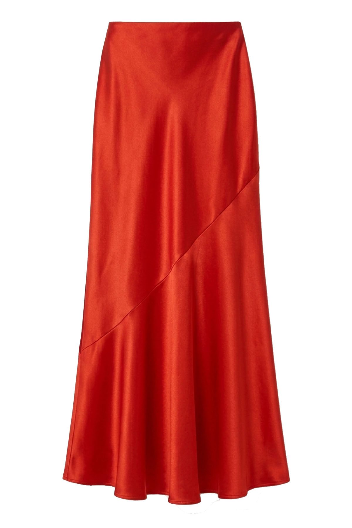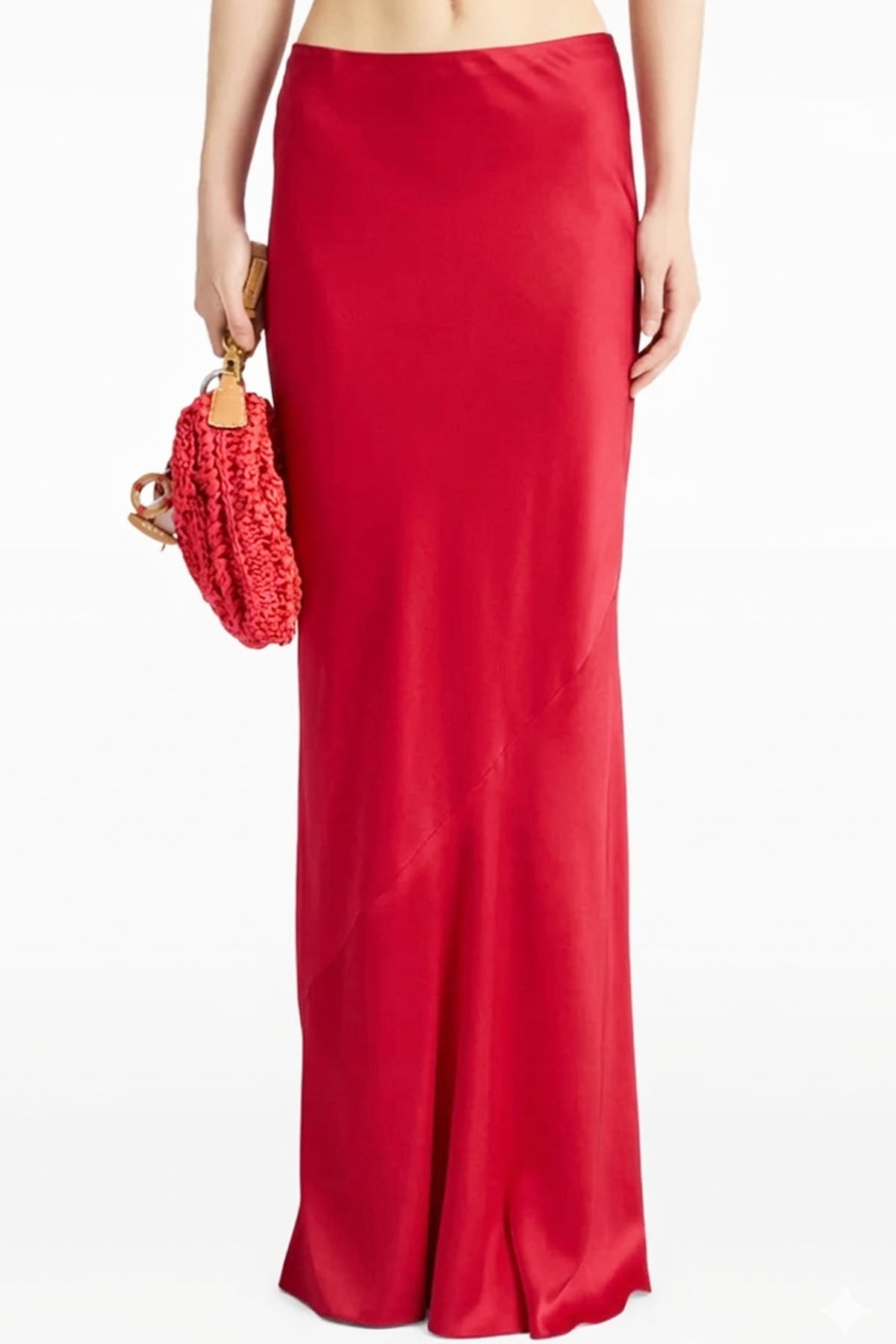 red Skirt made of matte viscose satin, a concealed side zip closure ensures a clean and discreet fit, and a mid-length design.