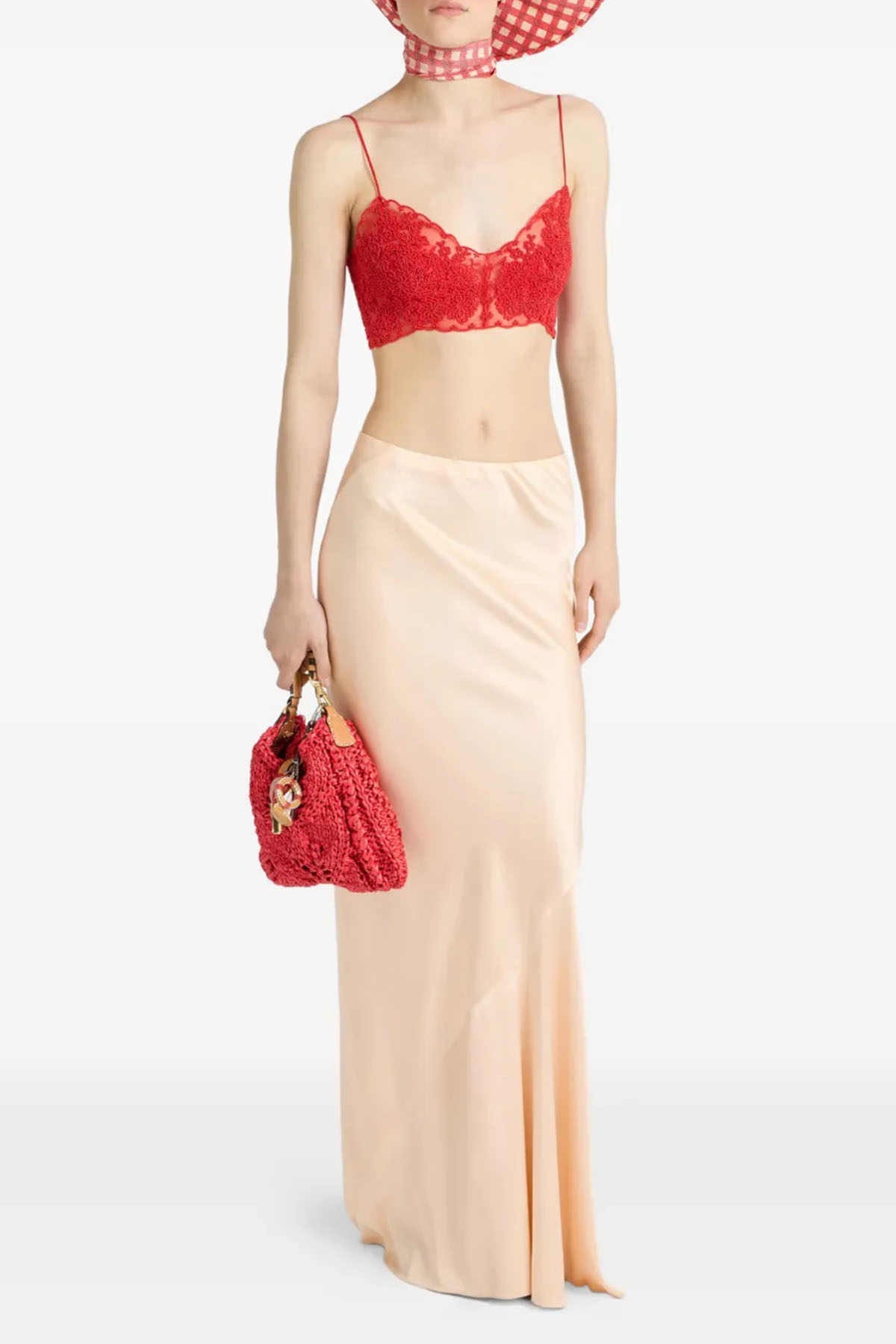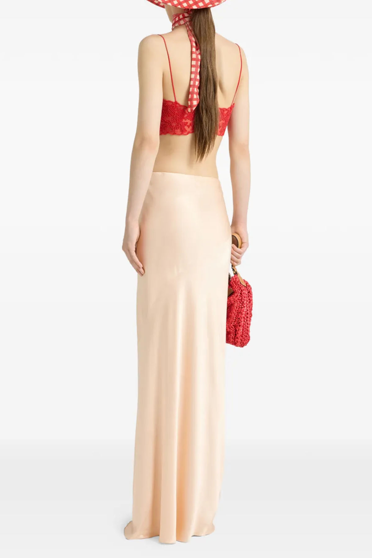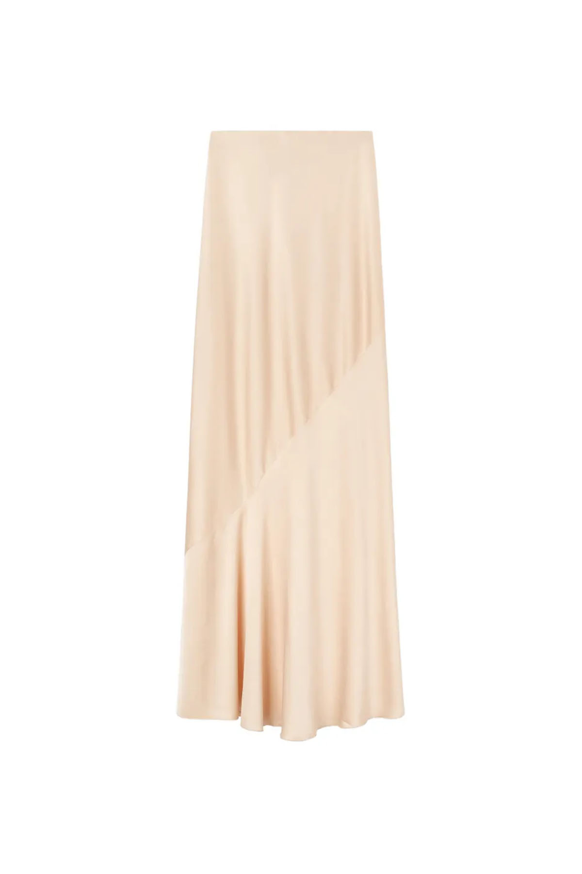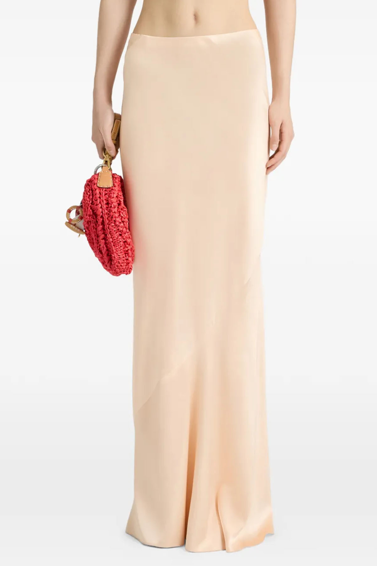 Skirt made of matte viscose satin, a concealed side zip closure ensures a clean and discreet fit, and a mid-length design.