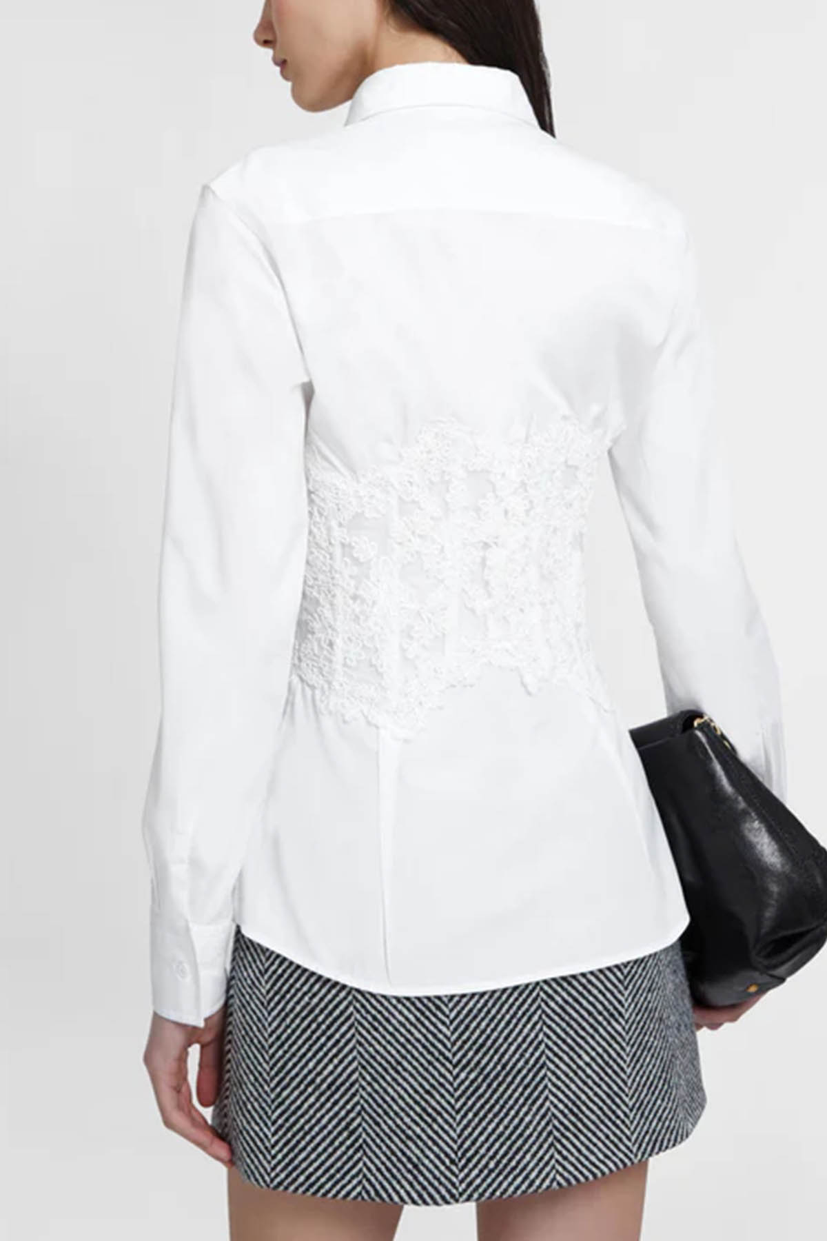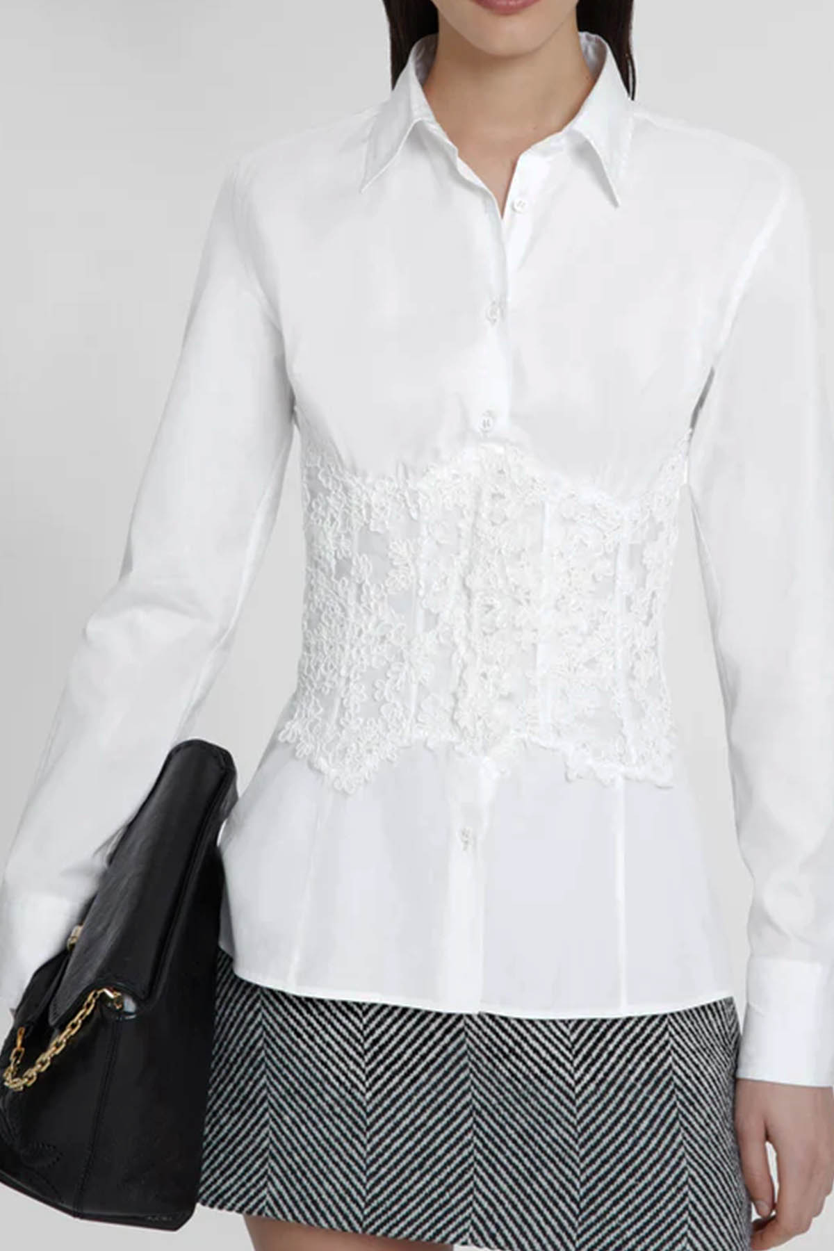 Crafted from cotton poplin, this classic collar, long sleeves, and button-front design sculpts the silhouette with refined bustier-style boning at the waist, embellished with a sophisticated rebrodé lace insert, designed exclusively for Ermanno Scervino.