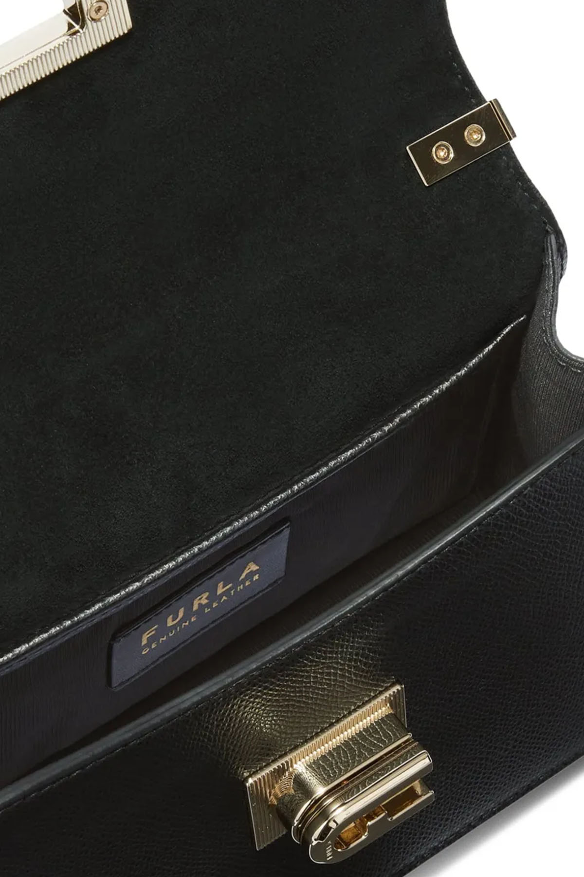 Mini bag to be worn over the shoulder or cross-body, black. Made of fine grained embossed leather. Open interior pocket for credit cards and documents. Open exterior pocket on the back. Fixed chain shoulder strap with adjustable matching leather strap. Twist lock with Arco logo.