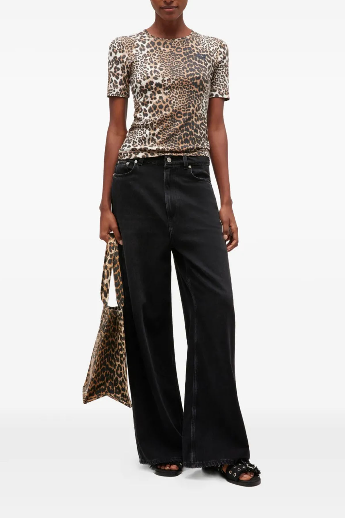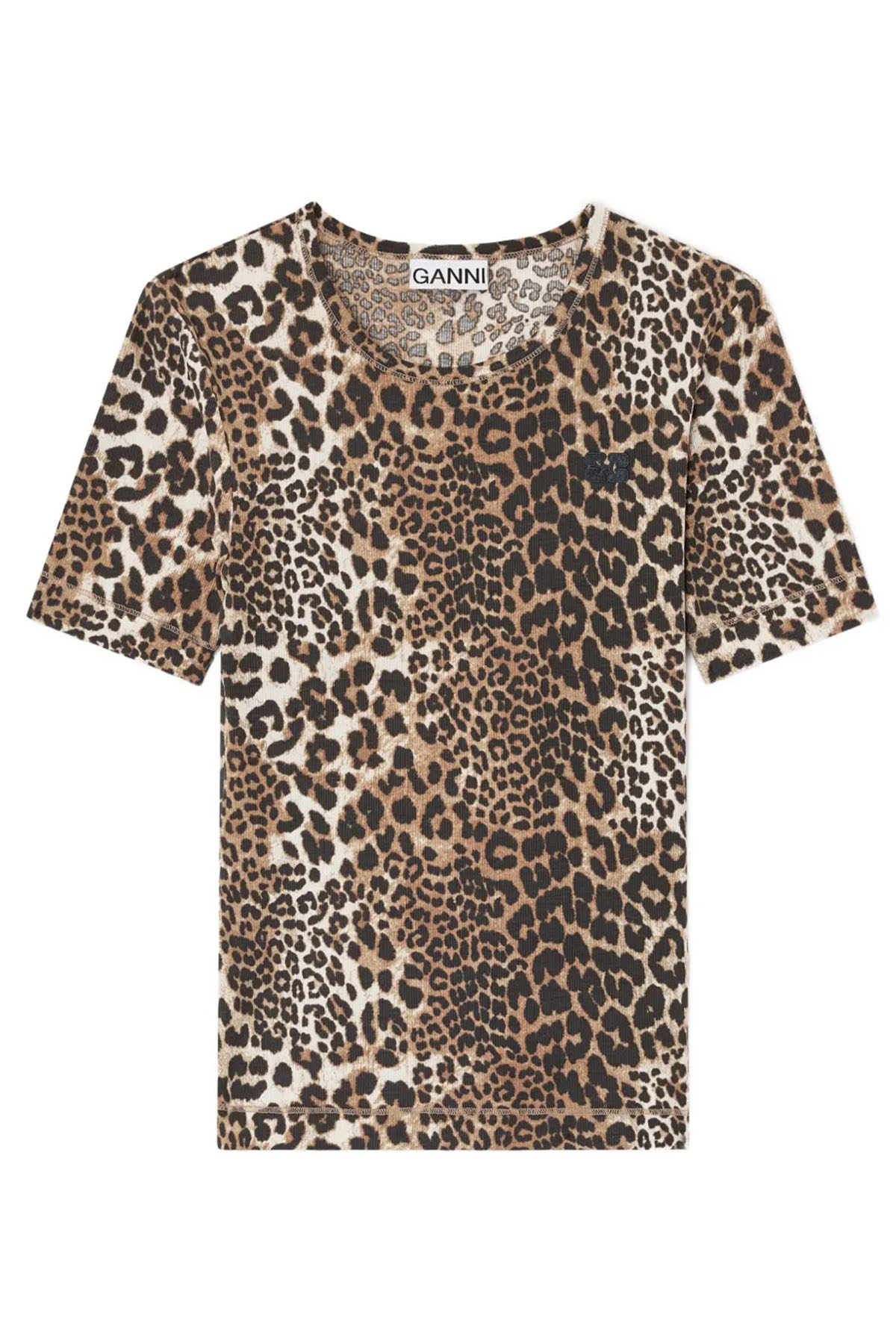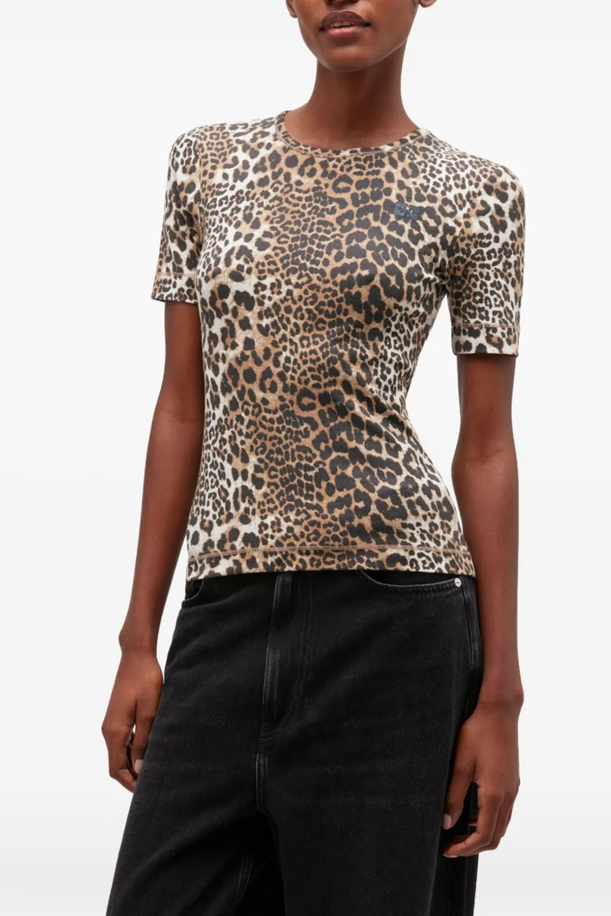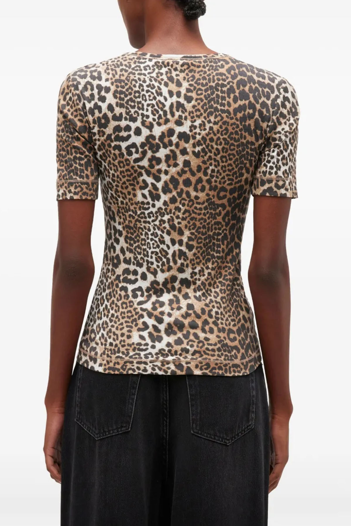 Crew neck, short sleeves, embroidered logo, leopard print, ribbed knit, straight hem.