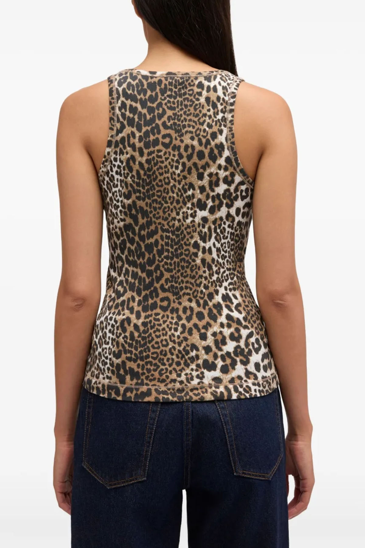 Leopard print, logo appliqué, crew neck, sleeveless, ribbed knit.