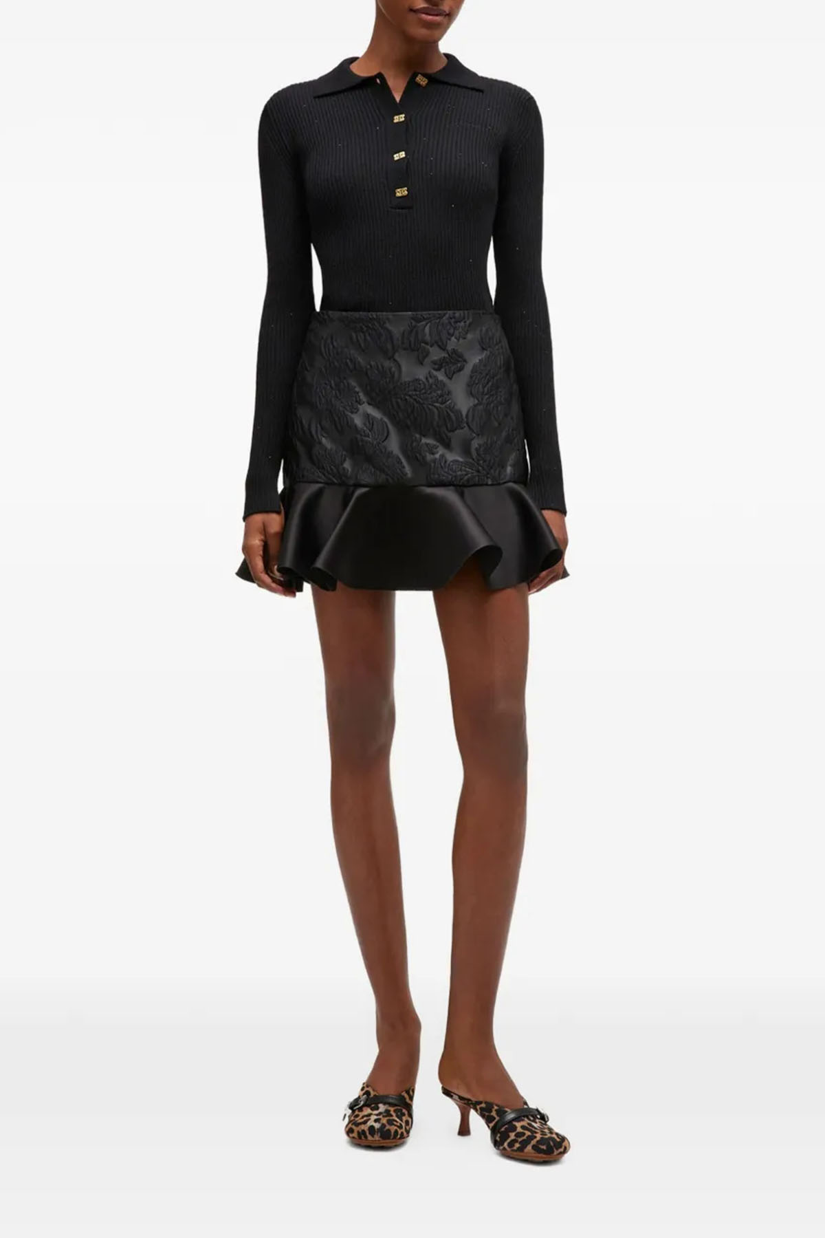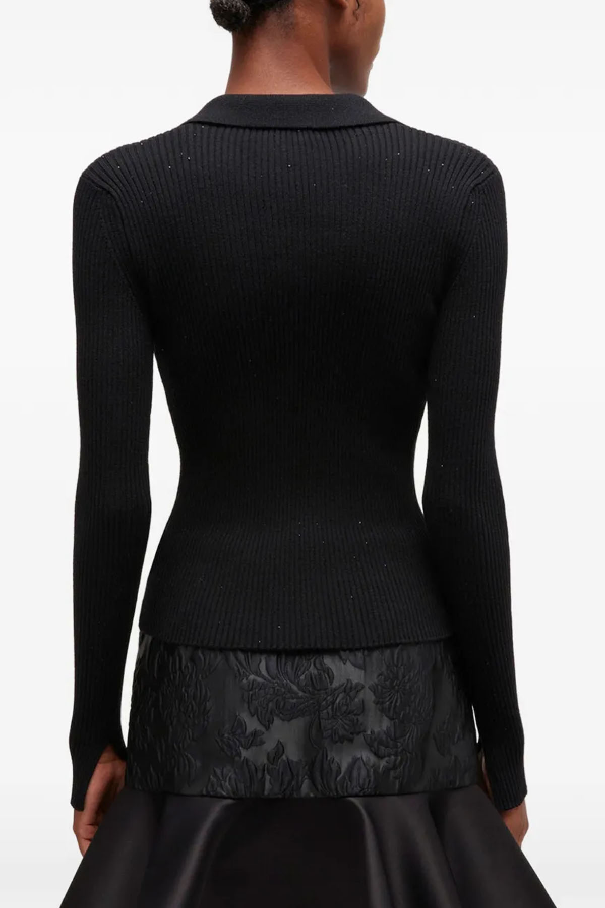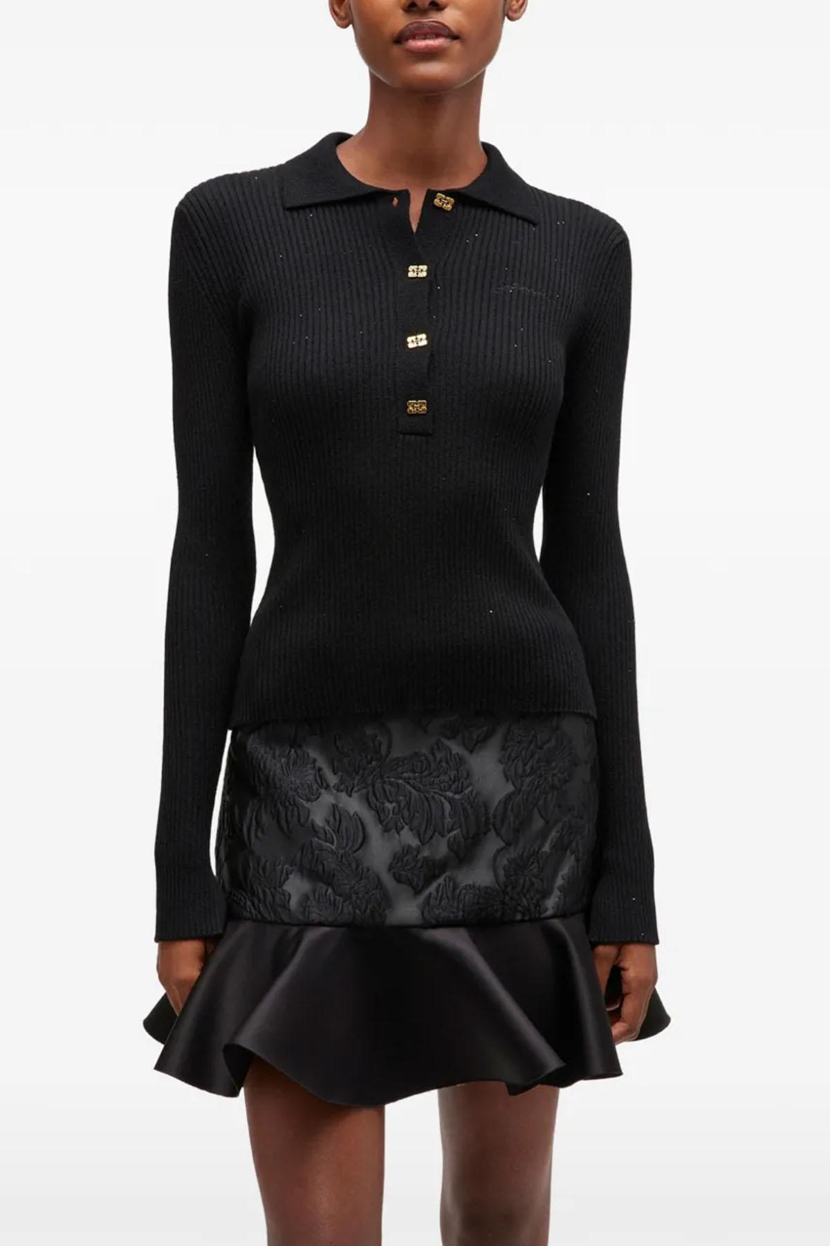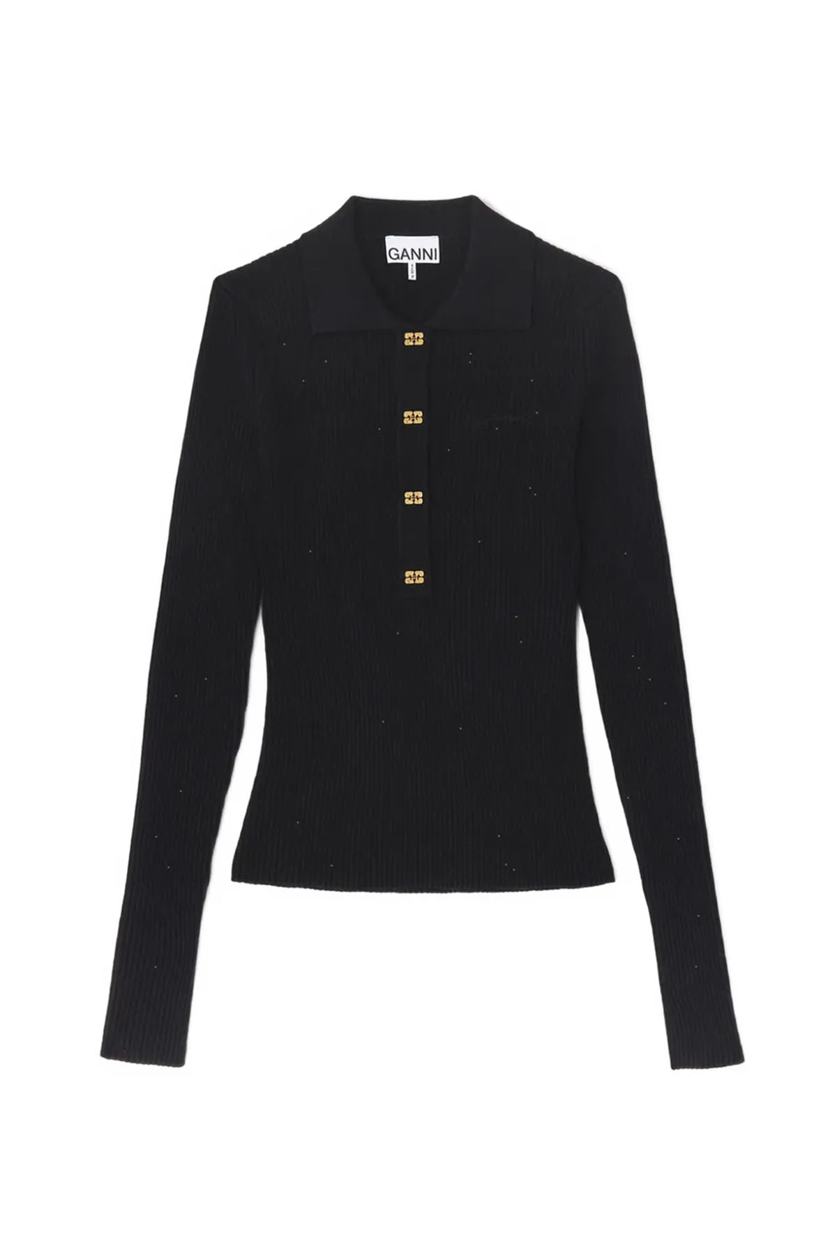 Black polo shirt, ribbed knit, point collar, front button closure, long sleeves.