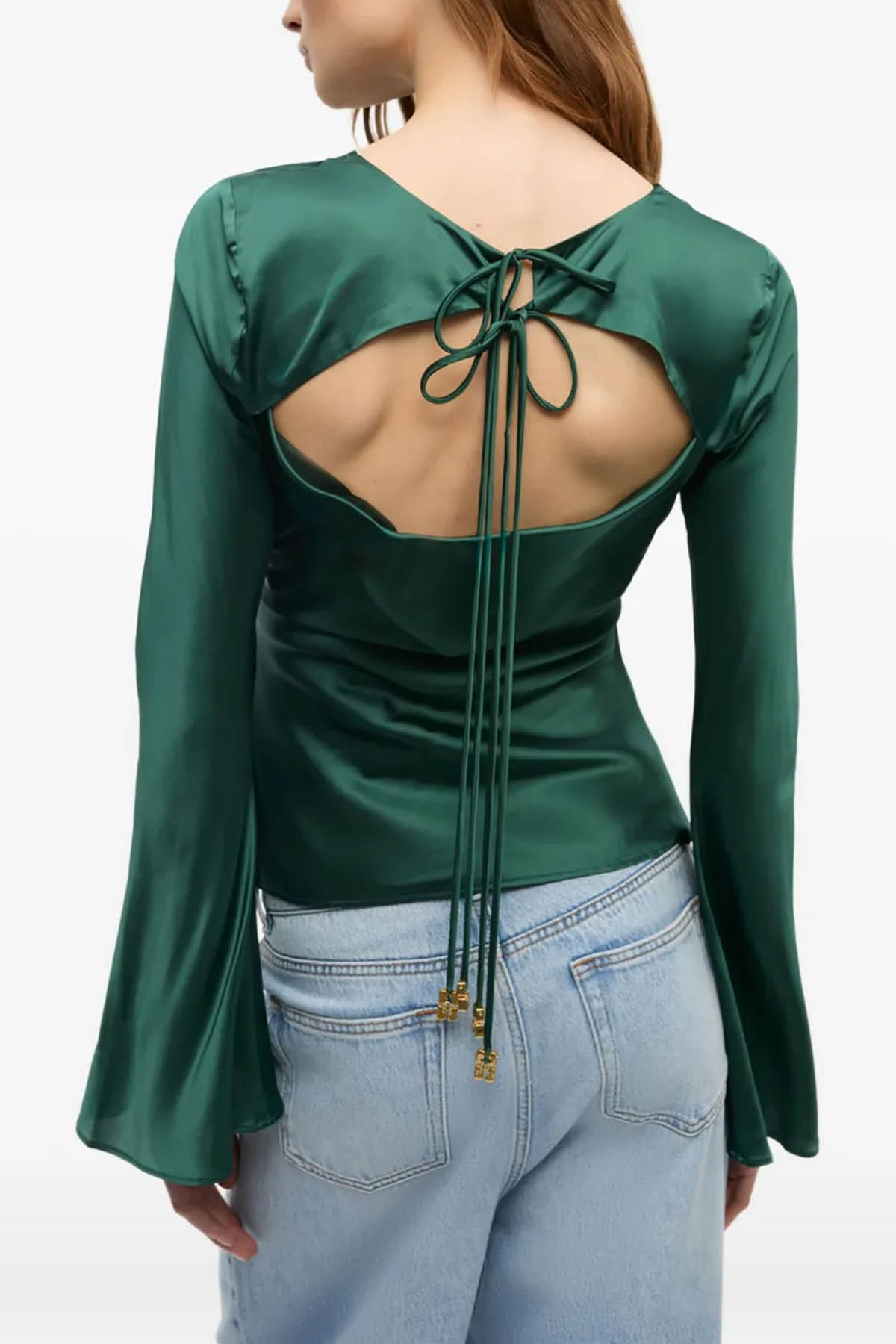 Featuring a tie-back closure, a crew neck, long sleeves, and flared cuffs.