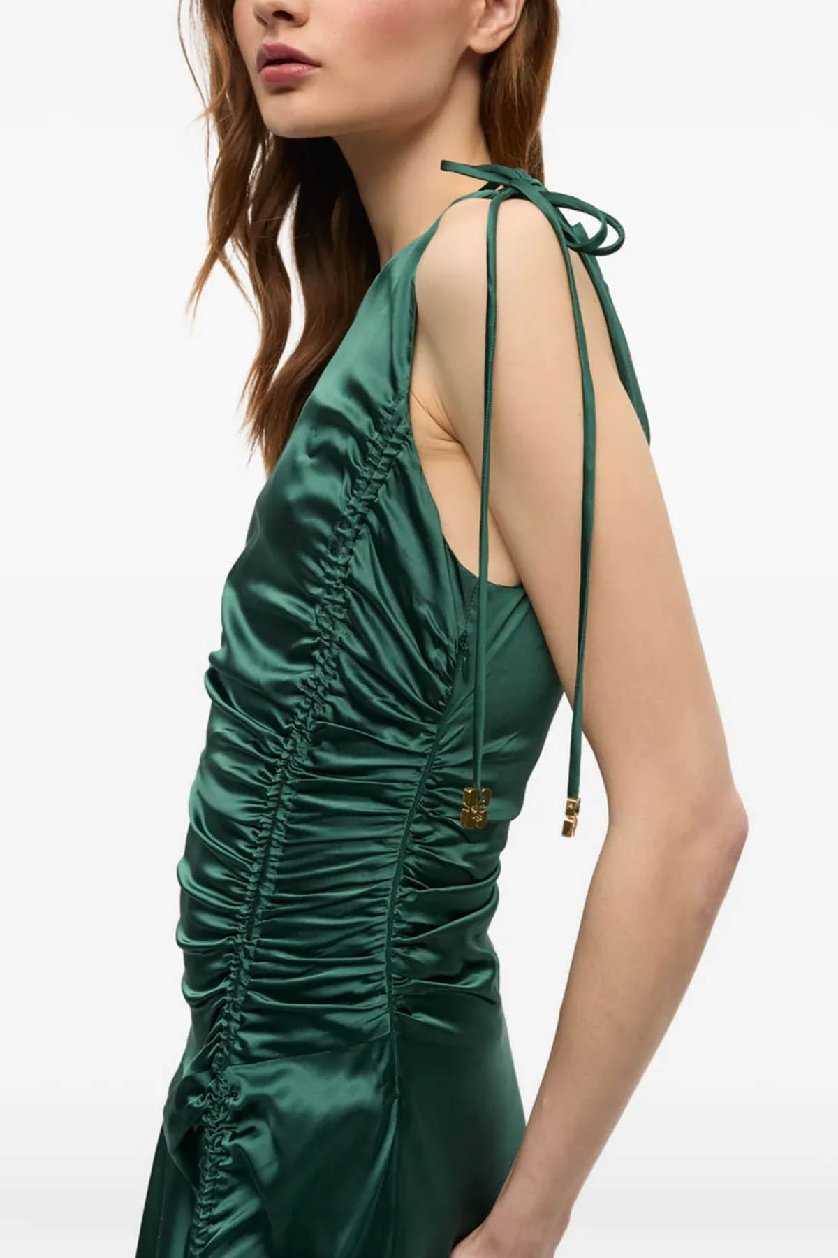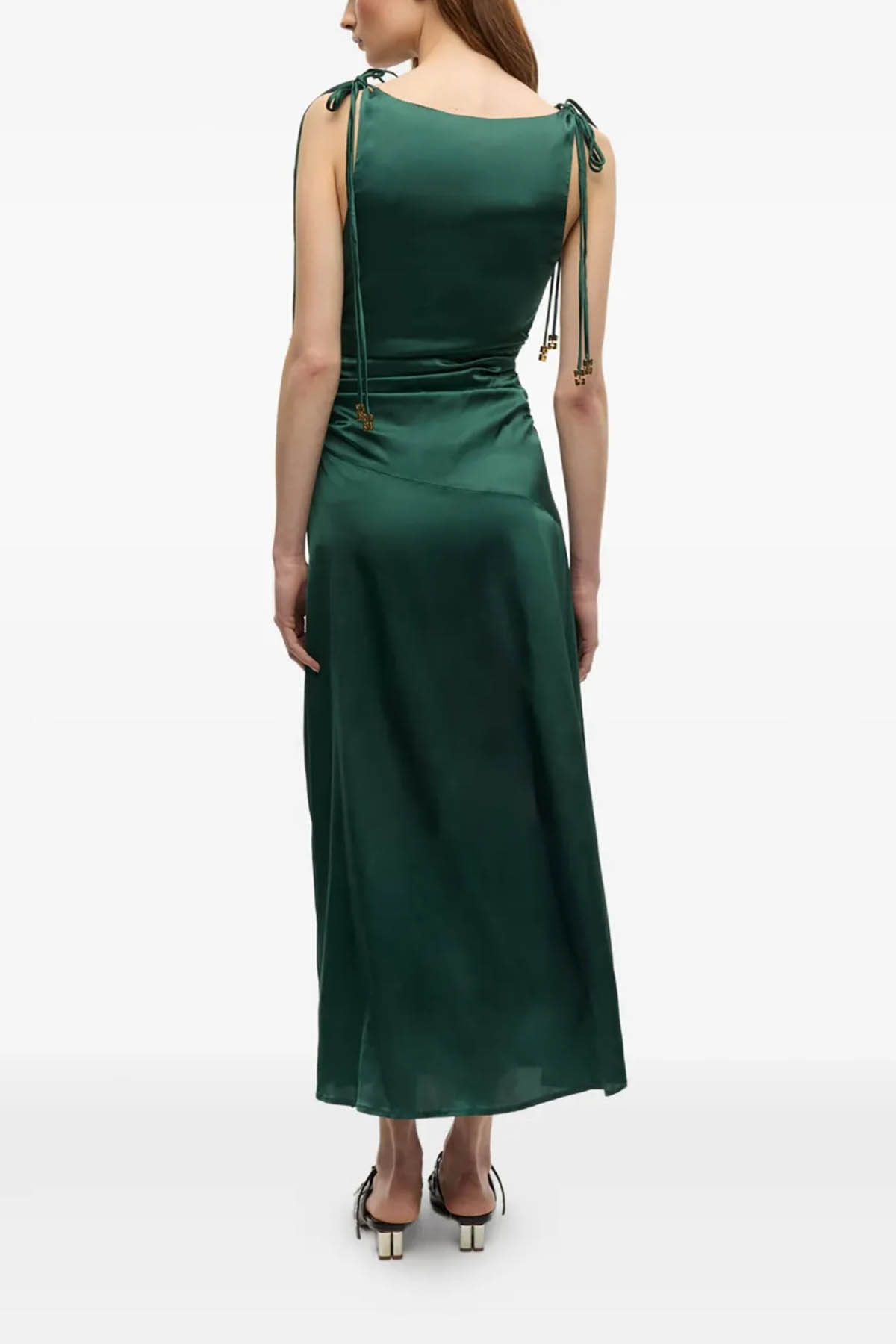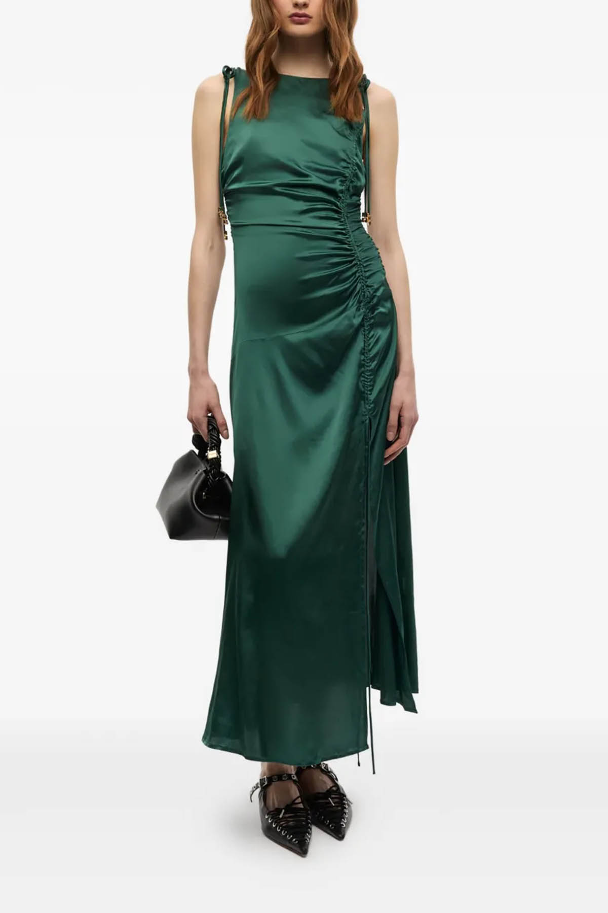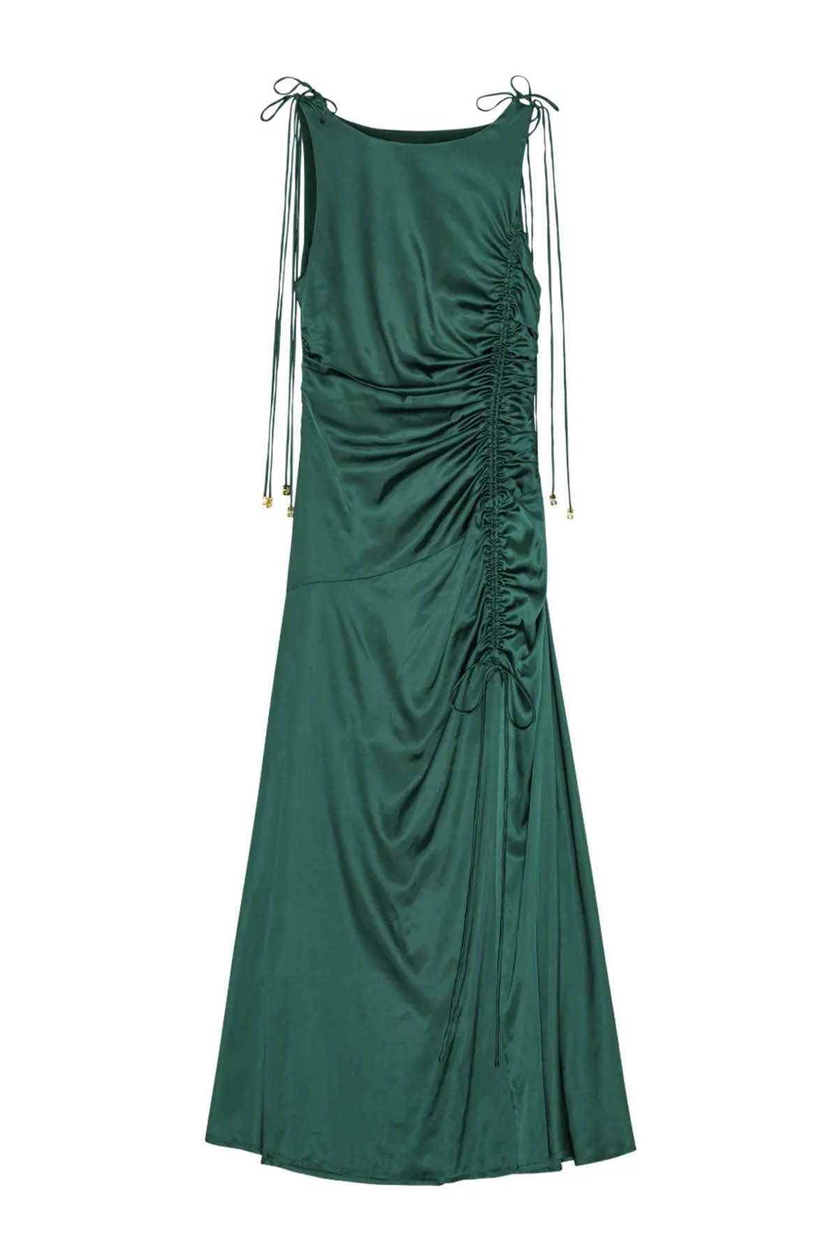 Featuring a drawstring closure, a round neckline, sleeveless, gathered detail, and a side slit.