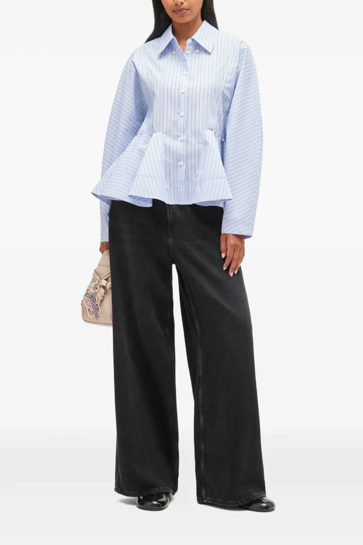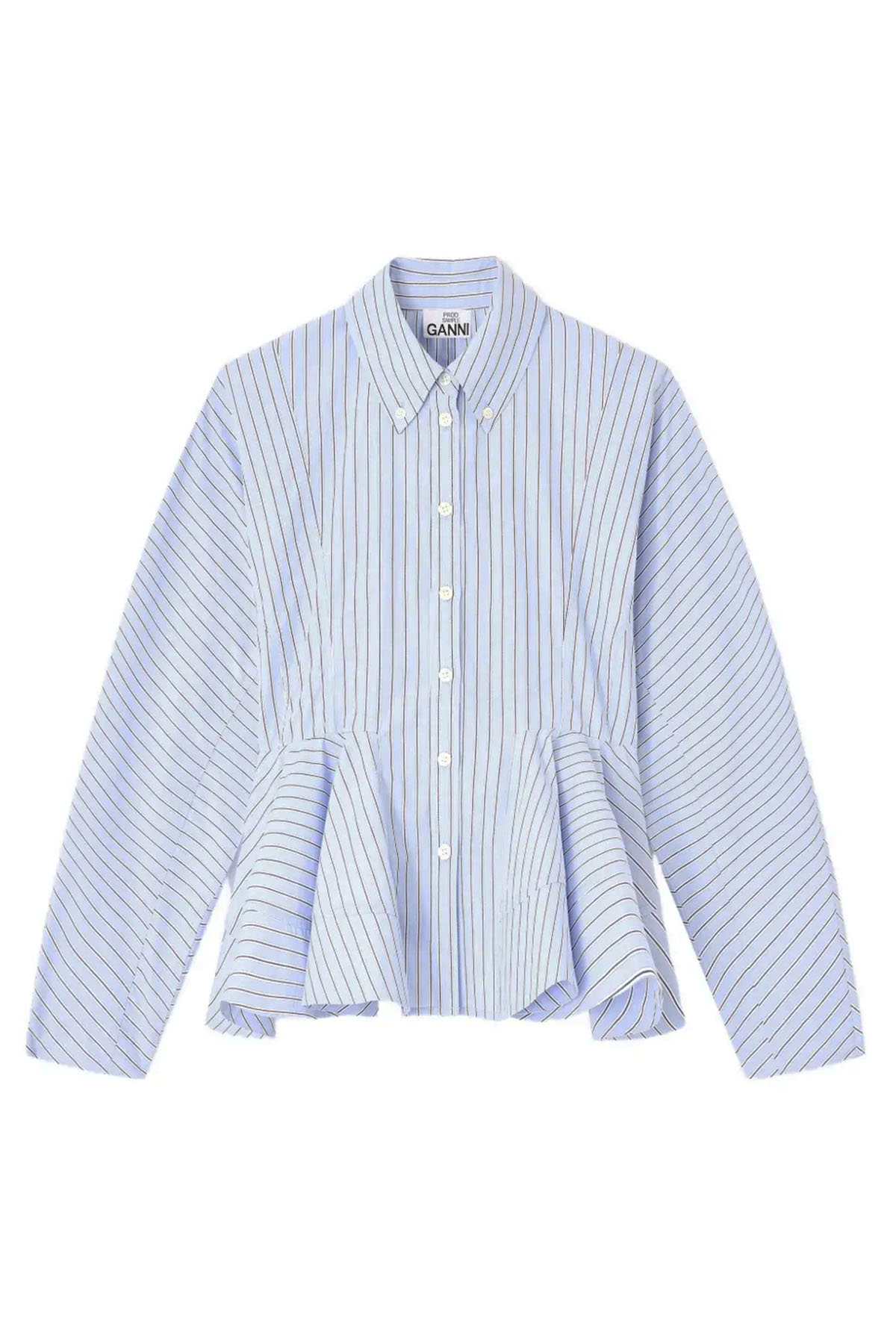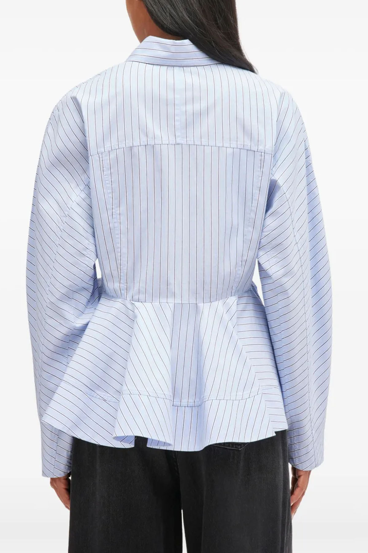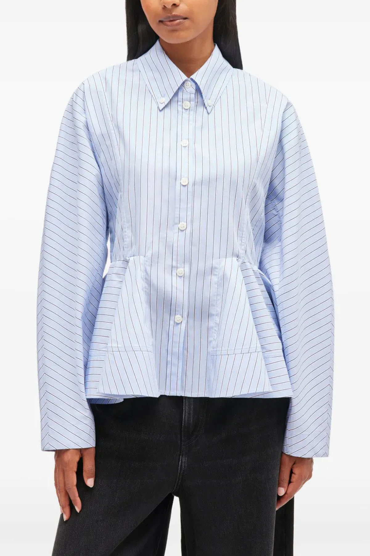 Light blue, pinstriped, peplum design, button closure, long sleeves, and collar.