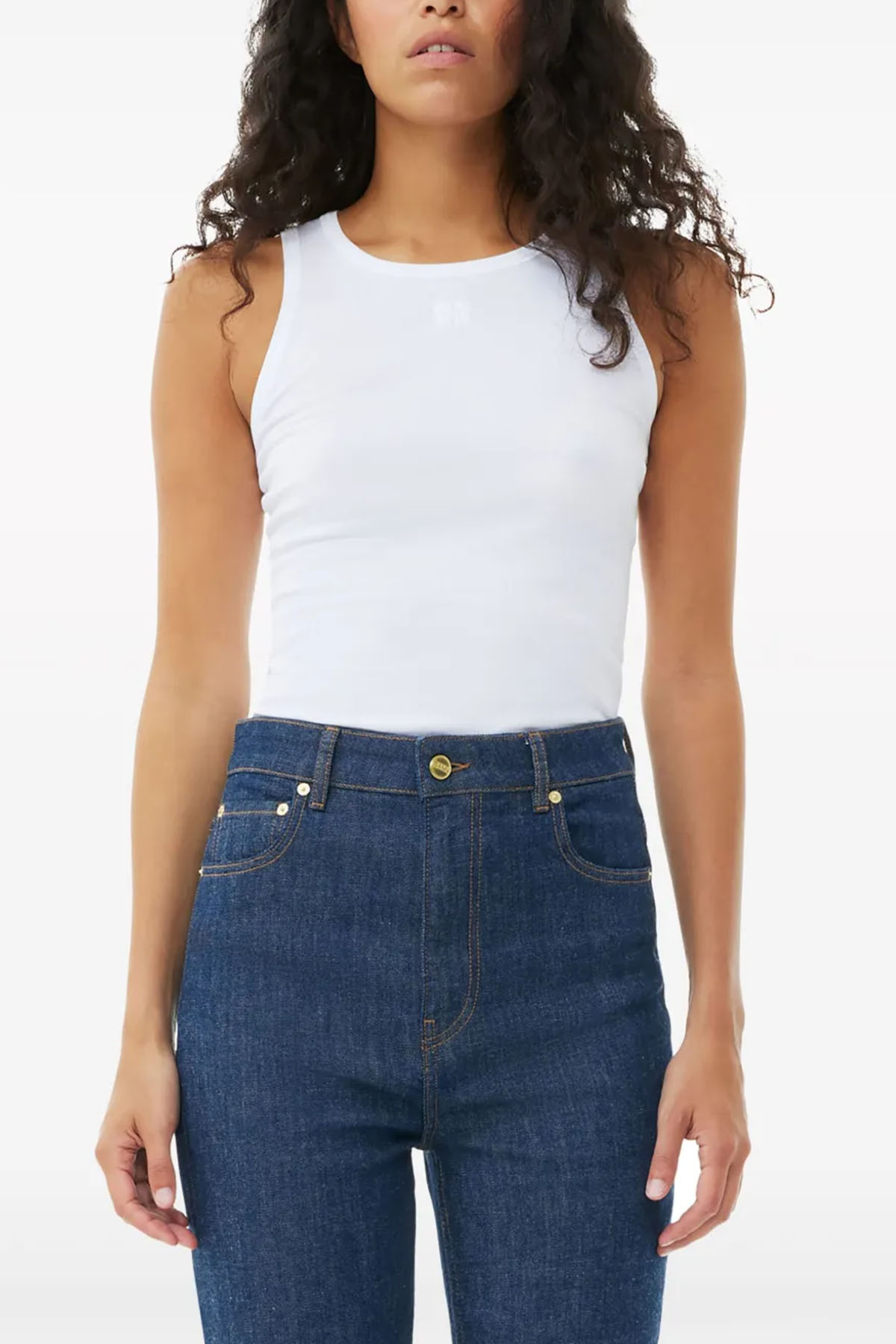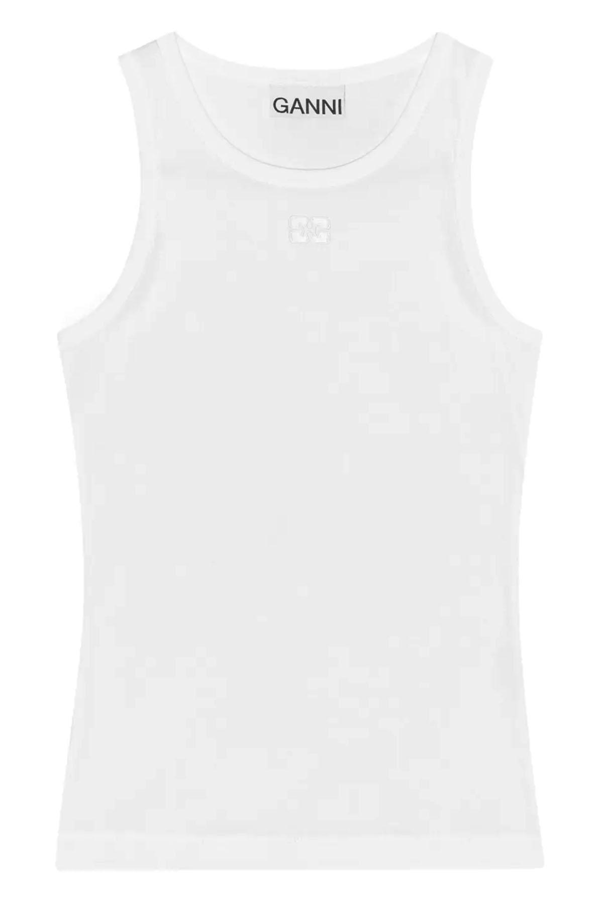 White, crew neck, sleeveless, ribbed knit, embroidered logo.