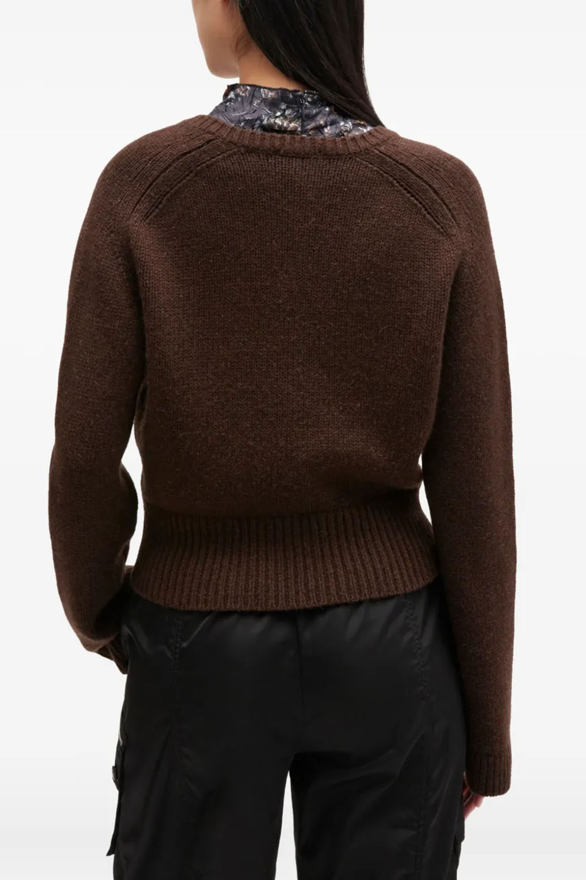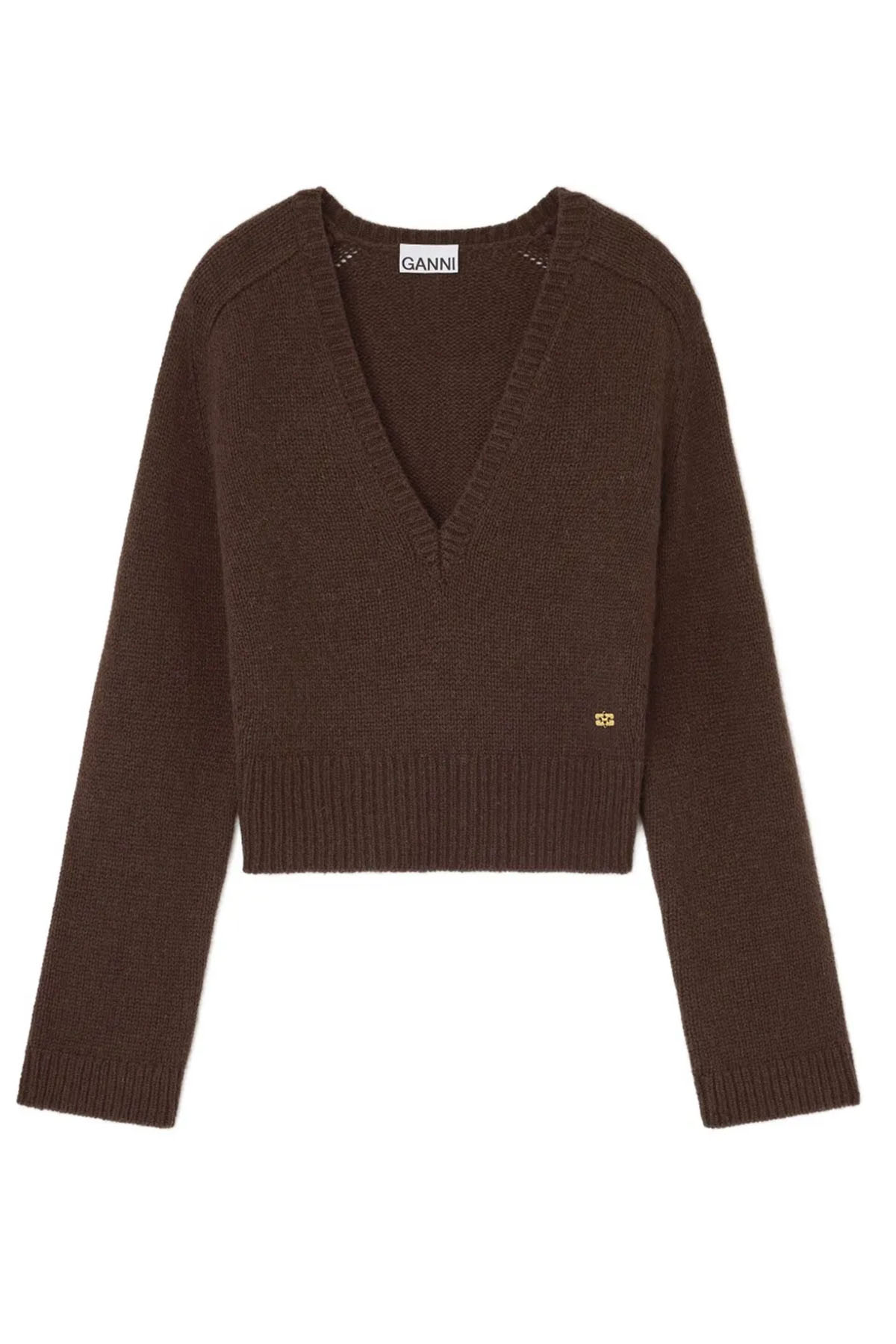 Brown model, deep V-neck, wide sleeves, cropped length, ribbed hem, gold logo detail.