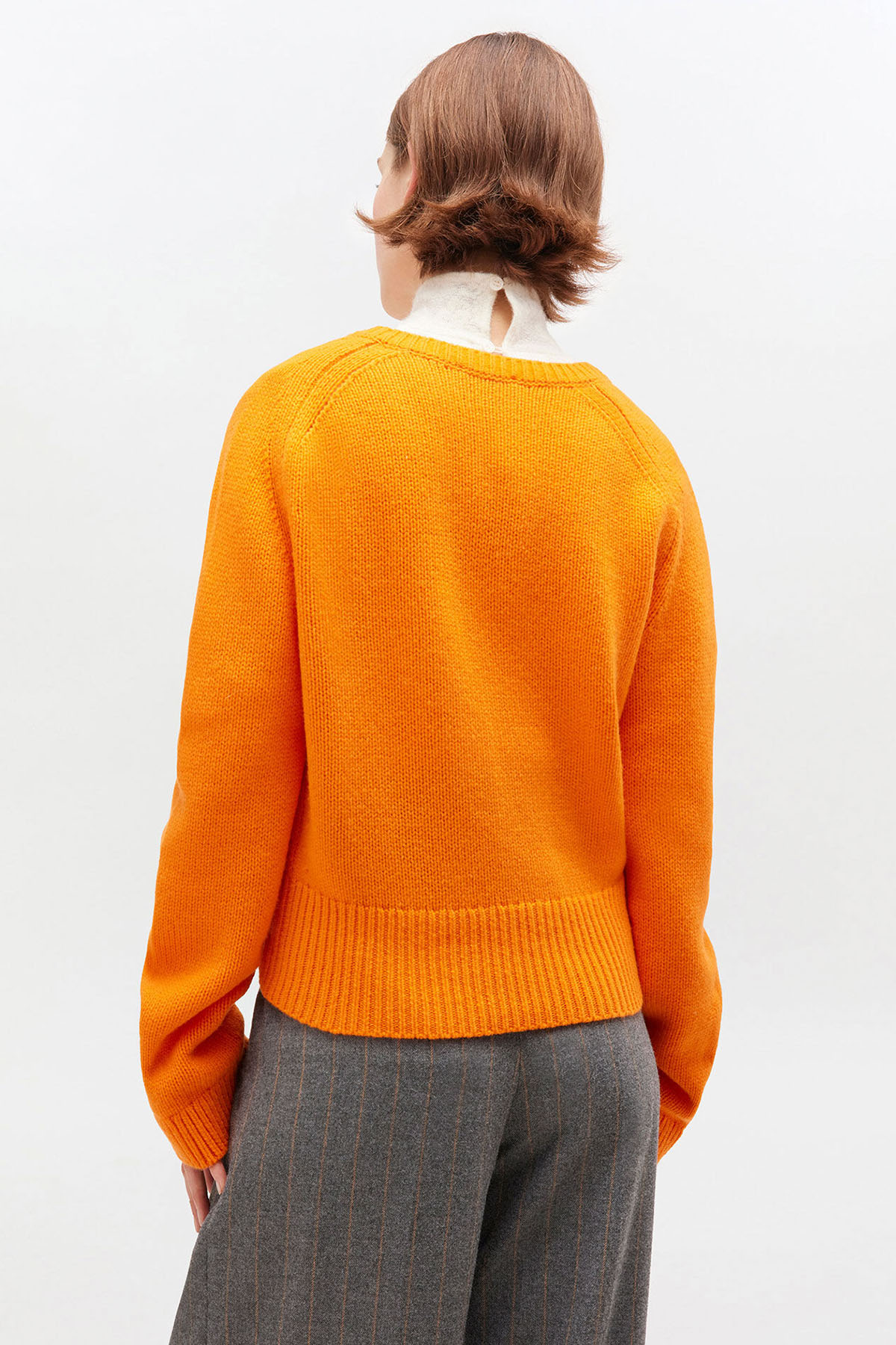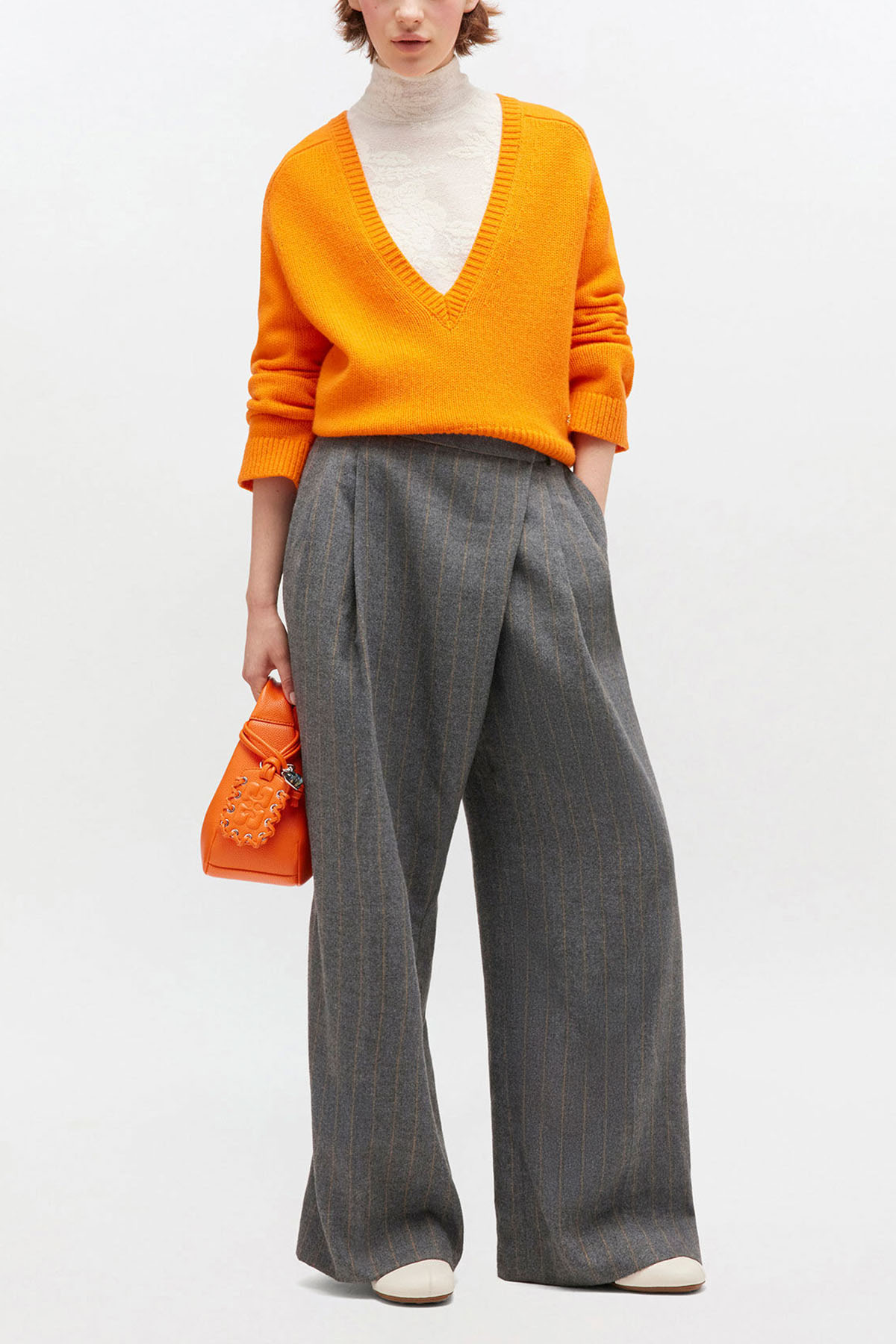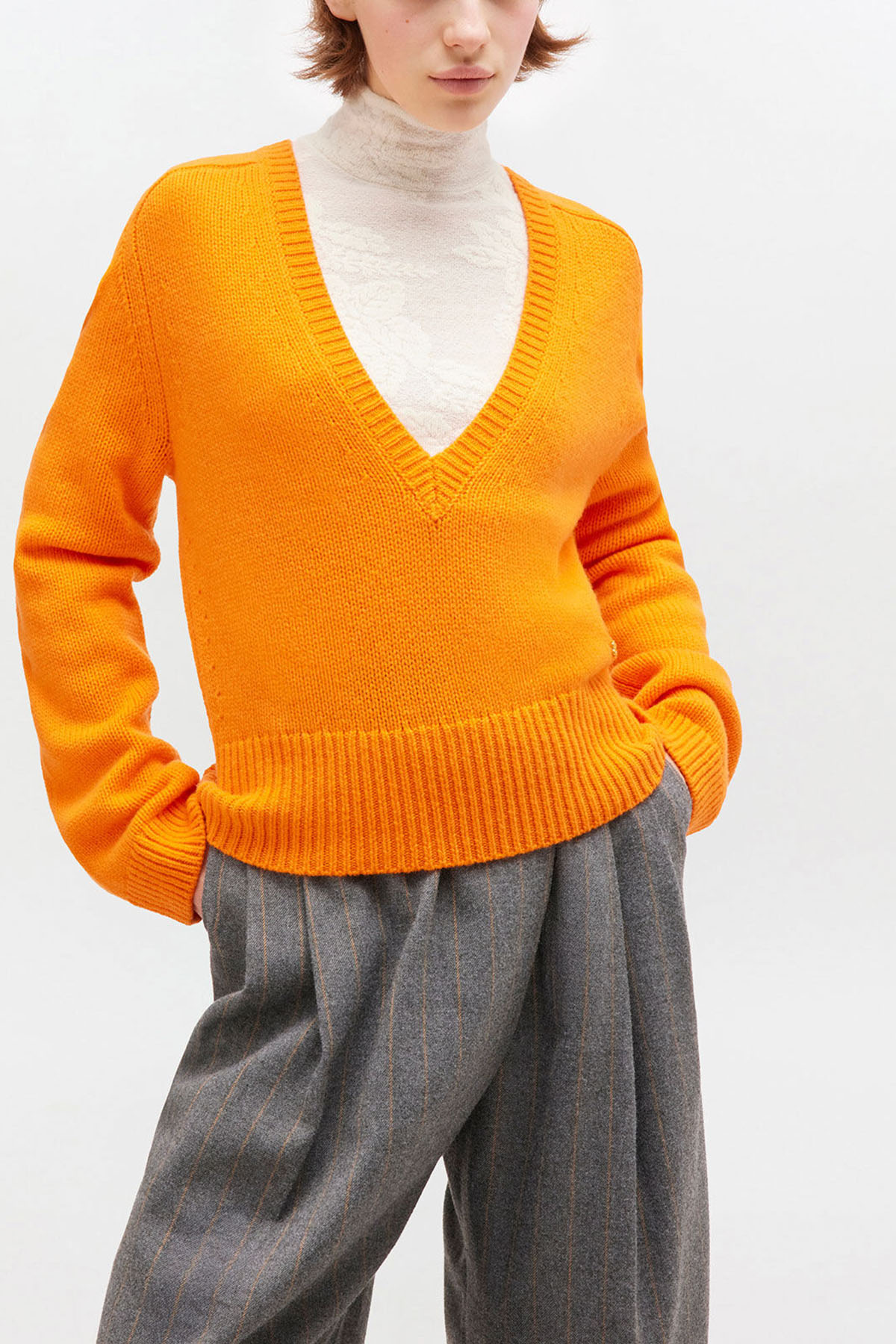 Brown model, deep V-neck, wide sleeves, cropped length, ribbed hem, gold logo detail.