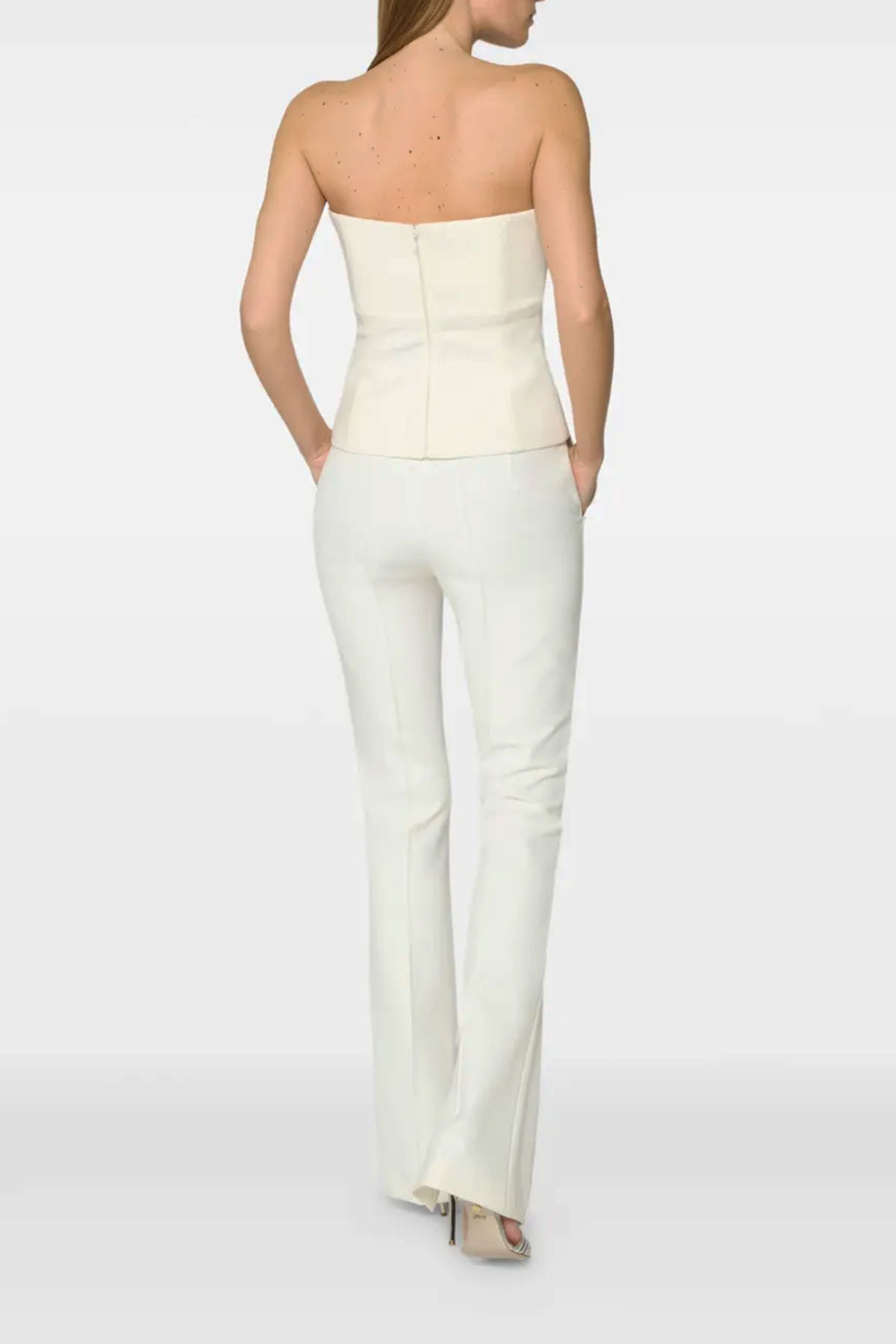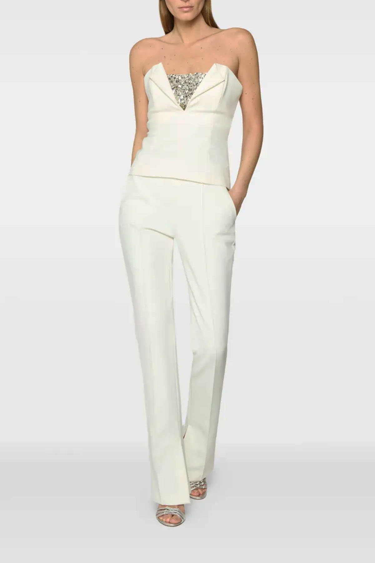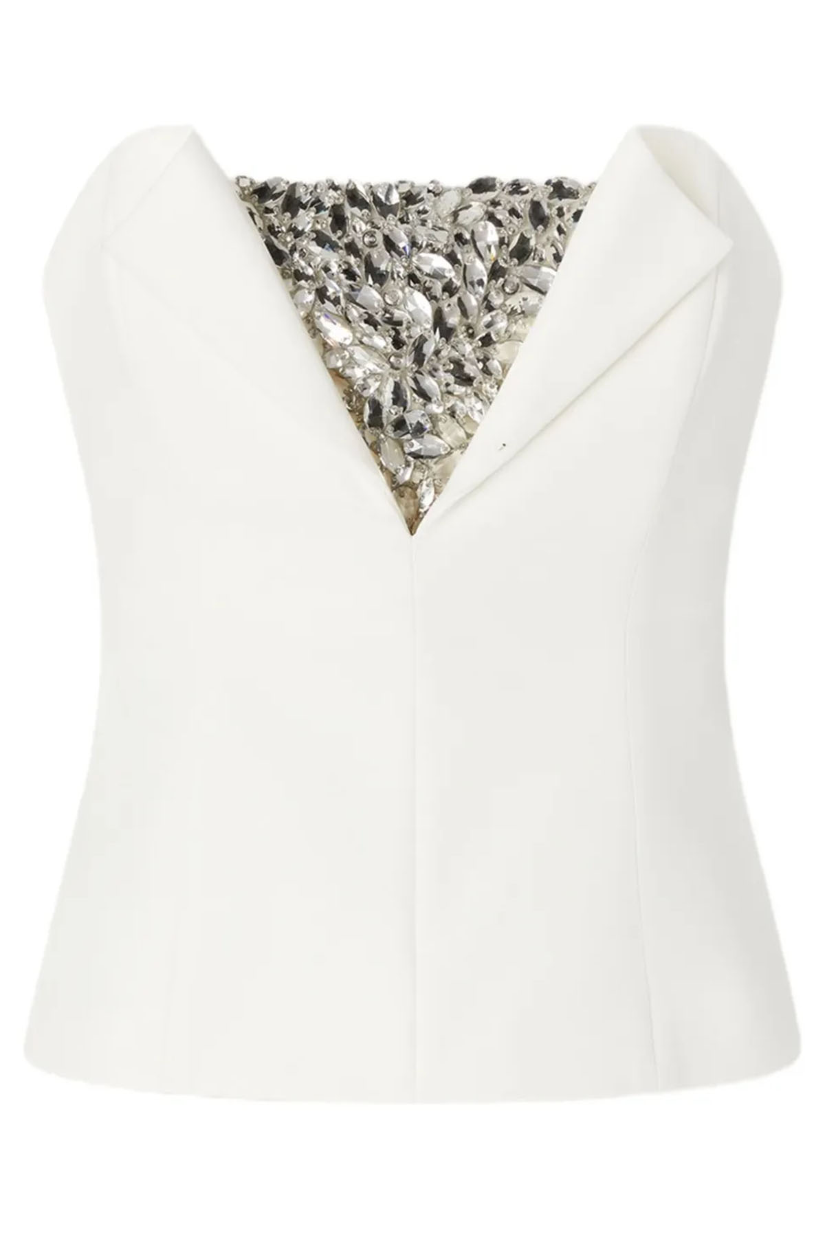 Bustier style, sweetheart neckline that opens to reveal a jewel-like embroidery of multi-shaped rhinestones, and back zip closure.