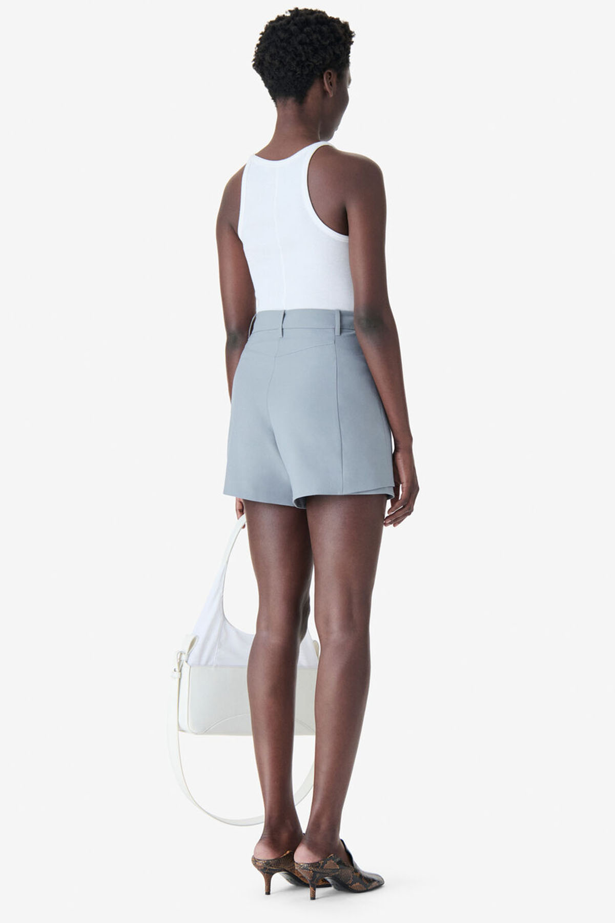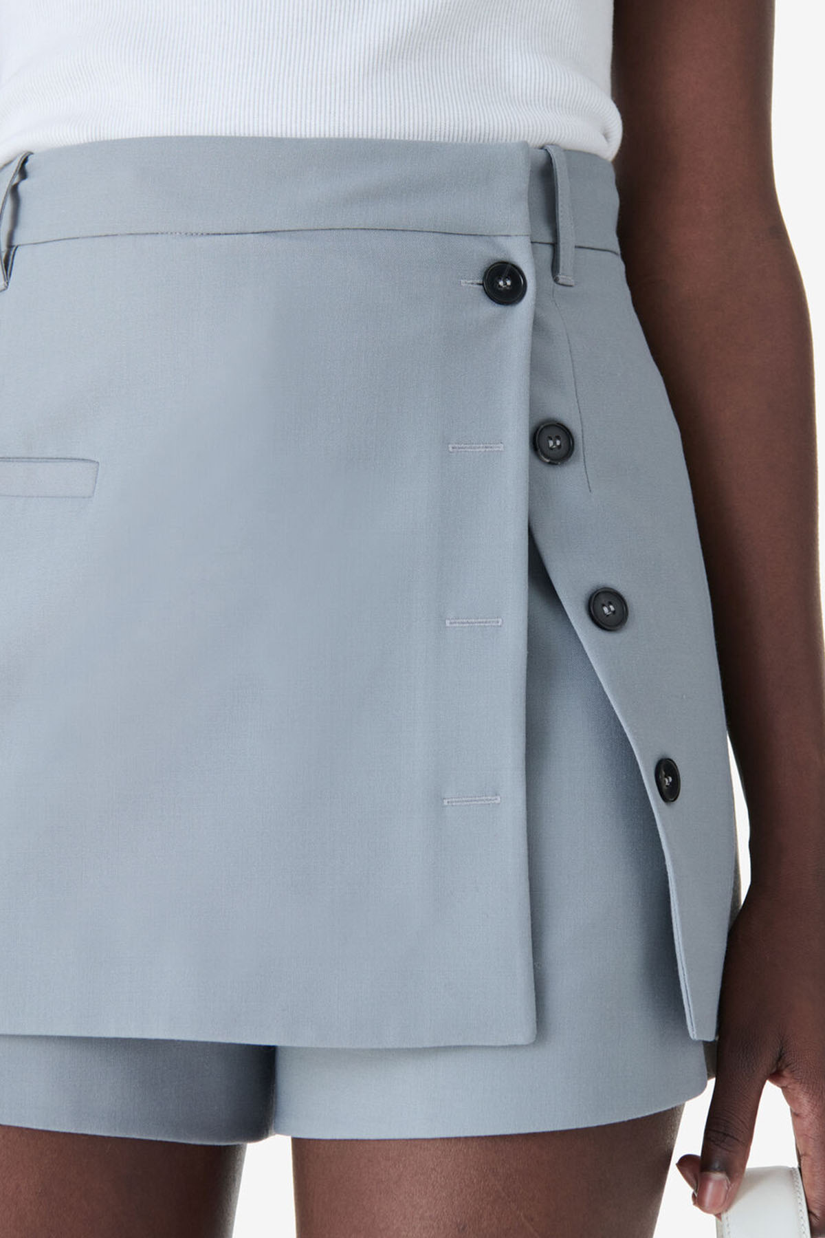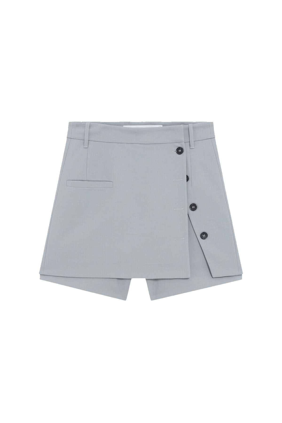 Tailored short skirt, Fitted fit, Structured high waist, Cross-front button placket, Exposed decorative buttons, Front welt pocket.