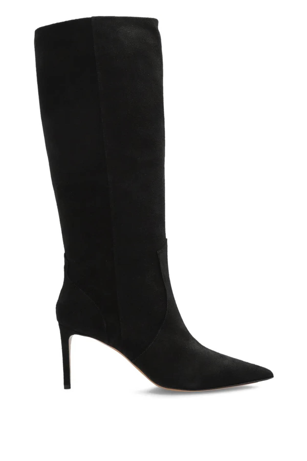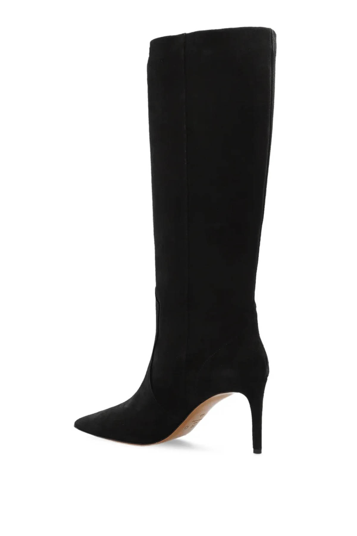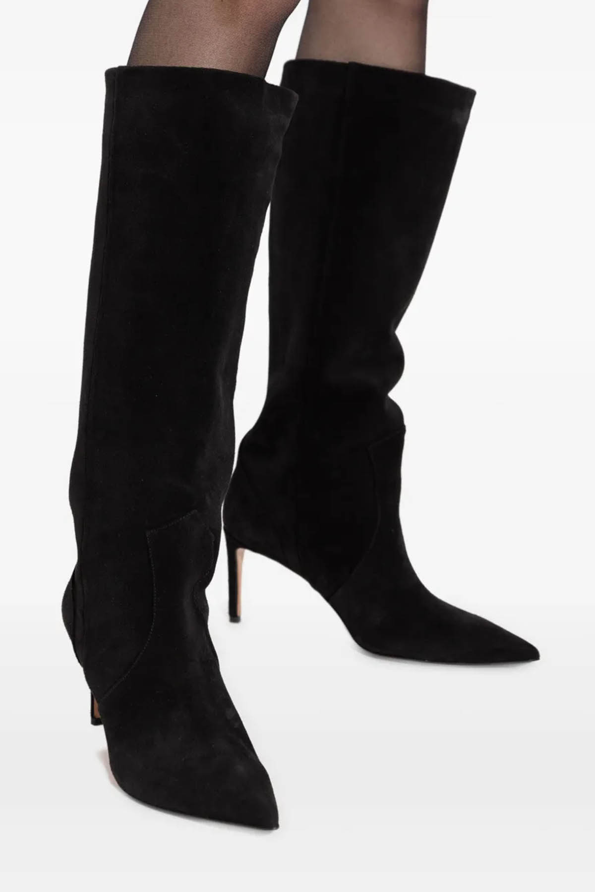 Patent leather model, pointed toe, elasticized side inserts, and logo insole.