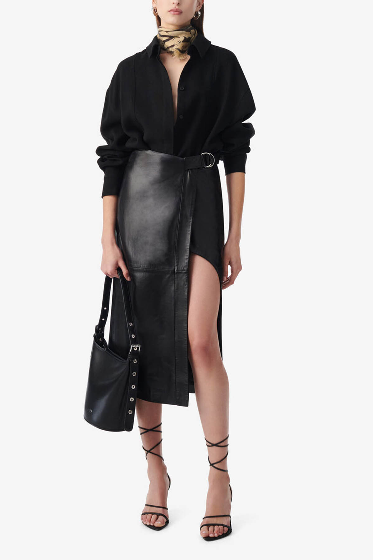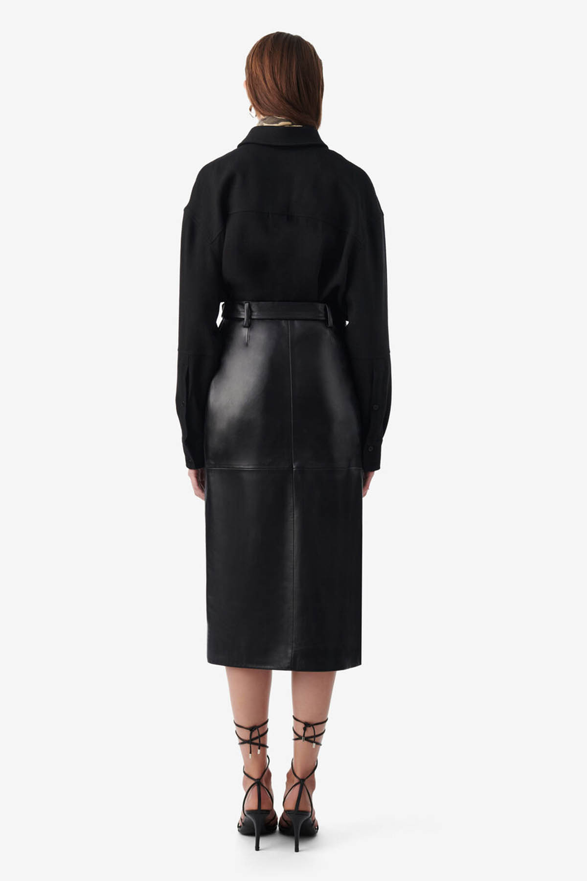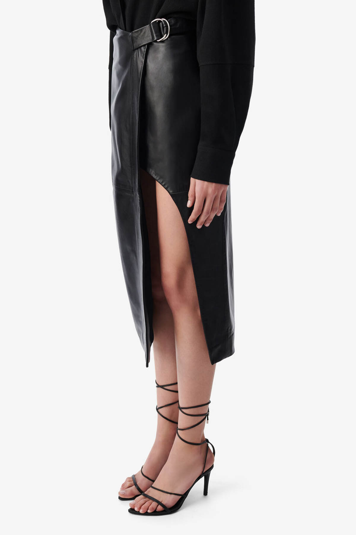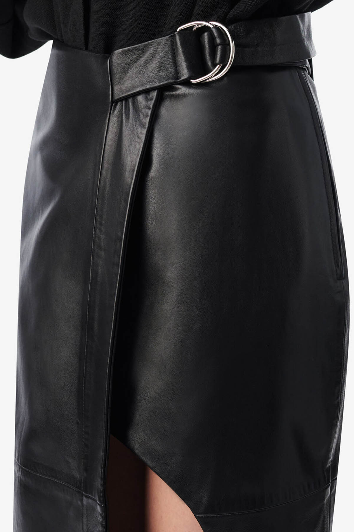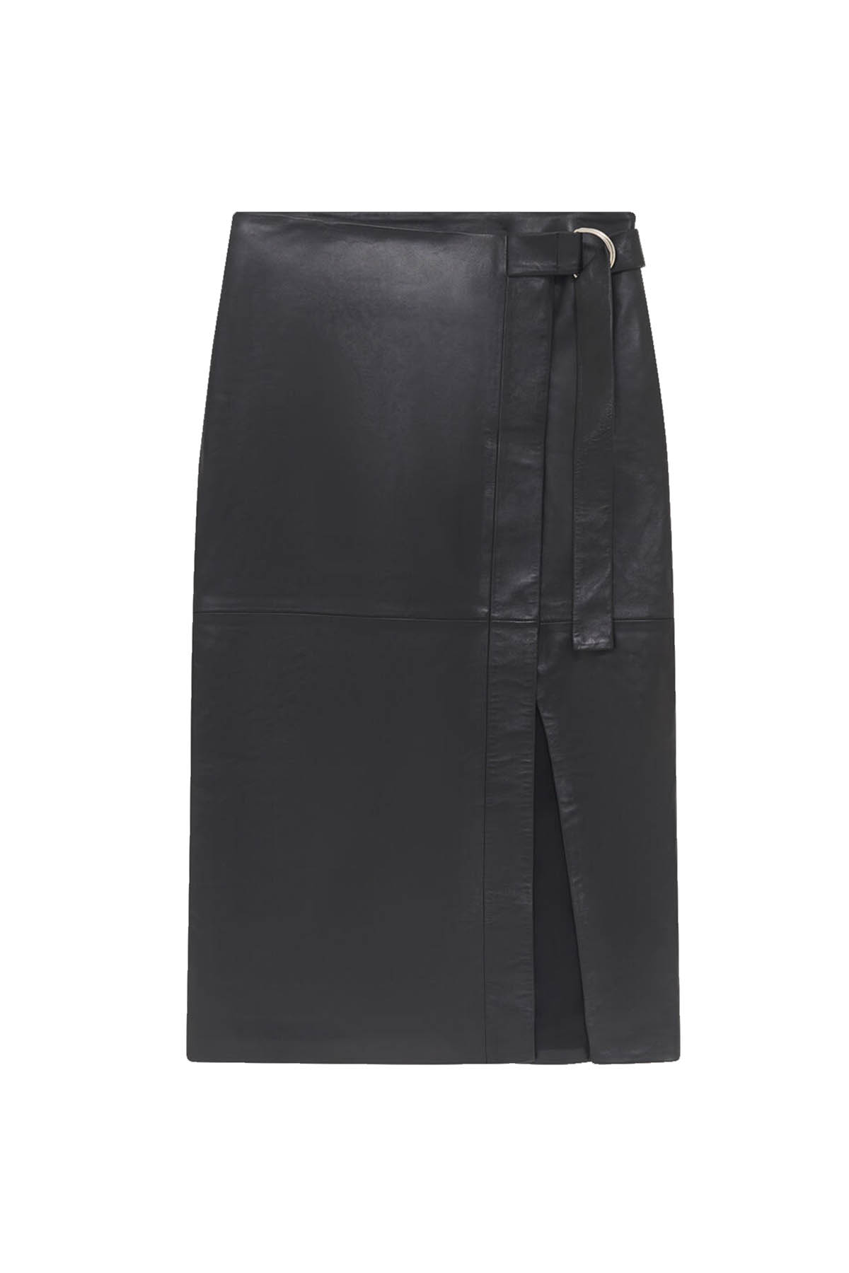 Leather style, adjustable belt with ring, straight and asymmetrical, slit, hidden zip closure, mid-length design.