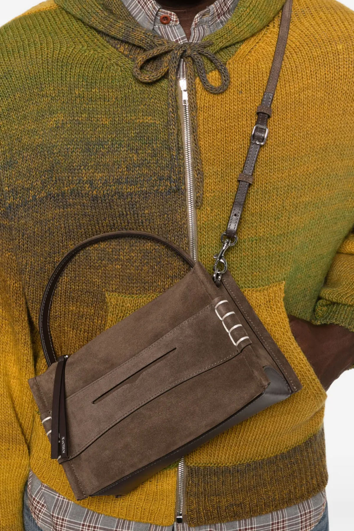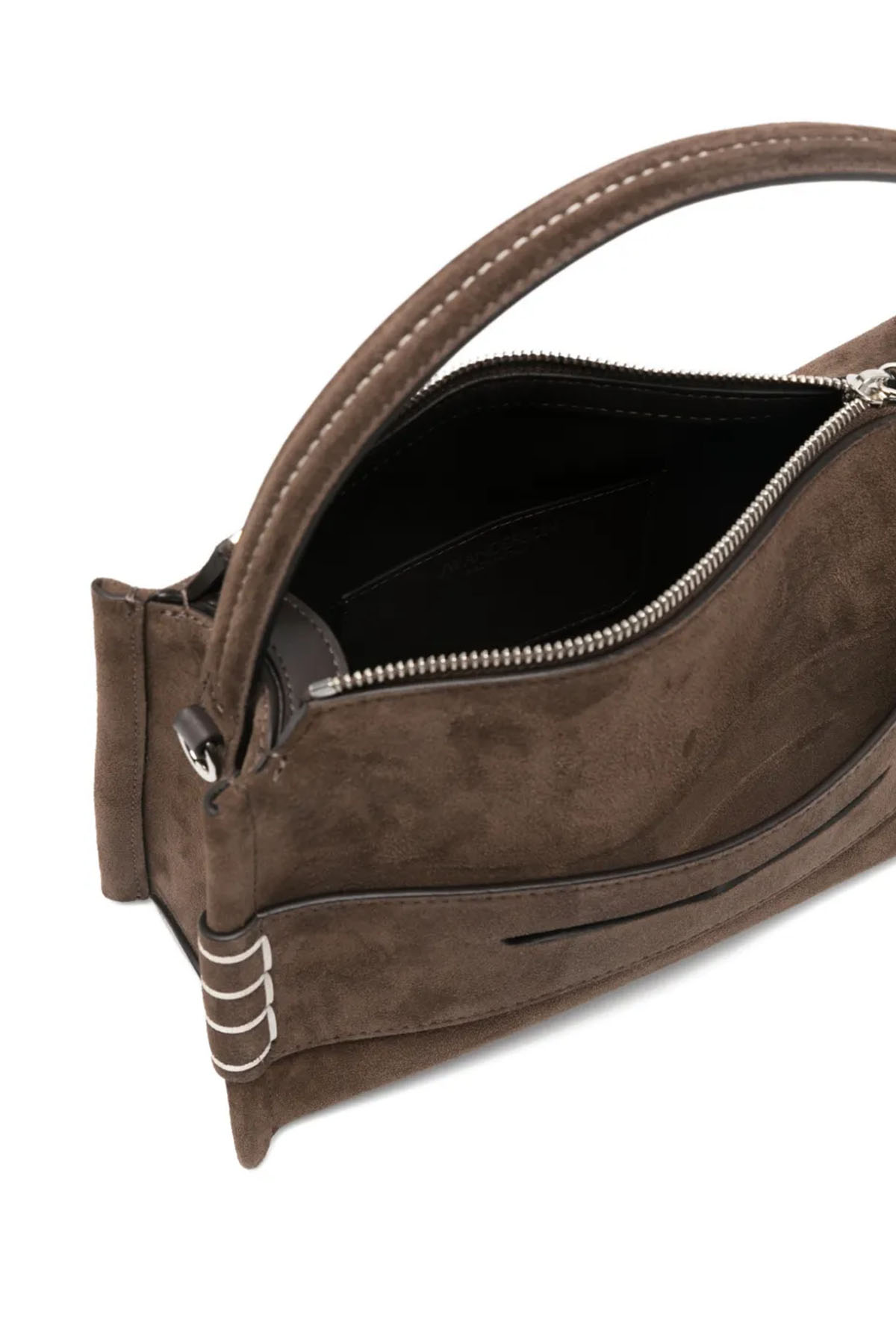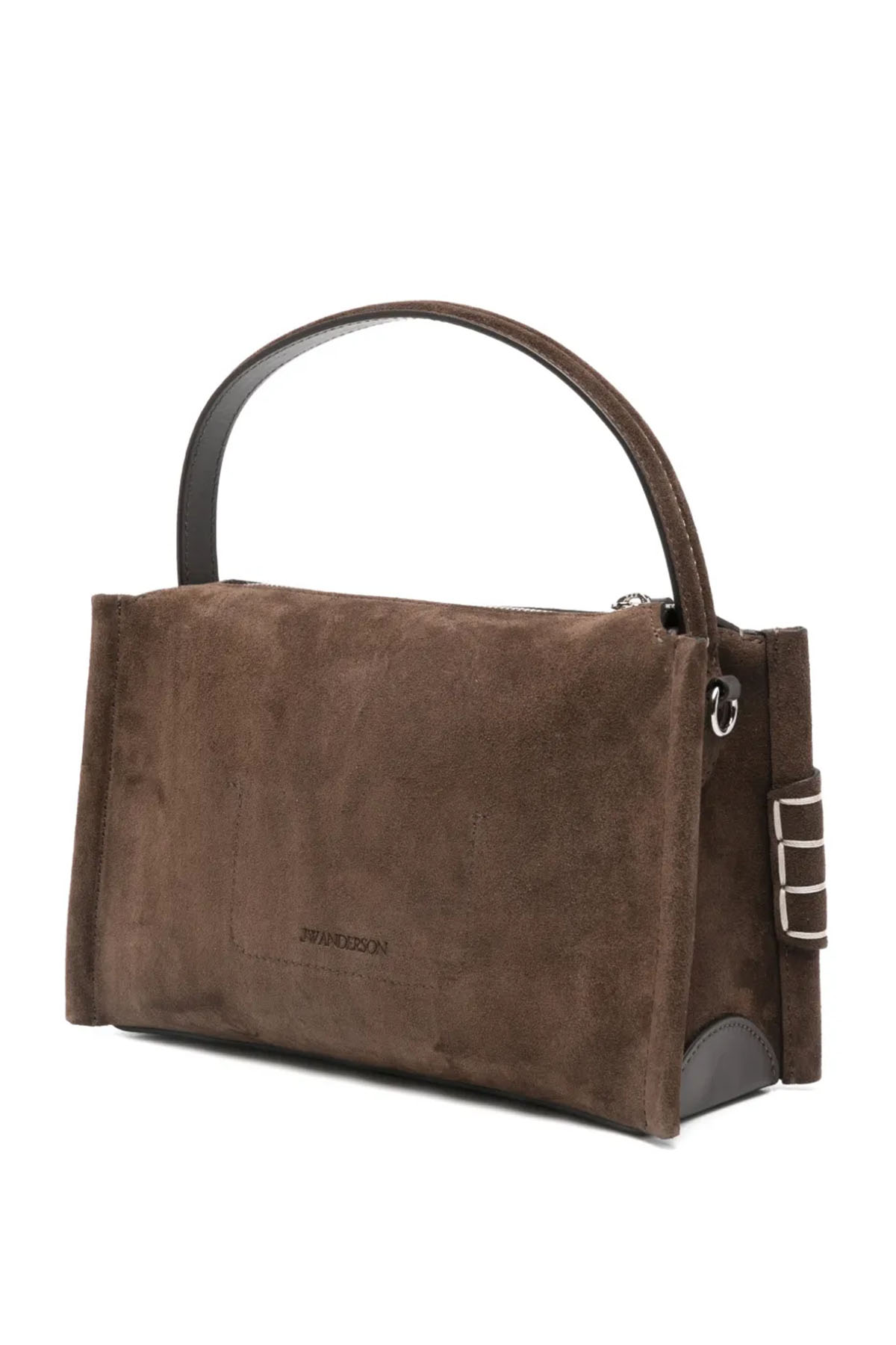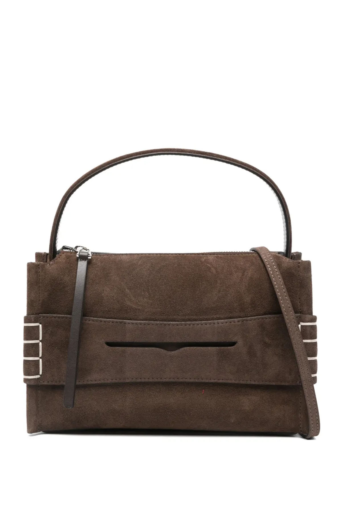Top handle, calf suede, silver-tone details, zip closure, adjustable and removable shoulder strap, and gusseted pocket. Unisex.