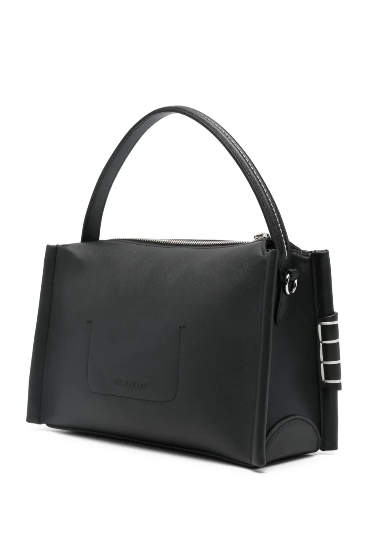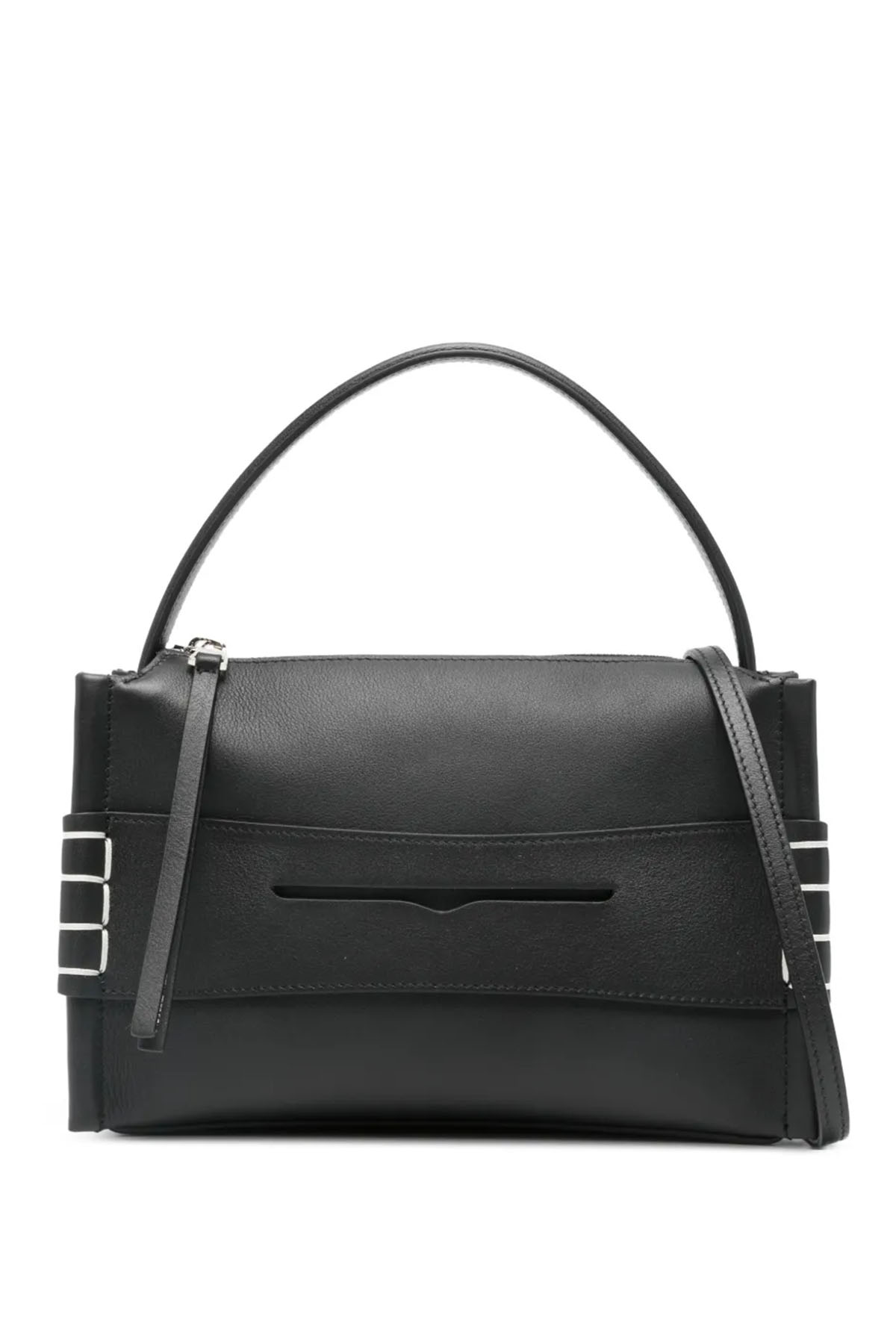 Handle model, black, removable and adjustable shoulder strap, top zip closure, internal pocket, silver hardware.