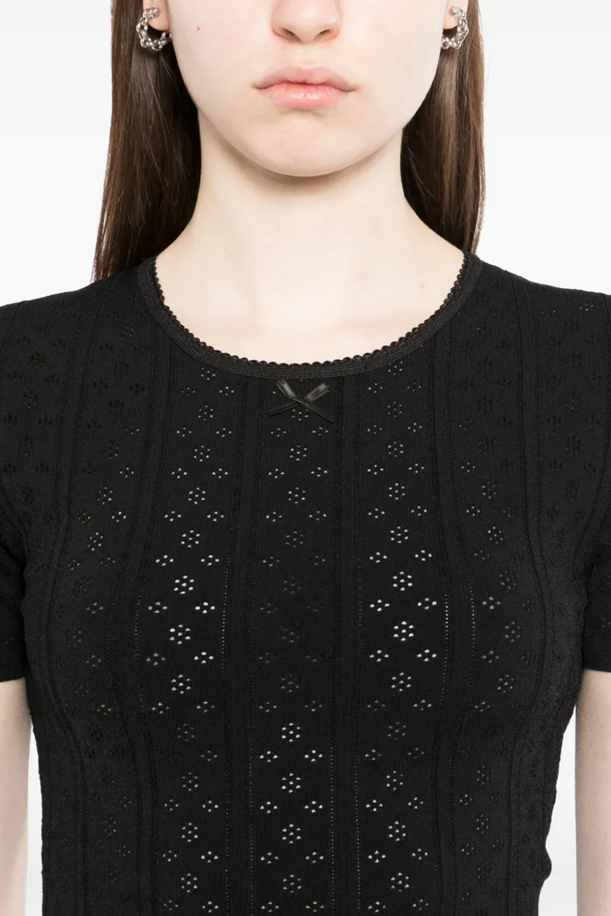 Crew neck, short sleeves, pointelle knit, bow detail, ribbed trim.