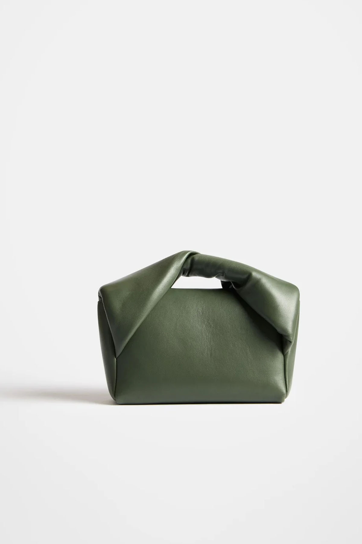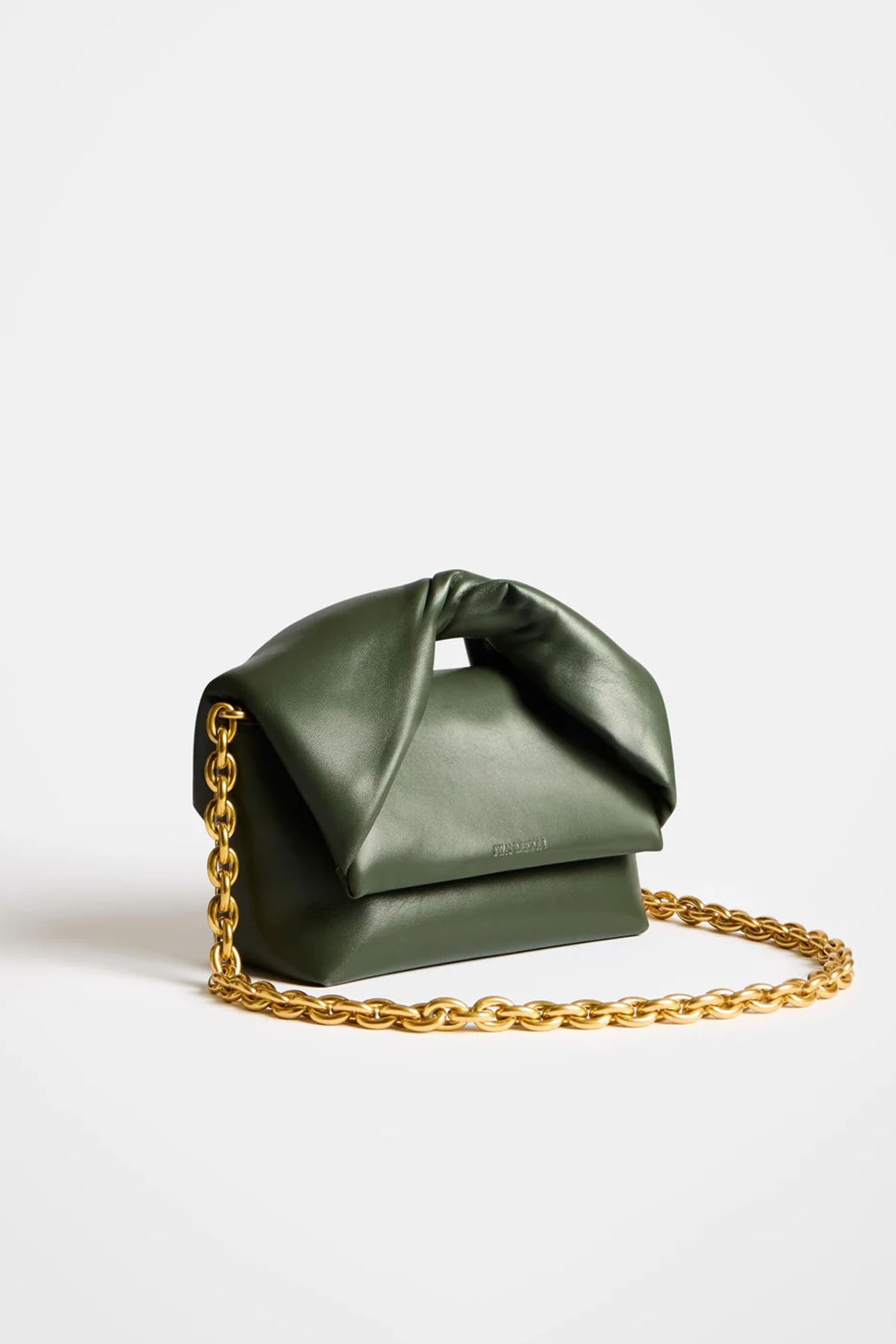 Medium Twister bag in soft khaki nappa leather, featuring a short braided bow handle and a removable shoulder strap with an antiqued gold-finish chain. It also features a magnetic flap closure and a gold-tone embossed logo and details.