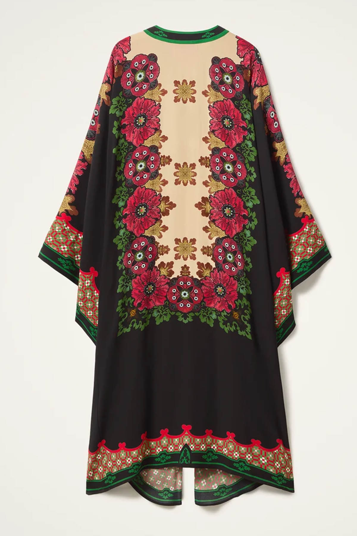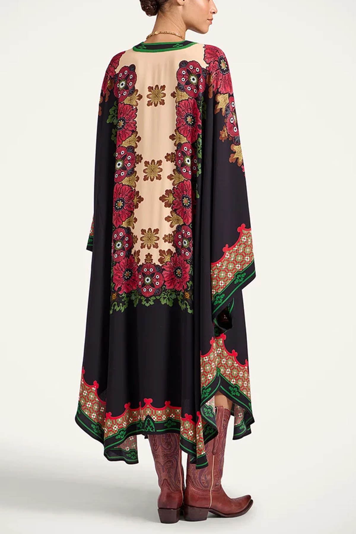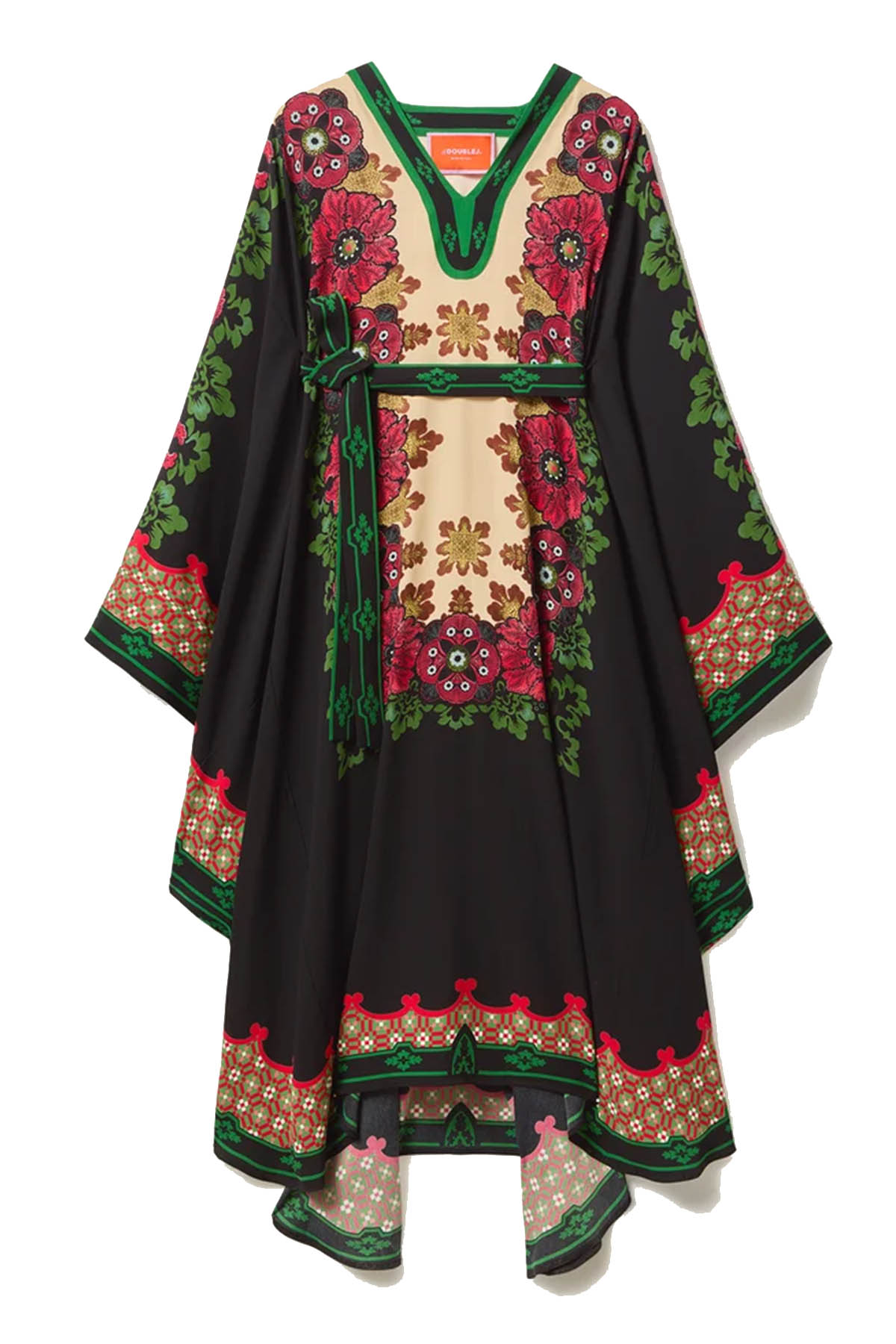 Kaftan style, V-neck, removable and adjustable belt, two front buttonholes, wide sleeves, asymmetrical hem, voluminous, mid-length design.